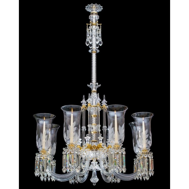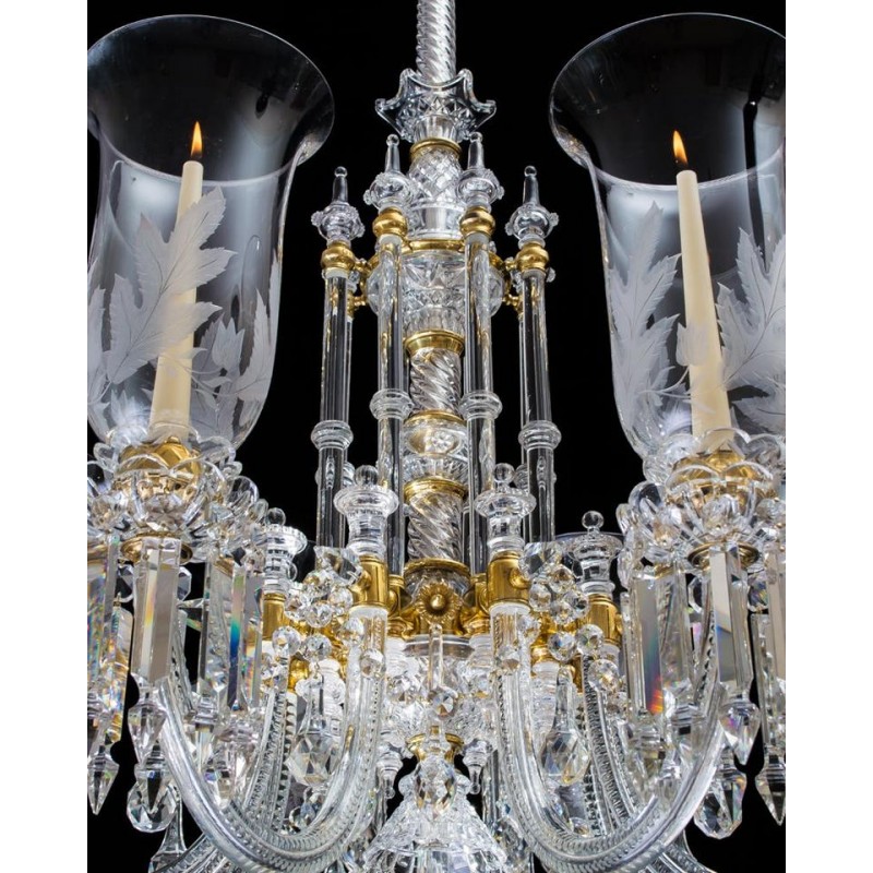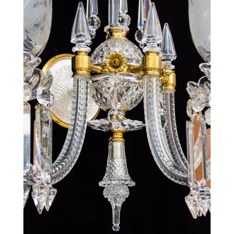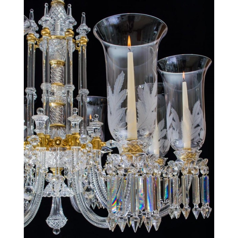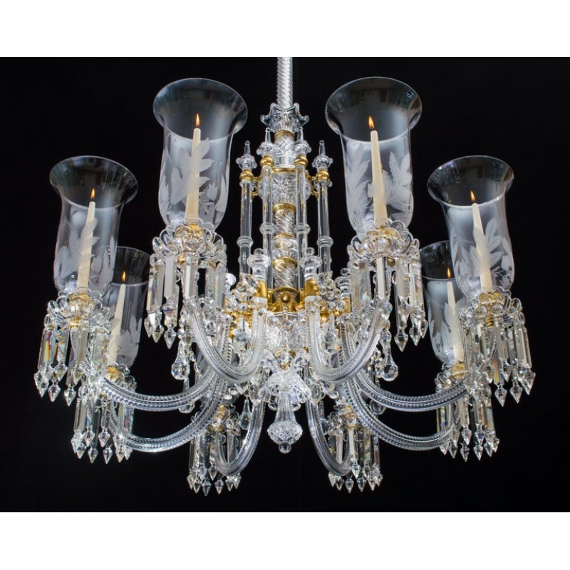 An exceptional eight-light gilt bronze mounted cut glass chandelier, the slender stem of rope twist tube having a upper cart wheel suspending six tulip shaped faceted drops, the main ring with flower rosettes issuing eight notch cut J arms supporting drop hung scalloped drip pans and storm shades, these shades finely engraved with floral pattern. The main ring also issuing eight cylindrical poles mounted either end by wasted finials applied with raspberry punts, the chandelier hung with Albert drops, tulip drops and swaged with half back spangles, the chandelier terminating with flat diamond cut finial.