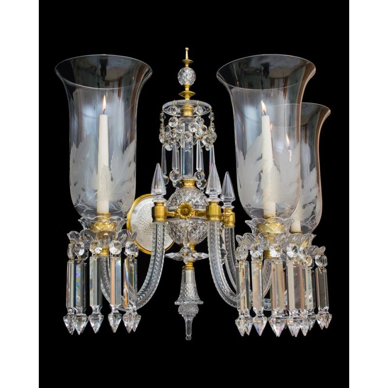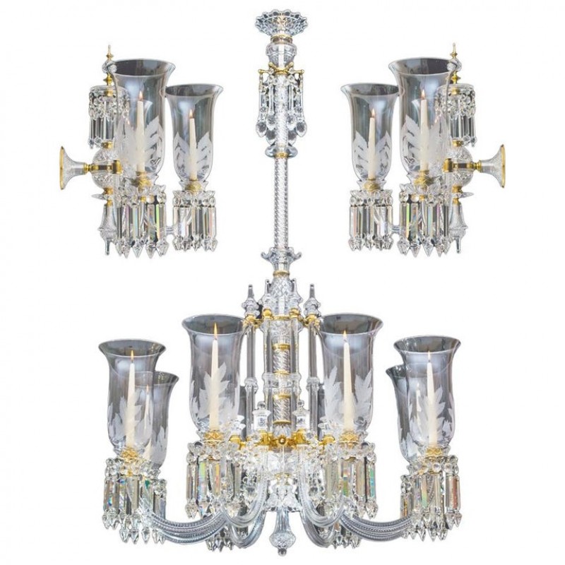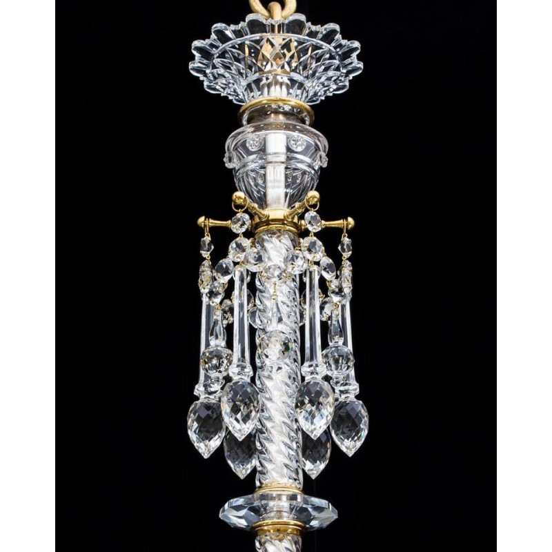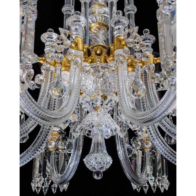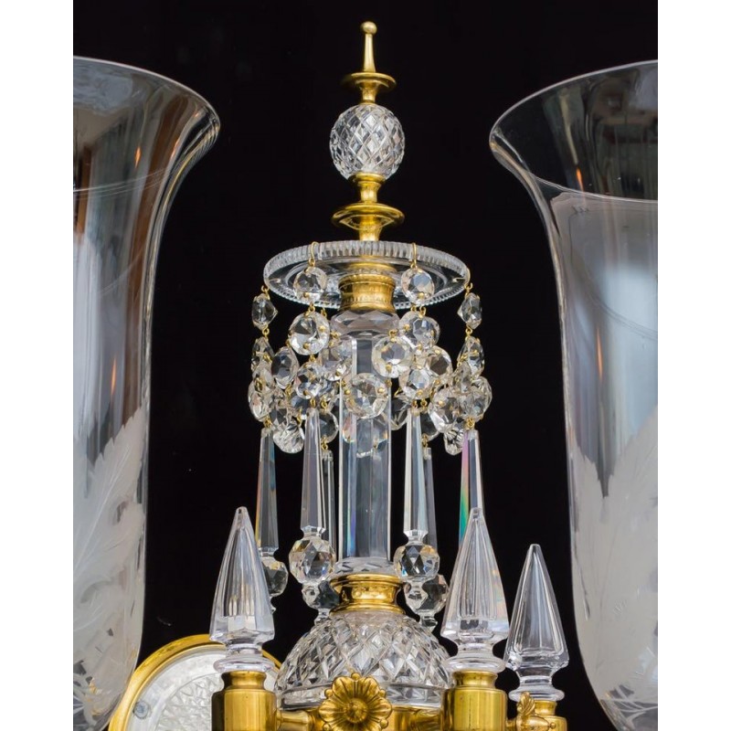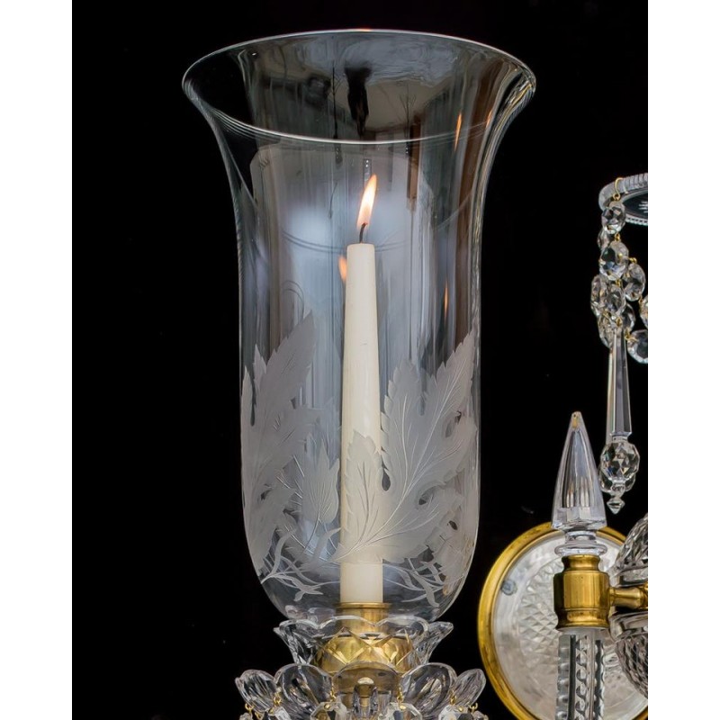An exceptional eight-light gilt bronze mounted cut glass chandelier, the slender stem of rope twist tube having a upper cart wheel suspending six tulip shaped faceted drops, the main ring with flower rosettes issuing eight notch cut J arms supporting drop hung scalloped drip pans and storm shades, these shades finely engraved with floral pattern. The main ring also issuing eight cylindrical poles mounted either end by wasted finials applied with raspberry punts, the chandelier hung with Albert drops, tulip drops and swaged with half back spangles, the chandelier terminating with flat diamond cut finial.