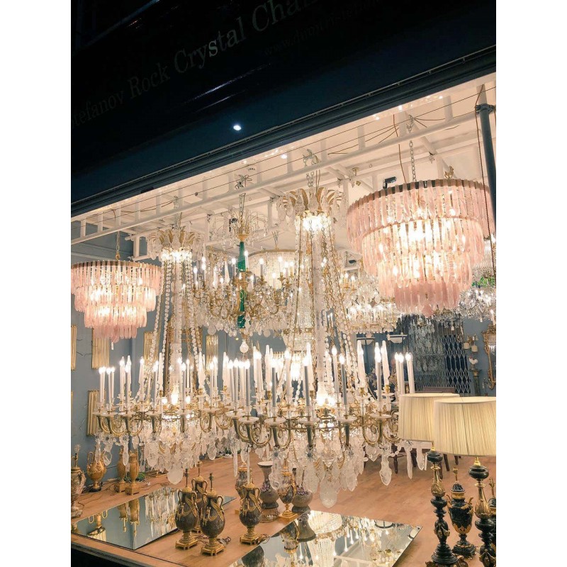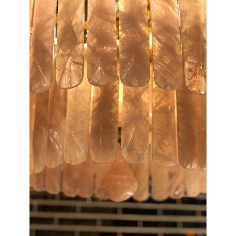 A beautiful rose quartz chandelier comprising 4 cascading bronze circular tiers, each profusely hung with 175 individually hand carved rose quartz crystal drops. A spectacular solid rose quartz saucer is inset in the lower bronze ring with a large rose quartz hand carved pear beneath to add a finishing flourish to terminate this elegant piece. The 28 lights allow the beauty of the rose color to radiate out of this unusual and unique creation. At Alan Mizrahi Lighting Design, we supply and manufacture many highly sought after designer pieces. All Chandeliers can be customized by number of lights, style, color and size to meet your specific needs.