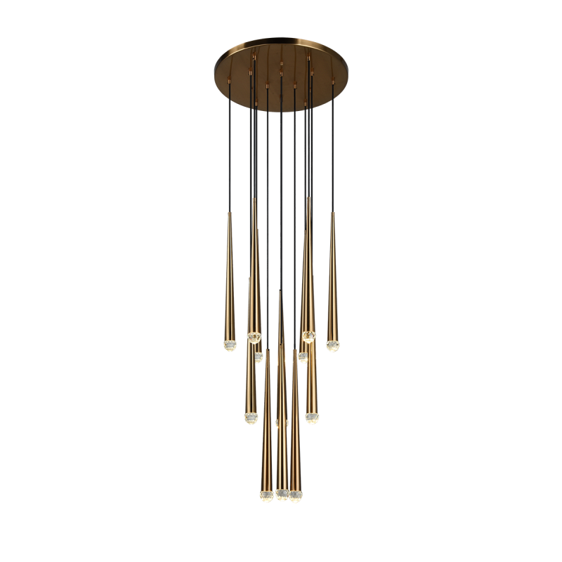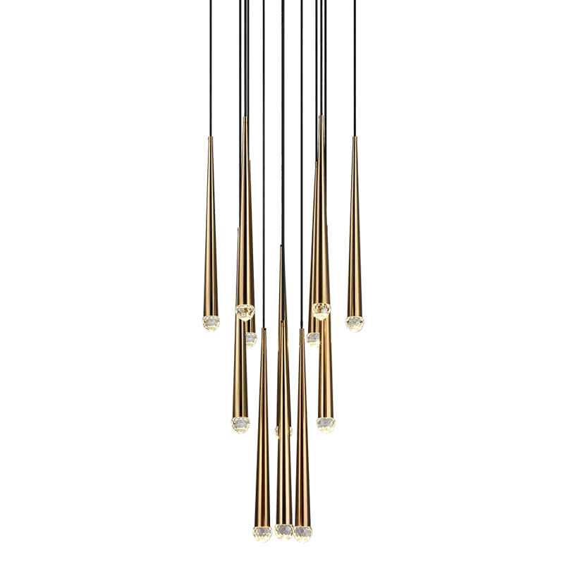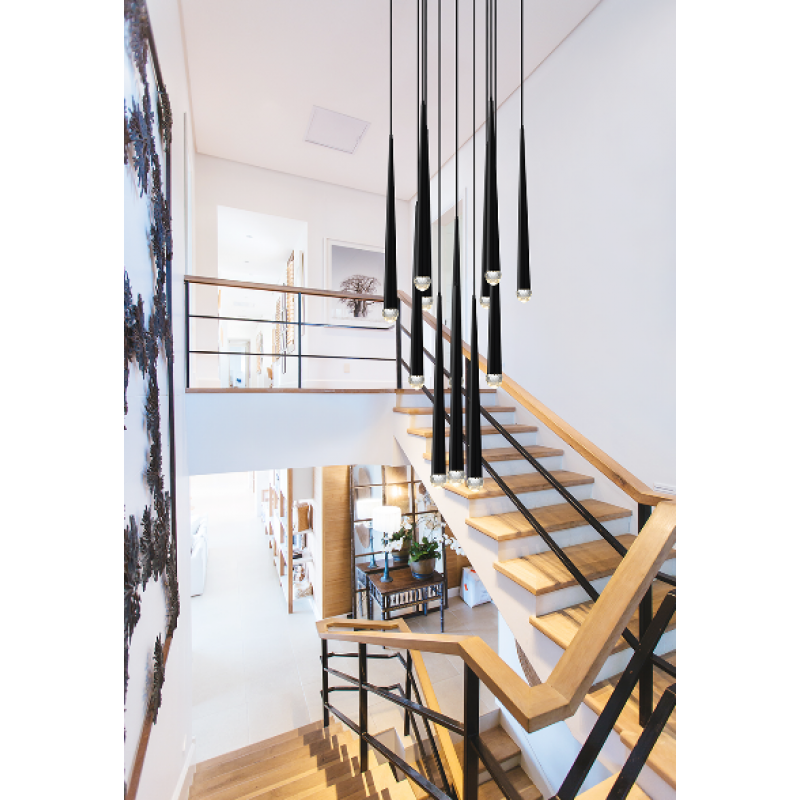 A modern cascading LED pendant offered in a Matte Black Finish and a Chrome finish. This collection has a contemporary feel with added interest in the detailed glass shade. Both finishes have a black fabric cord to complete the style.