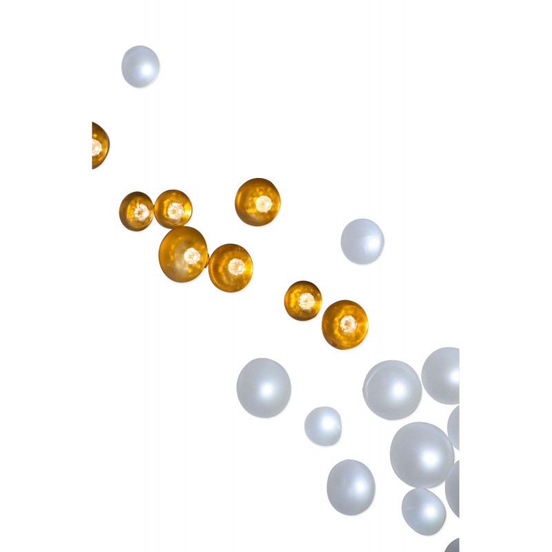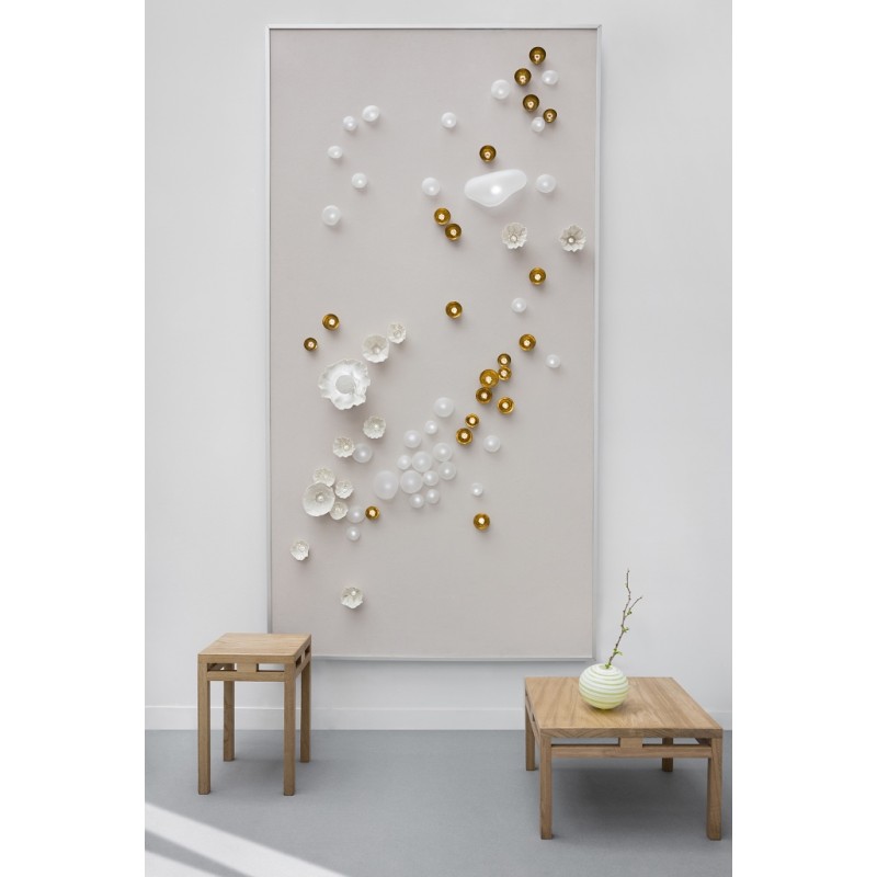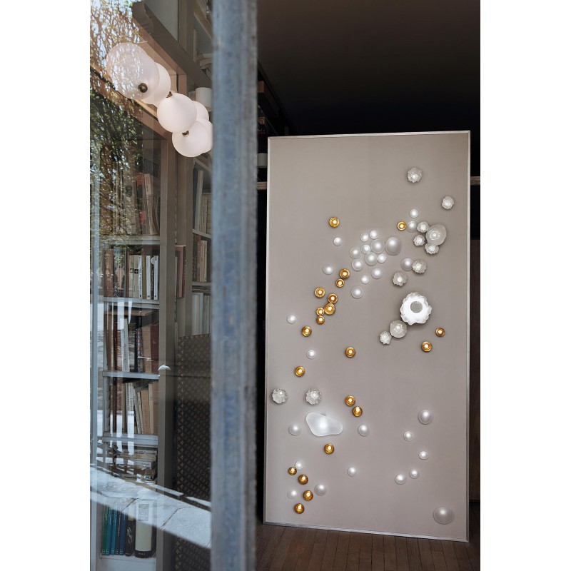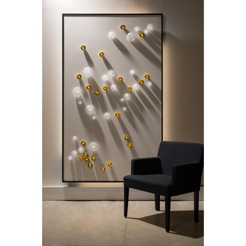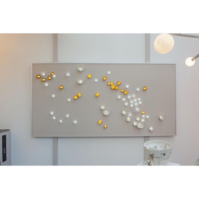 Elegant combination of light and materials, our Nature Harmonieuse panels are composed with Etoiles-LEDs, blown glass, brass, modeled-porcelain and cut crystals: these noble materials are hand-crafted and combined with light to make ornamental walls or ceilings. The materials seem to come alive. For an easy installation and without any work, our Nature Harmonieuse panels hang like a painting or a plafonnier. Each composition is unique.