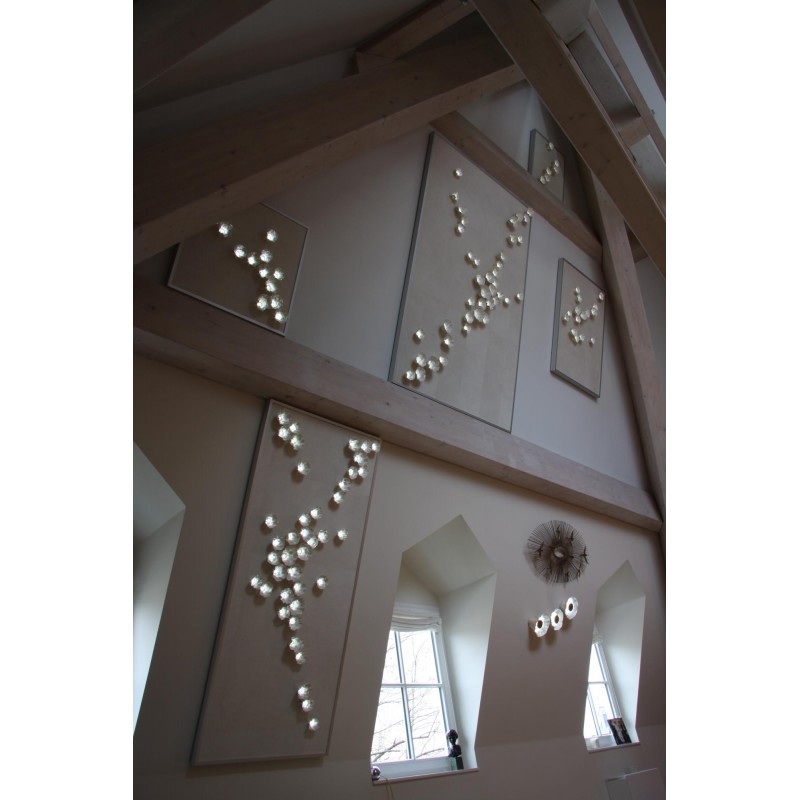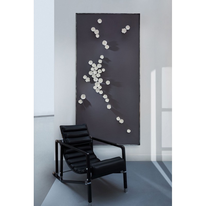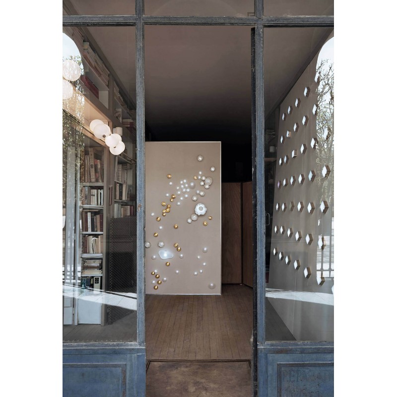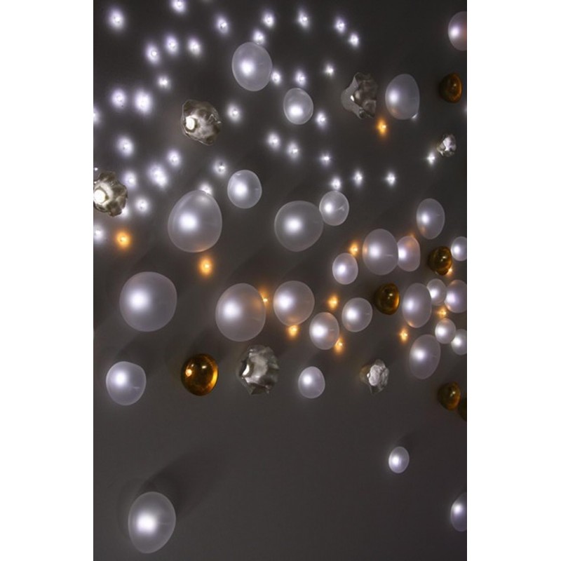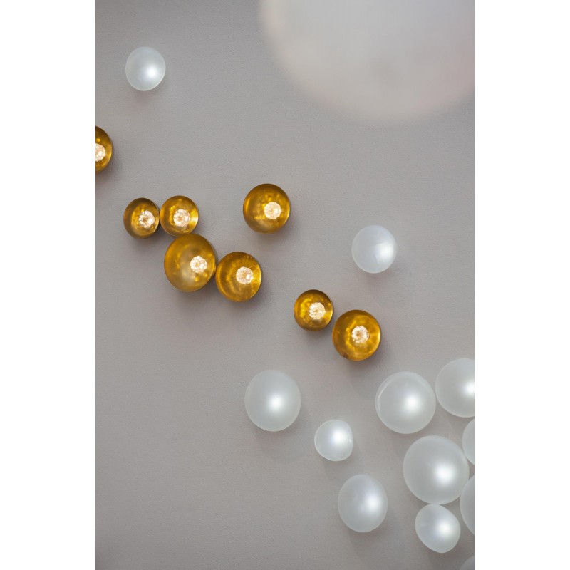 Elegant combination of light and materials, our Nature Harmonieuse panels are composed with Etoiles-LEDs, blown glass, brass, modeled-porcelain and cut crystals: these noble materials are hand-crafted and combined with light to make ornamental walls or ceilings. The materials seem to come alive. For an easy installation and without any work, our Nature Harmonieuse panels hang like a painting or a plafonnier. Each composition is unique.