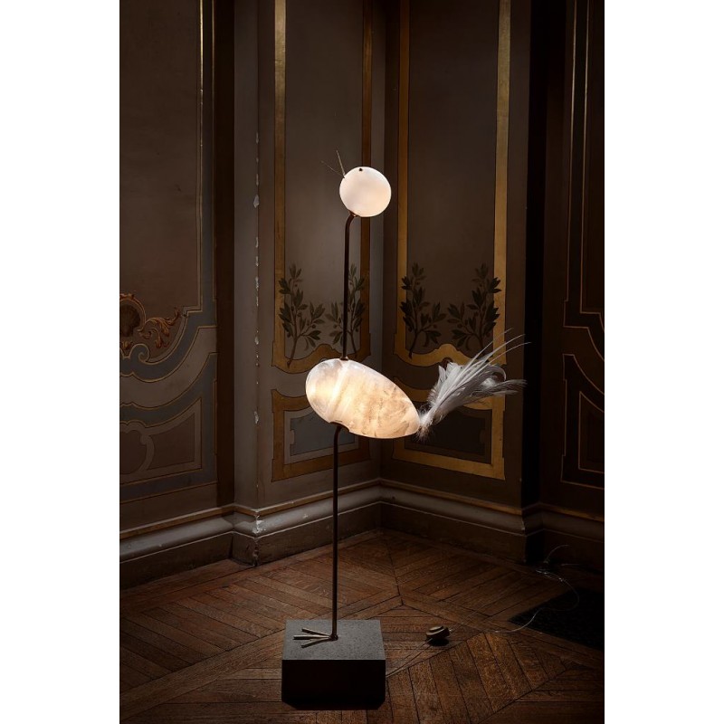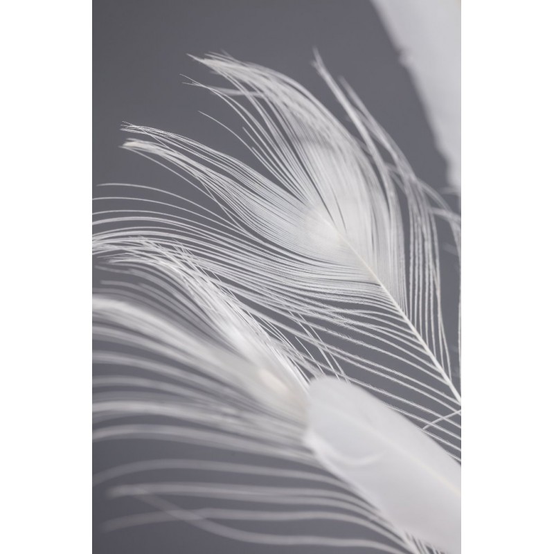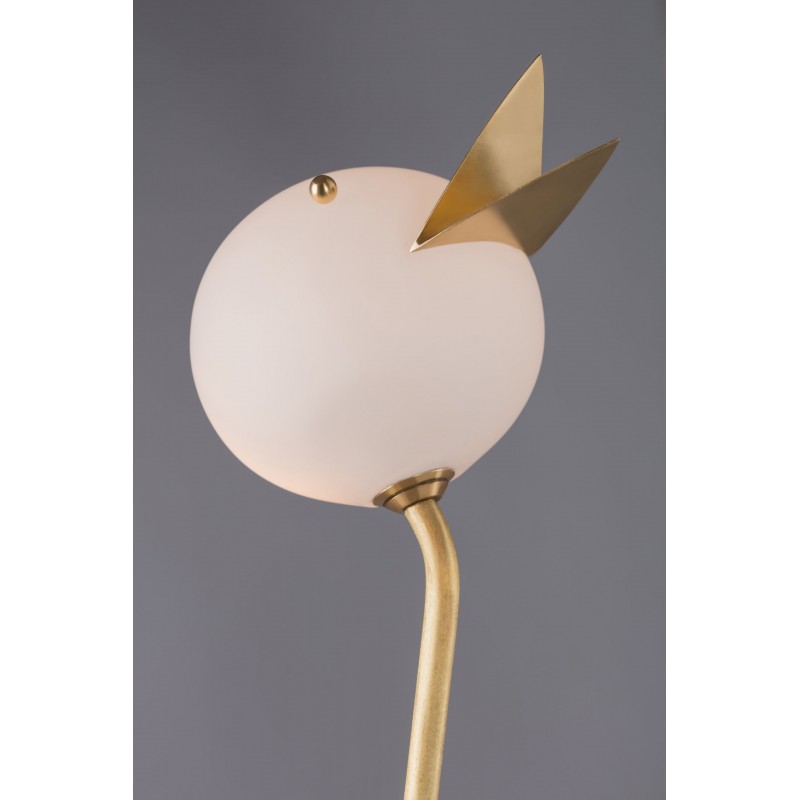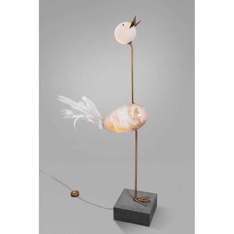 Materials: Mouth blown glass, brass, feathers, LEDs