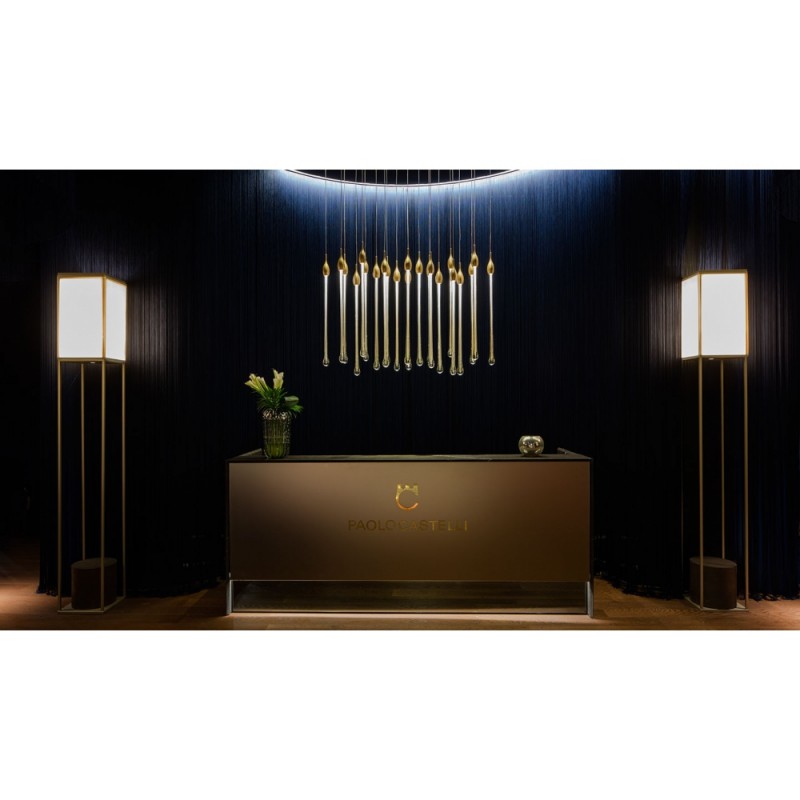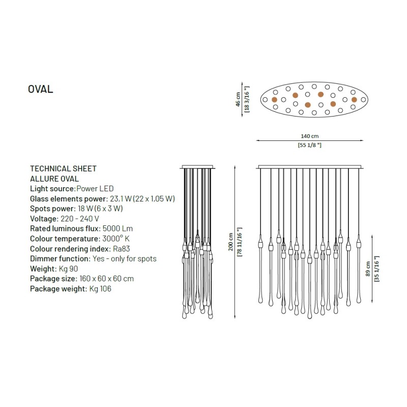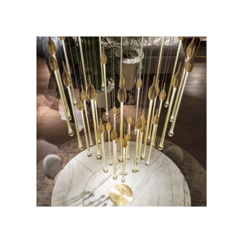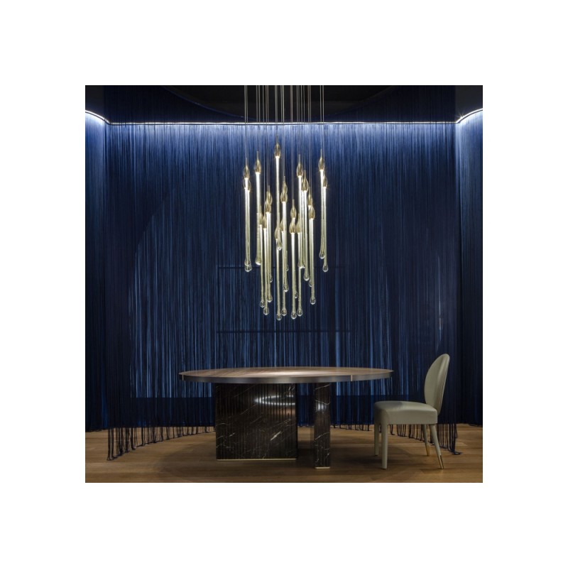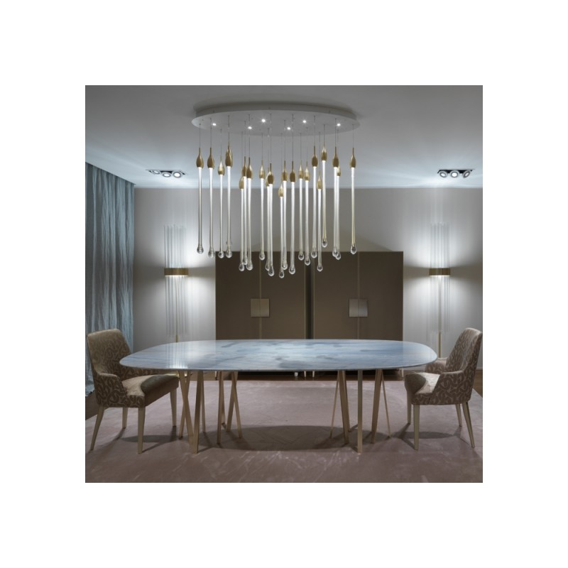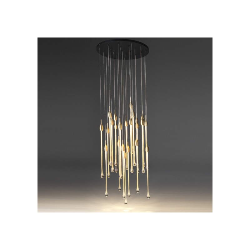Allure designed by Paolo Castelli is an exquisite lamp entirely handcrafted according to traditional murano techniques. The venetian crystal colour drops (n. 22 drops and 6 spots for oval version and n. 23 drops and 5 spots for round version), positioned at different heights, are made in solid murano glass enclosing precious 24 kt gold or silver leaf. In the gold finish, the top cap is made from brass; while, in the silver finish, it is made from aluminium, and includes the modern led light support. The top plate is anchored to a steel plate painted mat gold.