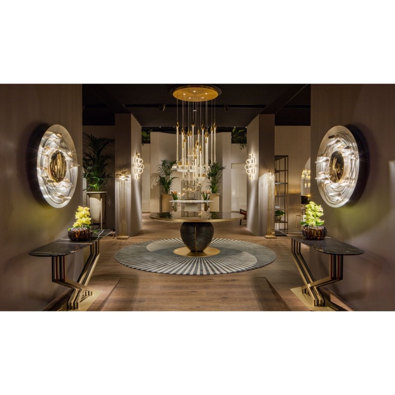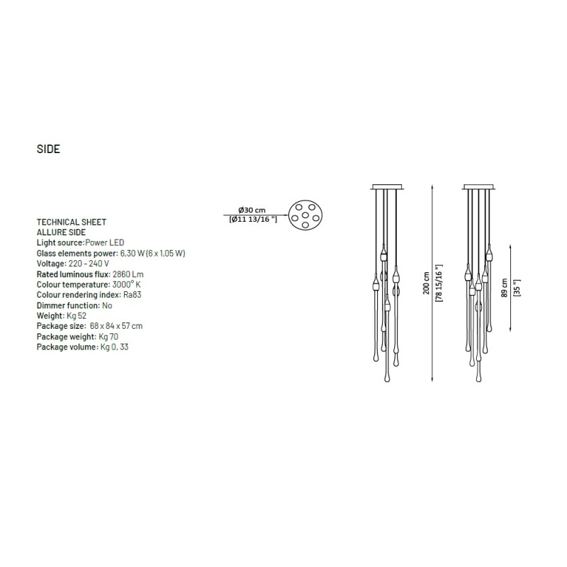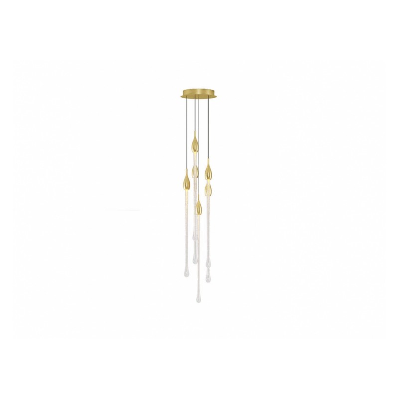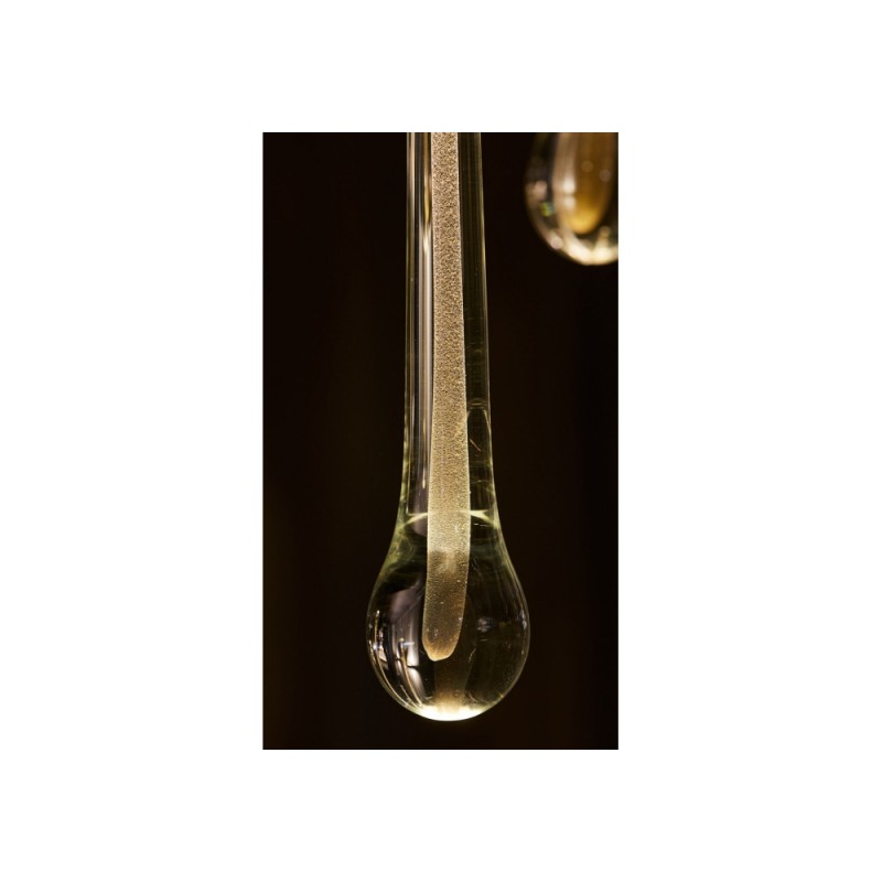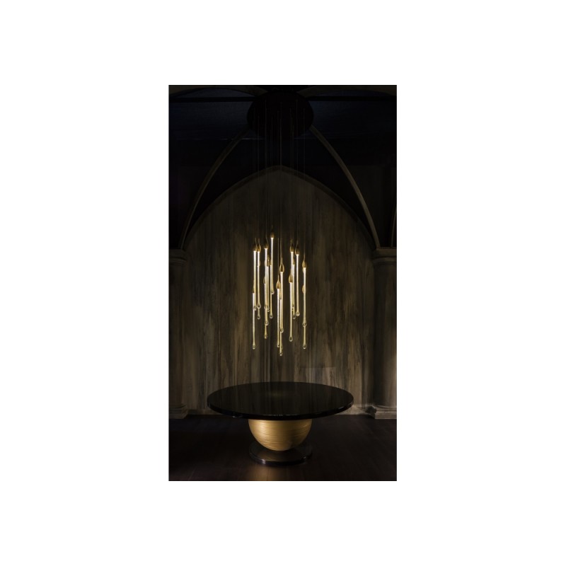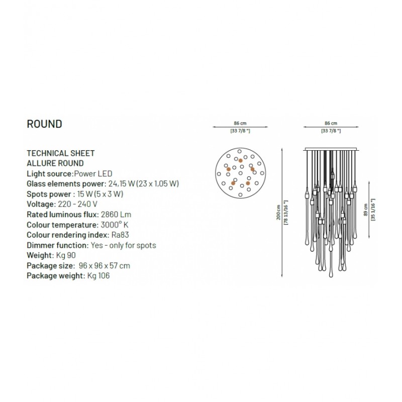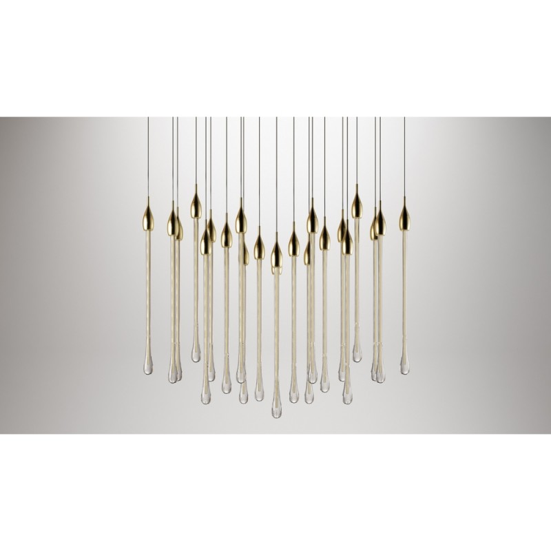 Allure designed by Paolo Castelli is an exquisite lamp entirely handcrafted according to traditional murano techniques. The venetian crystal colour drops (n. 22 drops and 6 spots for oval version and n. 23 drops and 5 spots for round version), positioned at different heights, are made in solid murano glass enclosing precious 24 kt gold or silver leaf. In the gold finish, the top cap is made from brass; while, in the silver finish, it is made from aluminium, and includes the modern led light support. The top plate is anchored to a steel plate painted mat gold.