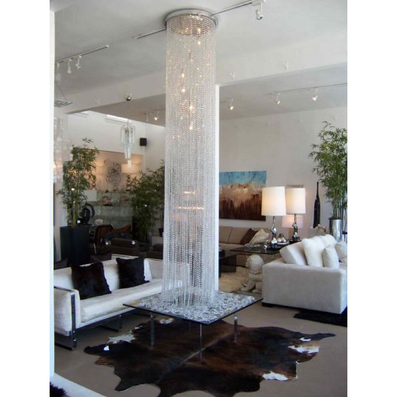 Swarowski style sparkling crystal cascade available in bespoke size. The key to an elegant, opulent, bespoke design is understanding the aspirations of the client, the relevance of location and through maximizing the potential of existing elements of the space.