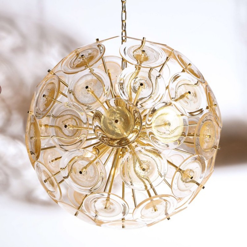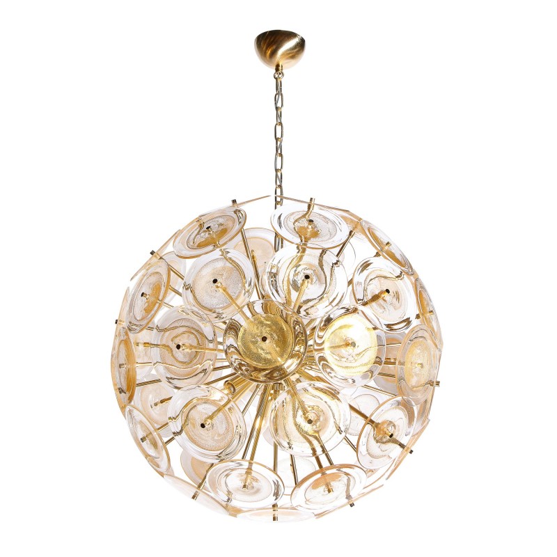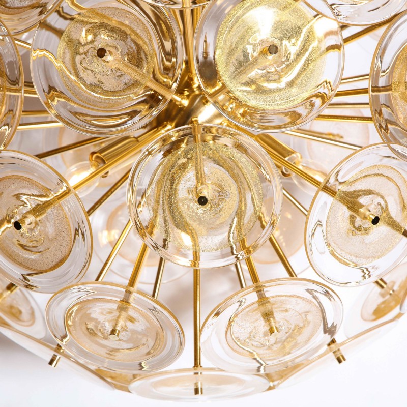 This dramatic and graphic Sputnik was realized in Murano, Italy,  the island off the coast of Venice renowned for centuries for its superlative glass production. It features a wealth of brushed brass rods emanating from circular body of the same material. The centers of the discs are embedded with 24 karat yellow gold flecks, imbuing them with a rich organic texture and subtle dynamism, while the perimeters are translucent. This iconic chandelier-made in the same manner for more than fifty years-is as modern looking today as ever before. It would be a winning addition to any style of interior, from Classic Mid-Century Modern to contemporary. It has been newly rewired to American standards and is in excellent condition. The height can be adjusted to suit. The fixture accommodates six Edison based bulbs, providing up to six hundred watts of light.