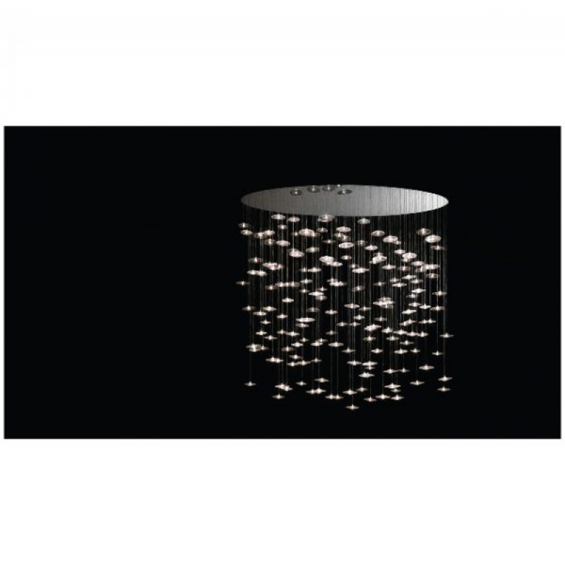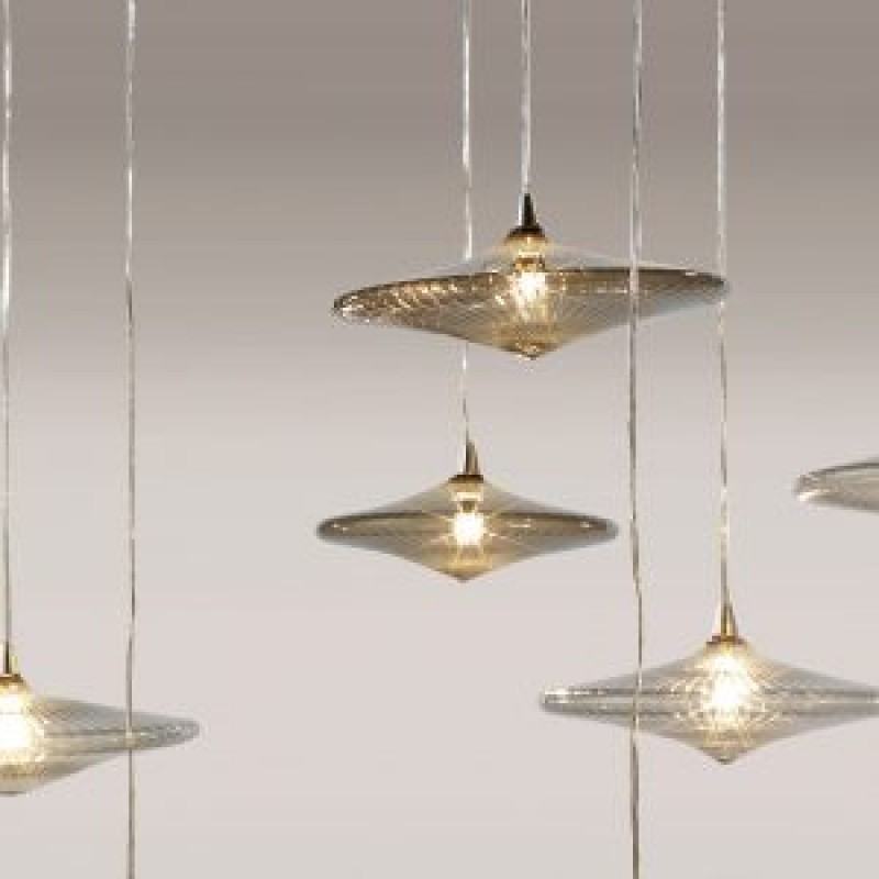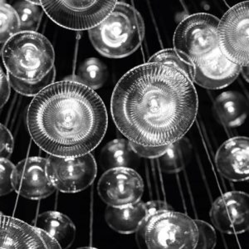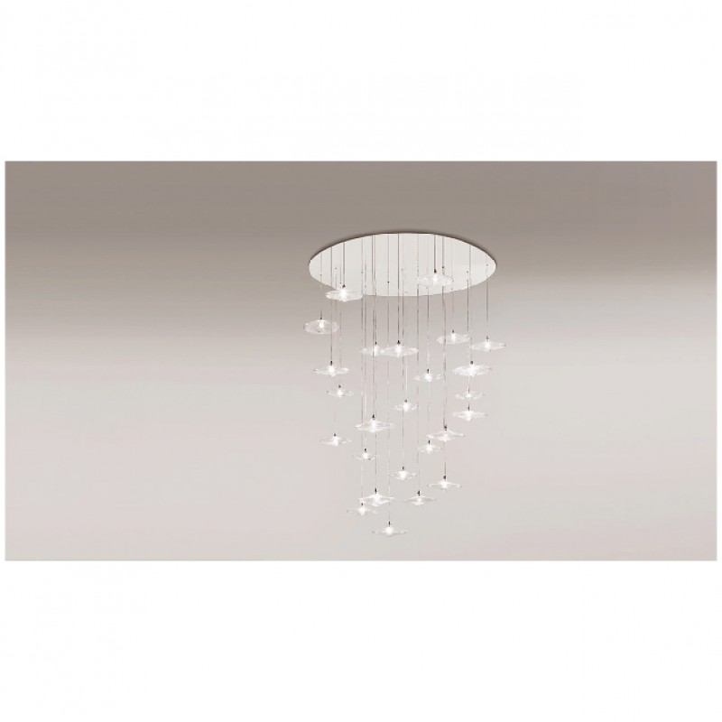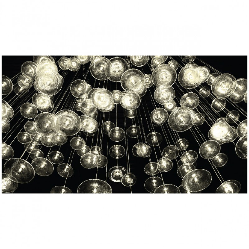 Sirius – Chandelier with support in white or black lacquered or mirror glass and pendant elements in blown borosilicate glass, transparent or coloured with LED. It is possible to realize customized versions for dimensions, length and shape.