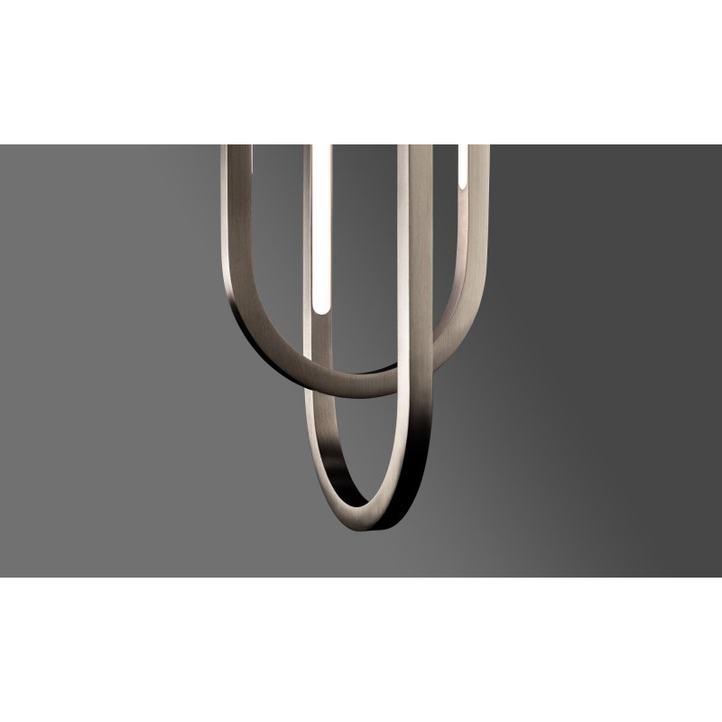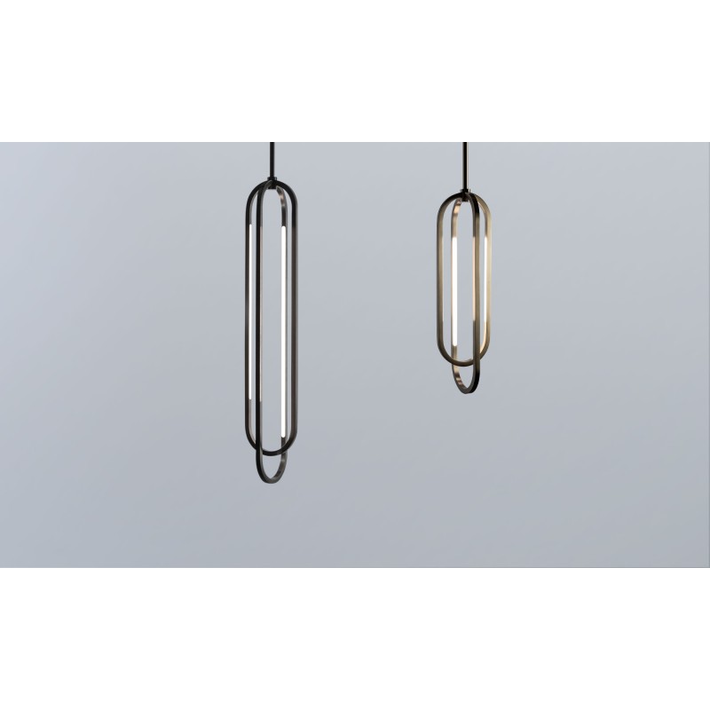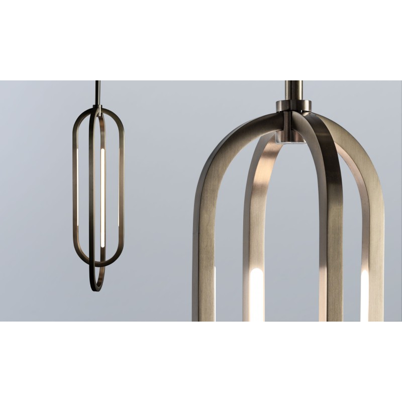 A thin profile brings airiness and minimalism to this elegant series of pendants designed by Doyle Crosby. Square tubes of hand-finished brass form geometric crisscrossing double obround loops that illuminate from within satin white diffusers.