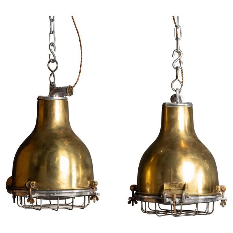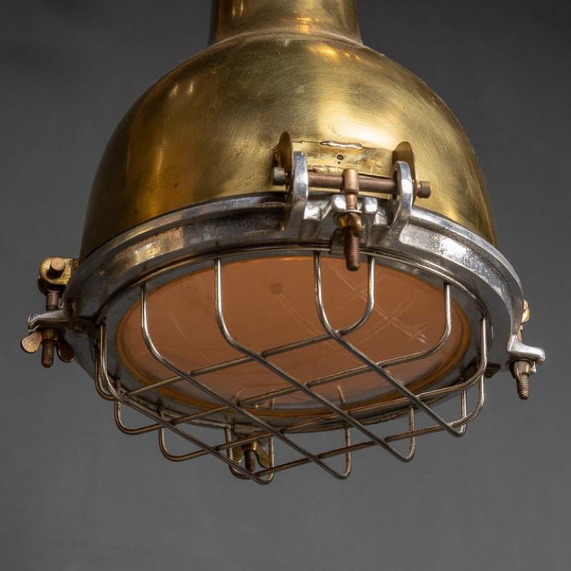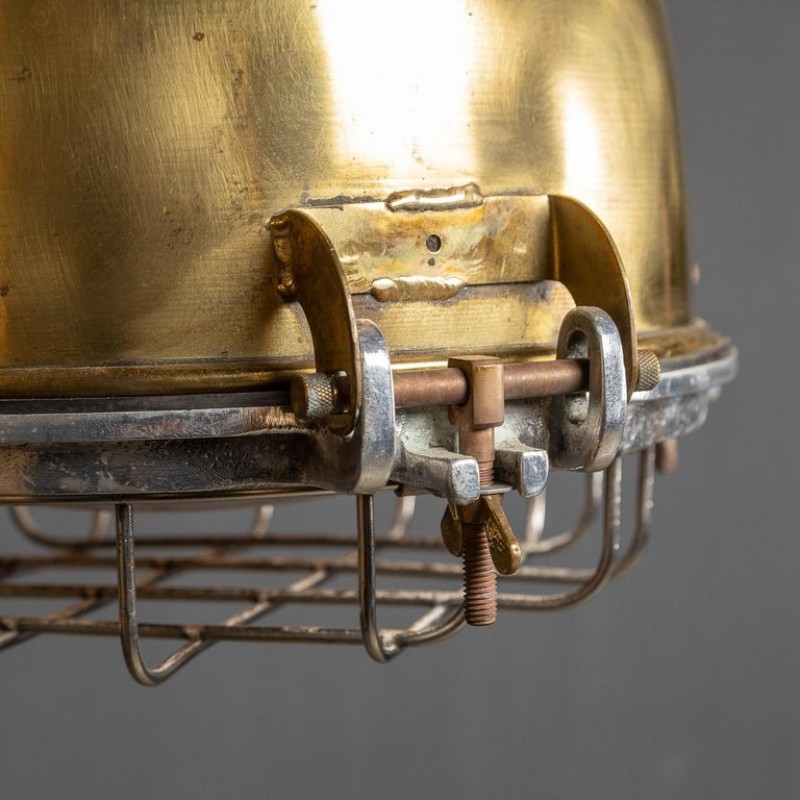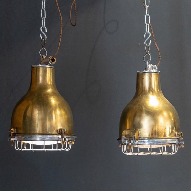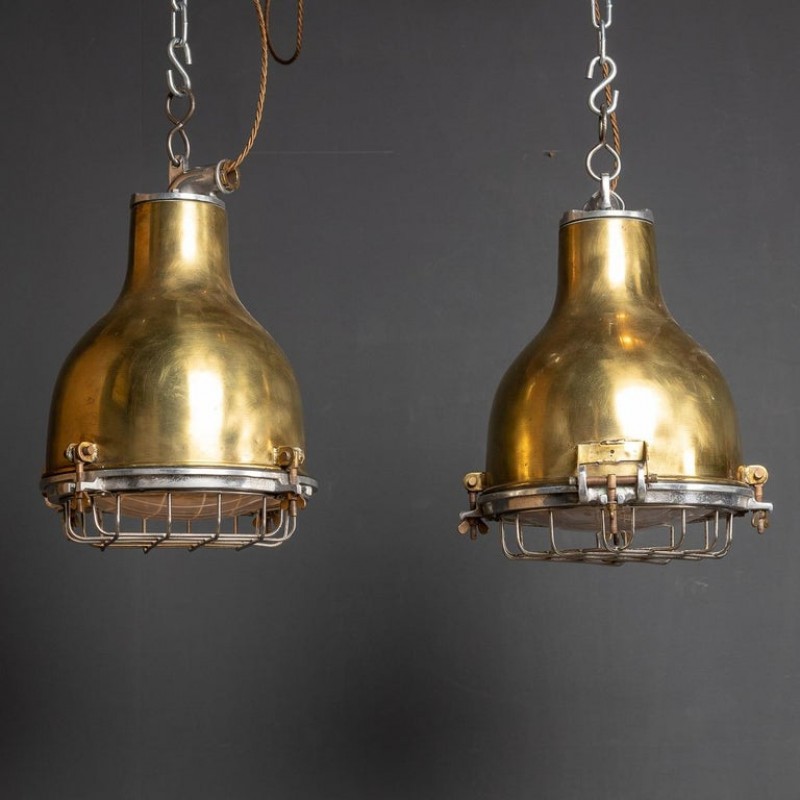 A pair of polished brass pendant lights in a classic bell shape with caged lens. These lights were originally used lighting the decks of a Danish Cargo Ship in the 1950’s