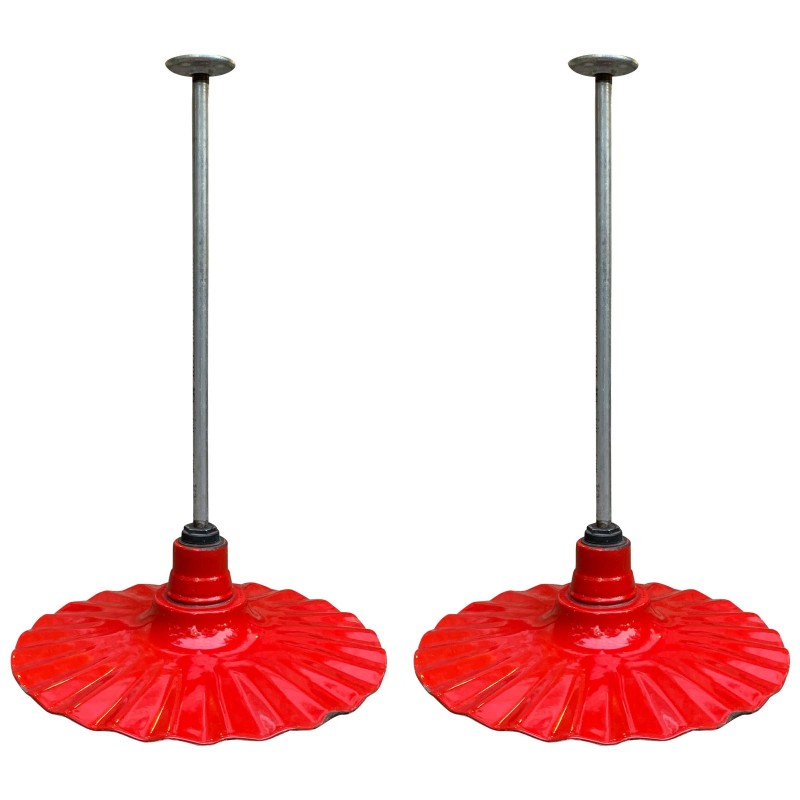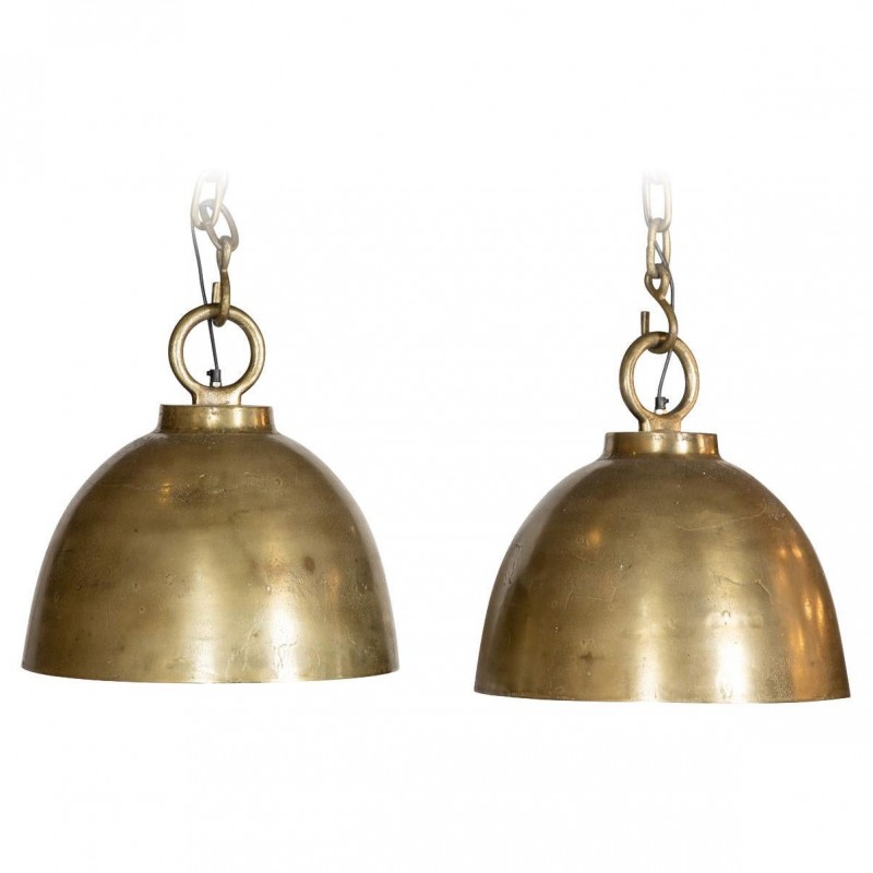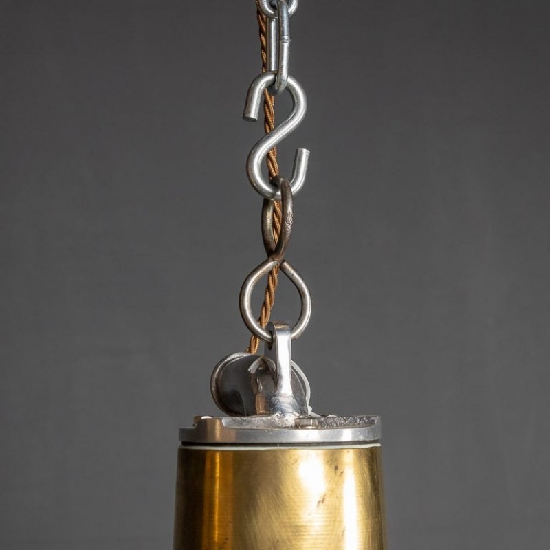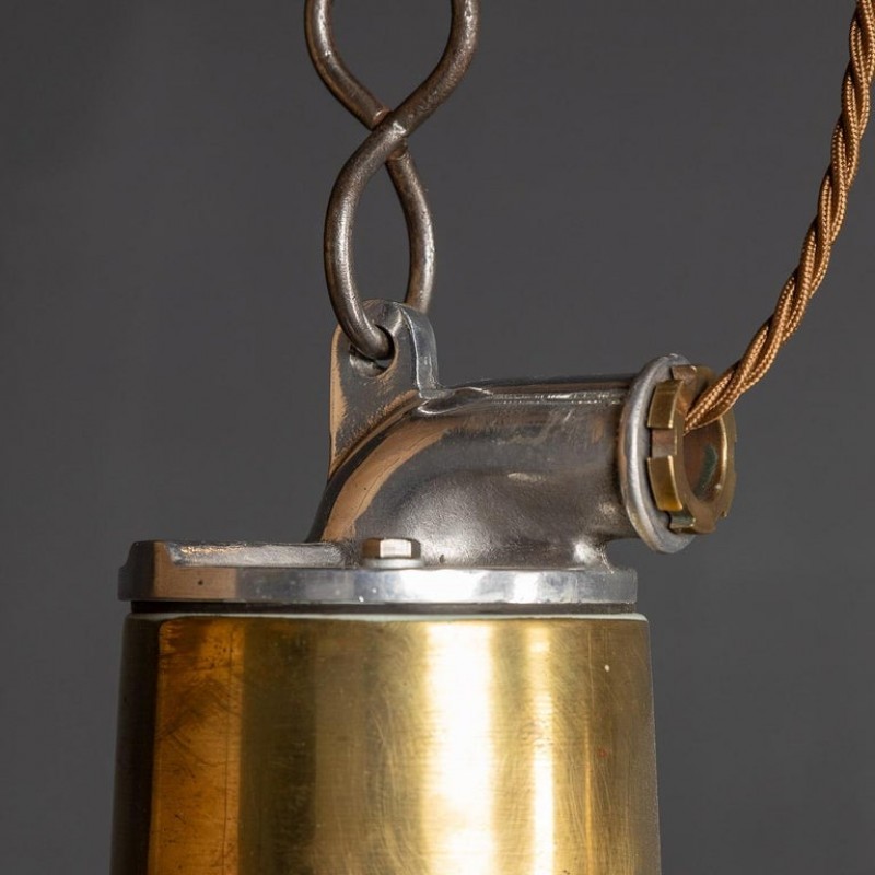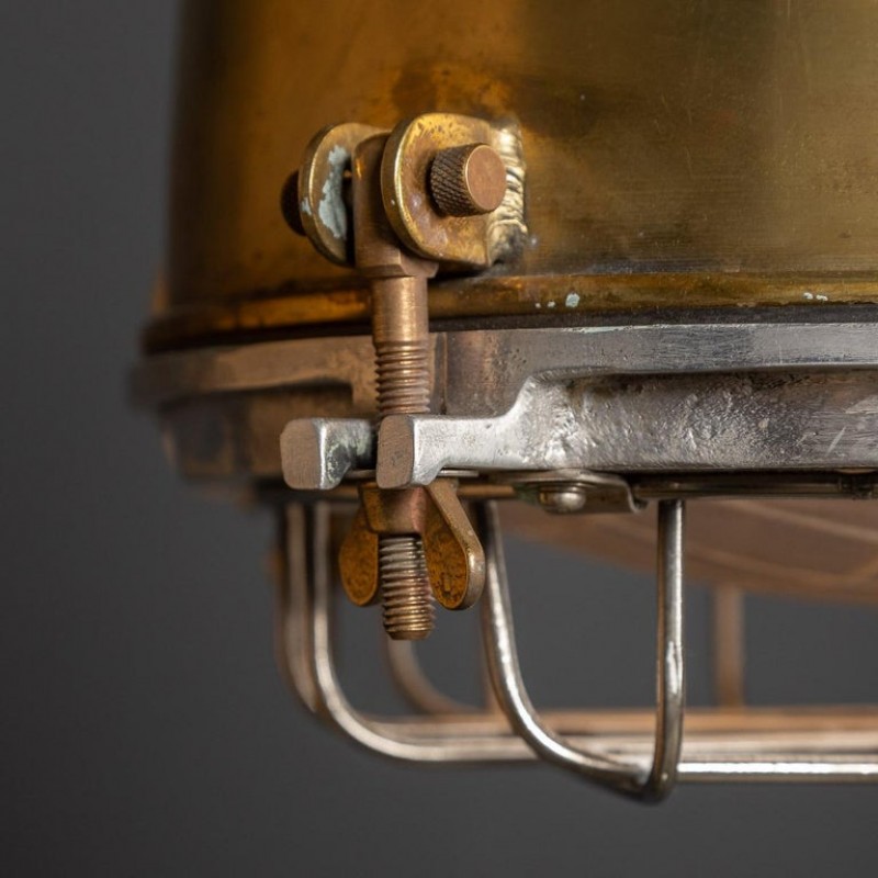 A pair of polished brass pendant lights in a classic bell shape with caged lens. These lights were originally used lighting the decks of a Danish Cargo Ship in the 1950’s