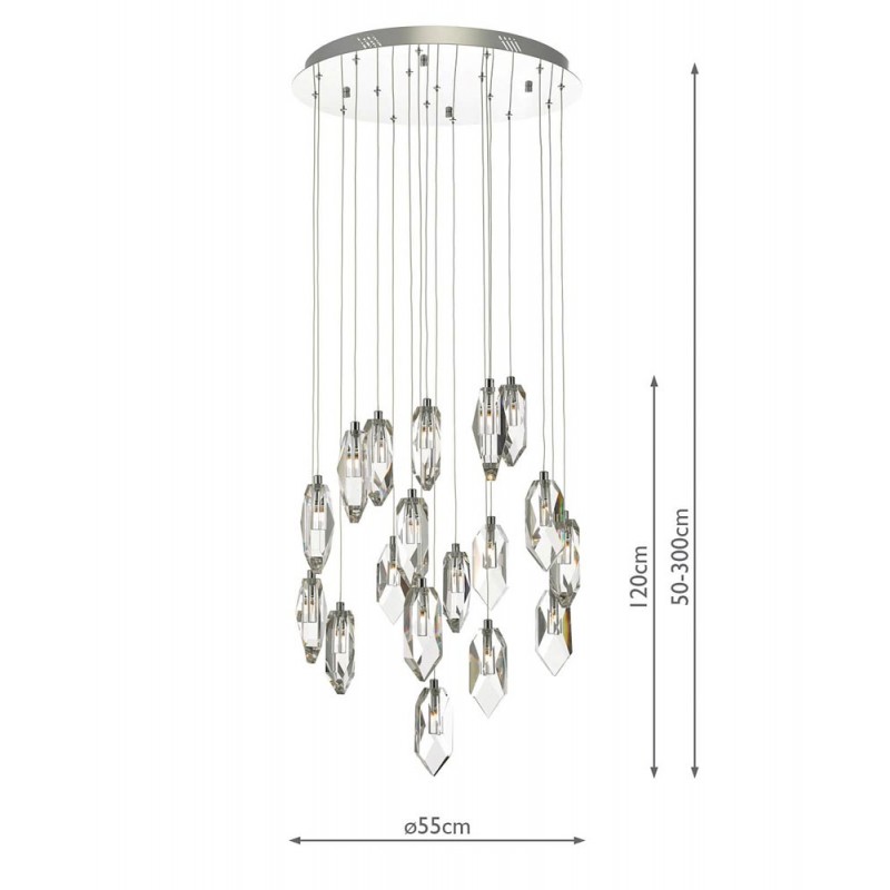 This beautiful faceted rock crystal 18 light ceiling pendant is part of the Dar Crystal collection. When lit, a stunning prism of light shines through each crystal and provides sparkly light. Supplied with high efficiency G4 LED lamp bulbs producing 3780 lumens of warm white light. Ideal lighting for any stylish stairwell, hallway or vaulted ceiling.