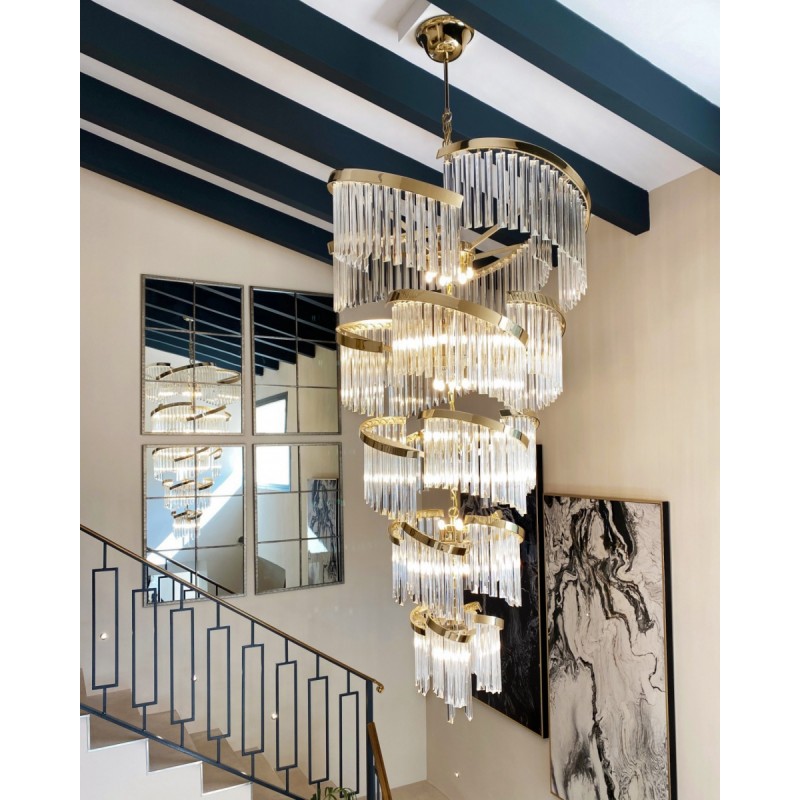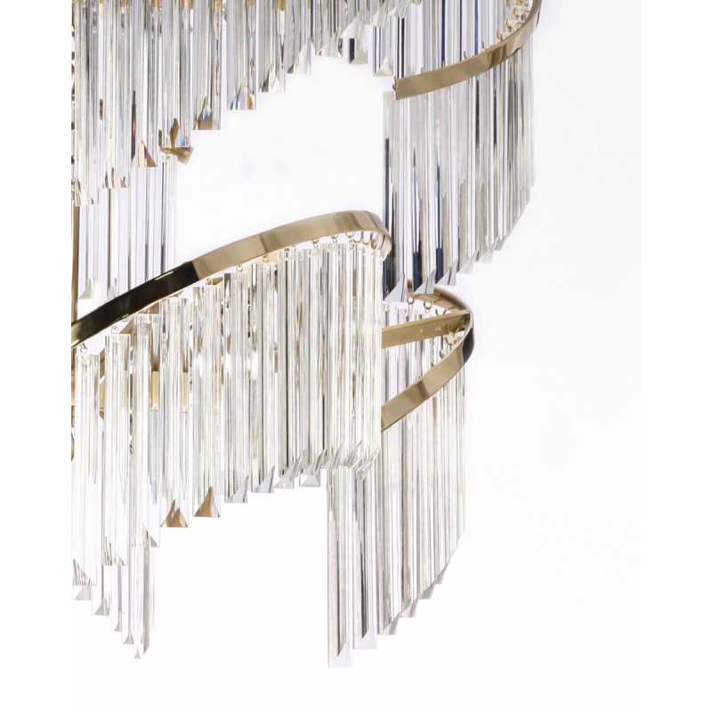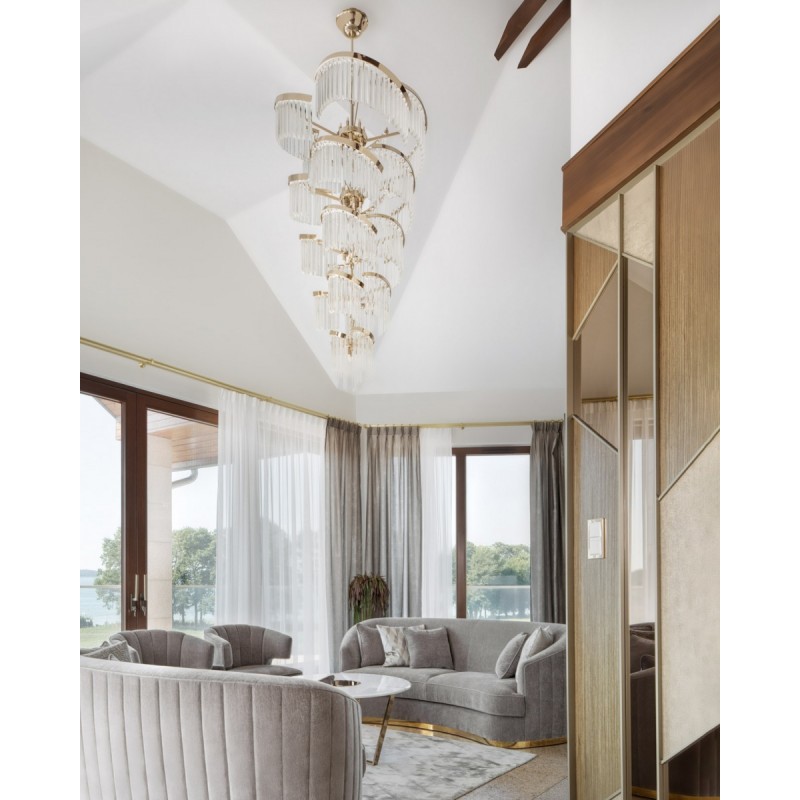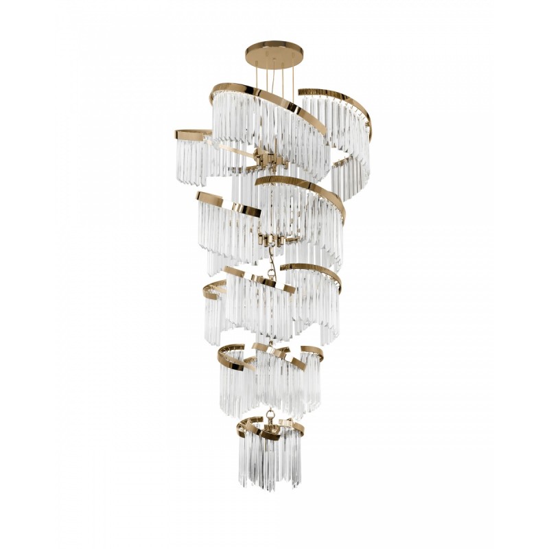 Twist suspension materializes the concept of twist in its design. The combination between the glass and the gold plated brass structure gives this one of a kind handmade lighting piece a sense of refinement that is unusually seen. This elegant design reminds the famous Victoria waterfalls in Zimbabwe as it gives the illusion of falling water. A sense of infinity is passed through the complex composition, conferring to this handmade suspension a capacity to surprise and continually reveal new sides. Twist was conceived to fulfill wide spaces like luxurious hotel lobbies and large exquisite staircases. This striking contemporary chandelier has in its lines a balance between past and present, and it’s essential to unique interiors that seek to enhance richness accents.