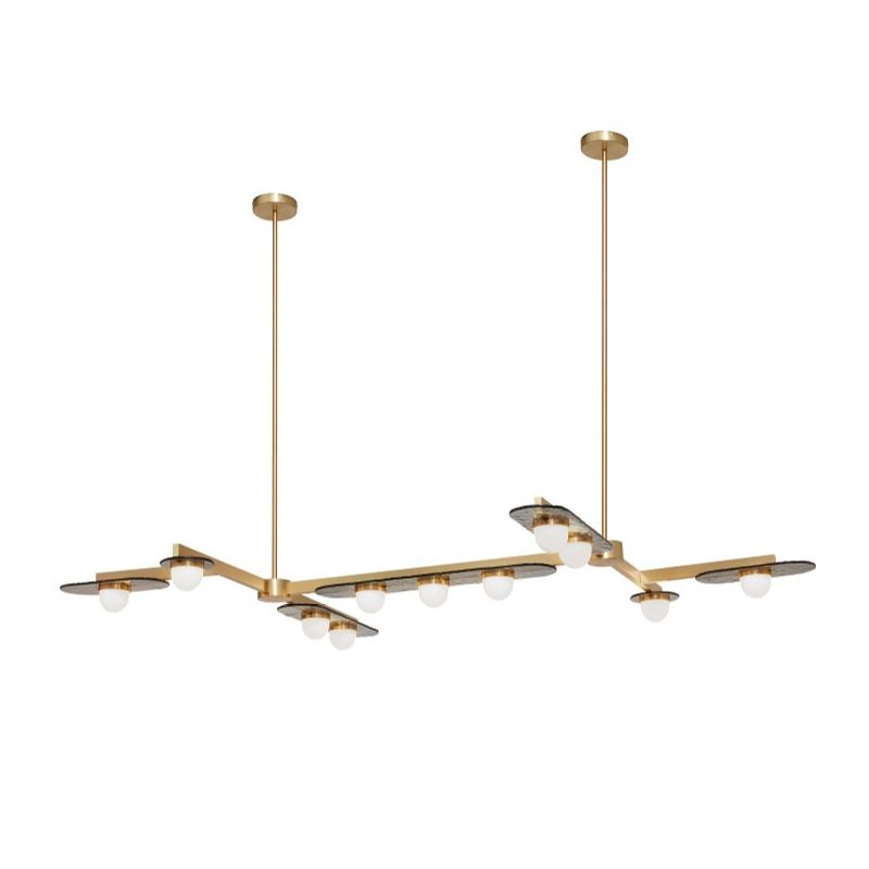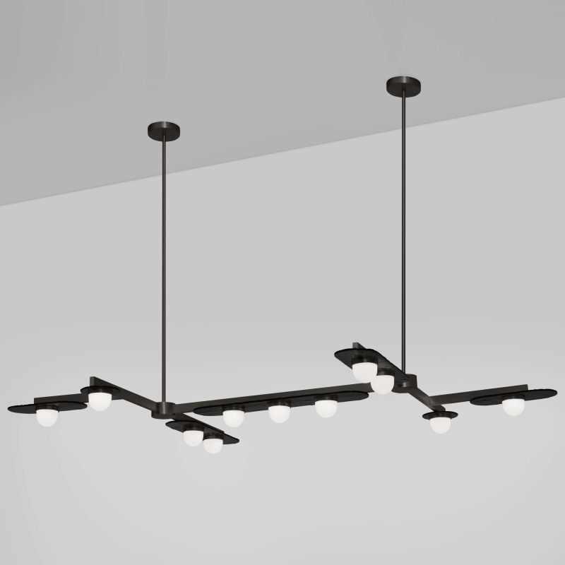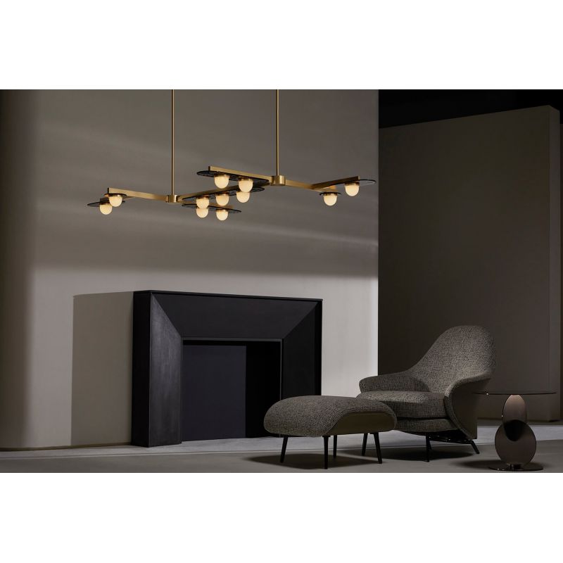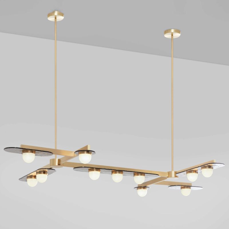 Antique scales and other instruments of measure inspired this collection by master glass designer Alison Berger, in which cloches and spheres of blown glass are suspended from metal frames in perfect equipoise. Blurring the line between lighting and sculpture, each piece acts as a radiant focal point and a potent symbol of balance.