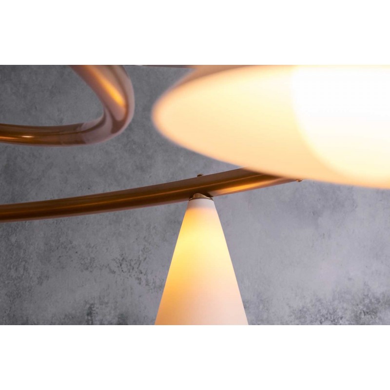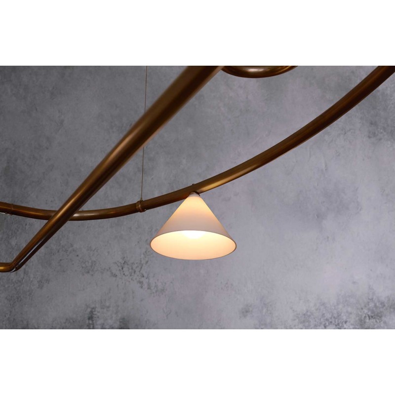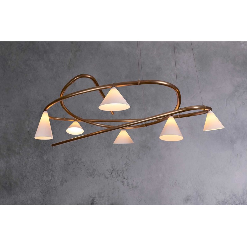It is as the name suggests, a sketch brought to life. Glowing porcelain shades made in England hang from its metal structure. Inside each shade is a hand blown white glass teardrop for each light source.