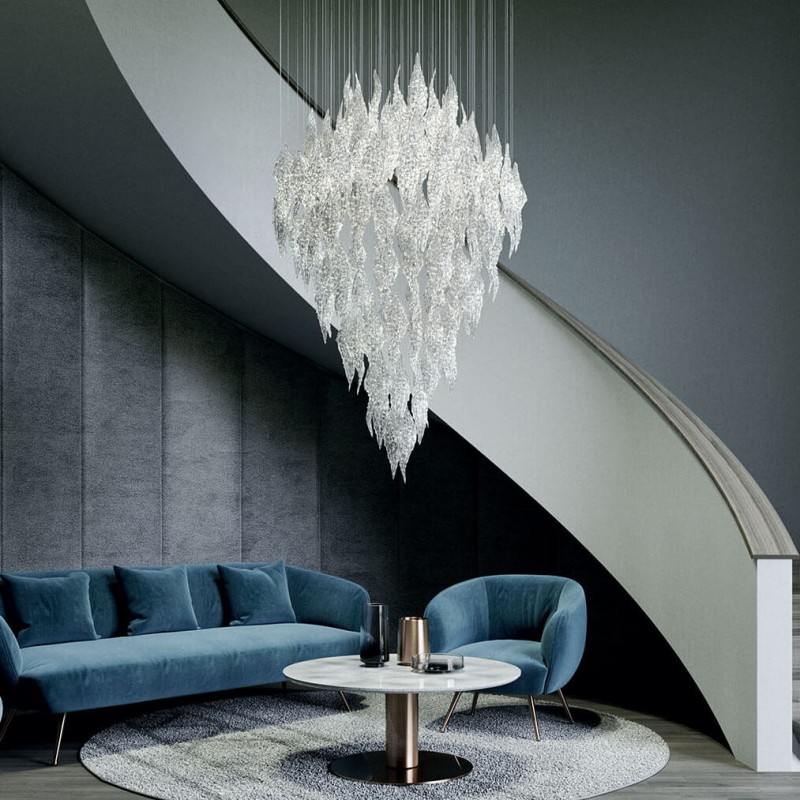 Art Glass chandelier is made of separated handblown glass pieces, which is flexible for different ceiling conditions. Can bring elegant, modern, classical feeling to the decoration of the building. Describe with abstract meaning. Simple but meaningful and luxury. Usually not comes with ceiling base, need to arrange the light source on the ceiling. You can explore the latest art glass chandelier projects to see the acheivement. If you prefer a classical feeling, you can see our flush mount crystal chandelier.