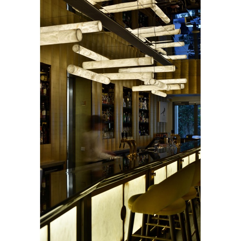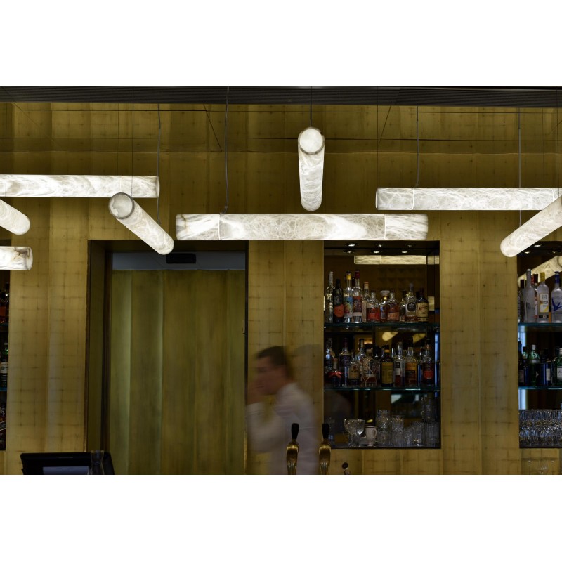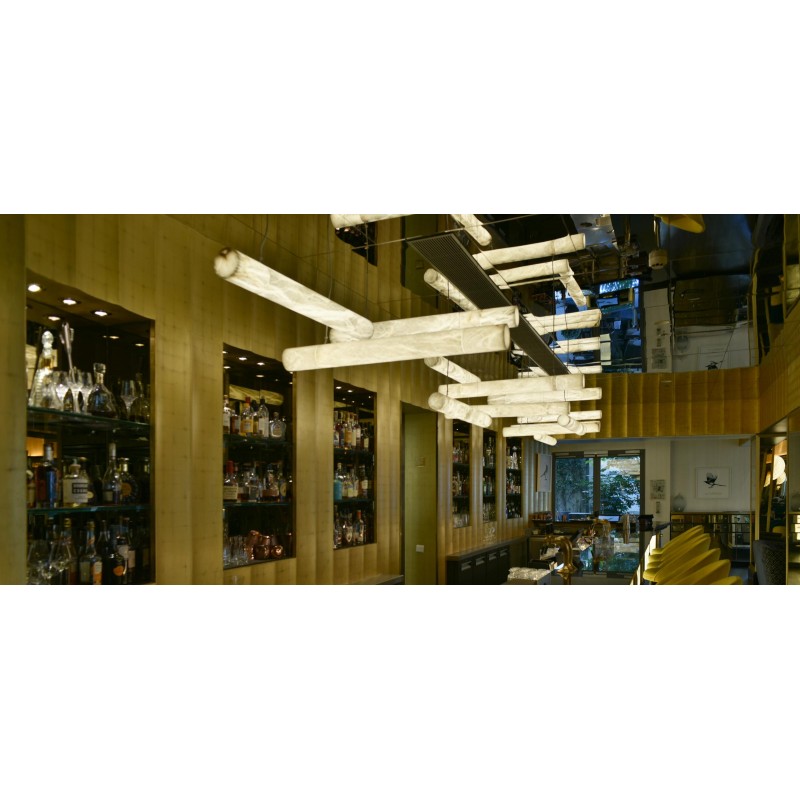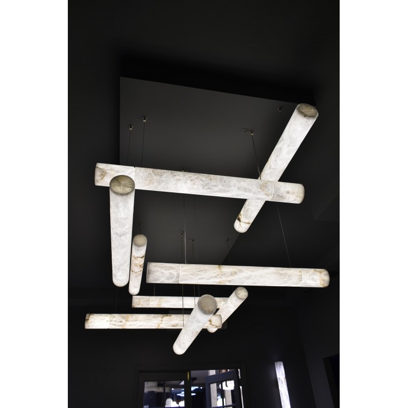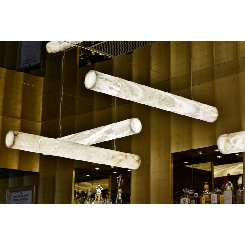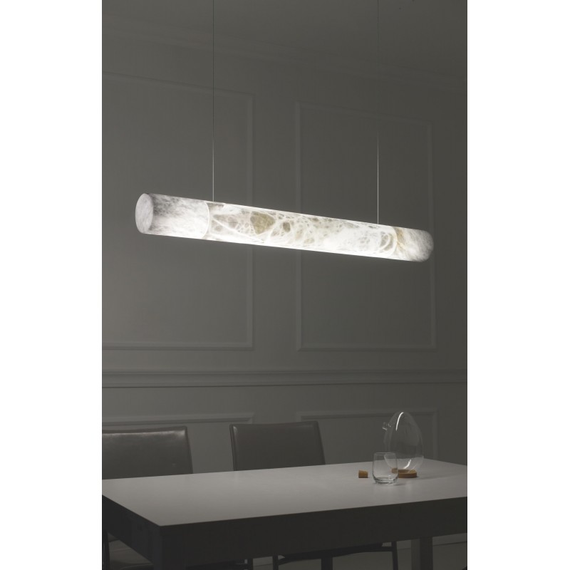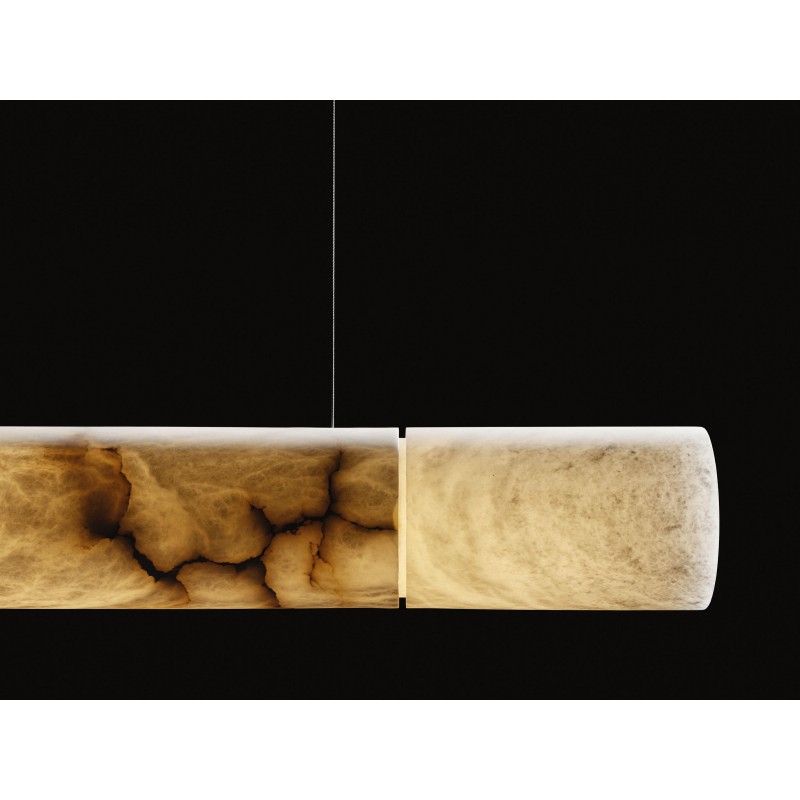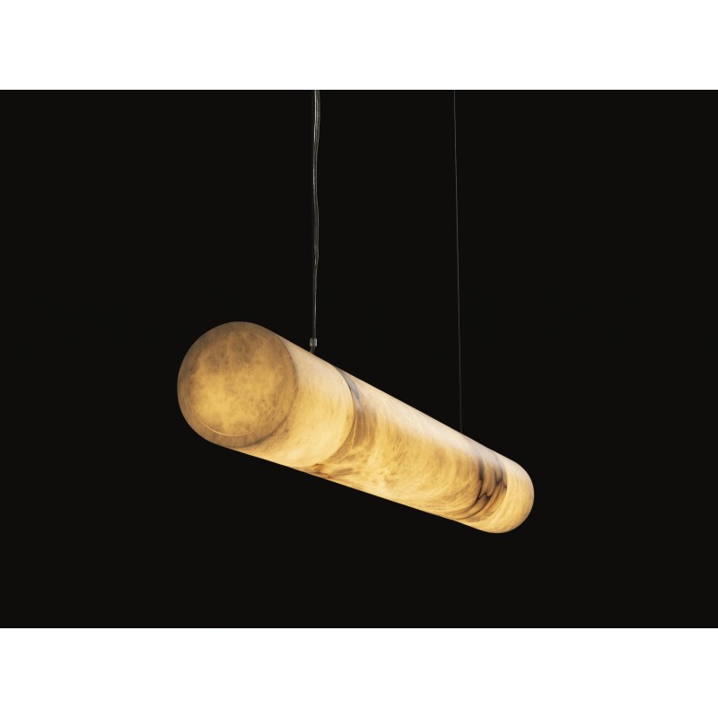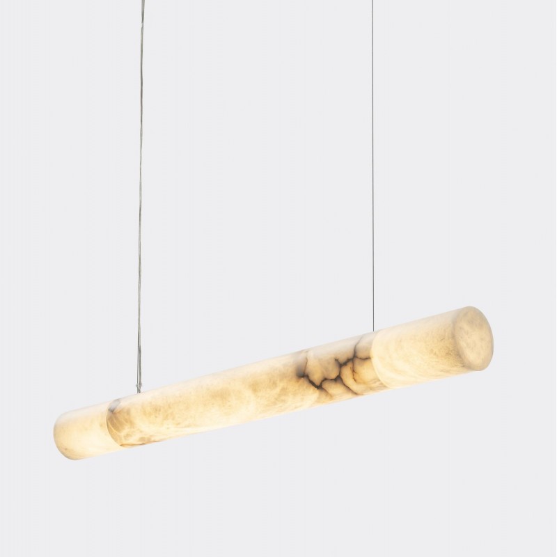 With its simple cylindrical shape, the Sumatra H Hanging Light exudes elegance above a room. Featuring two subtly carved hollow joints in its alabaster form, it hangs gracefully as if floating in the air. Designed to be easily arranged in multiples, the light can be suspended and overlapped at varied heights and angles to create unique compositions—making it well-suited for residential and commercial spaces.