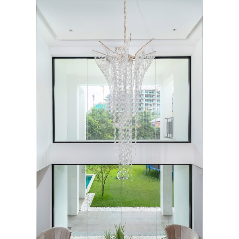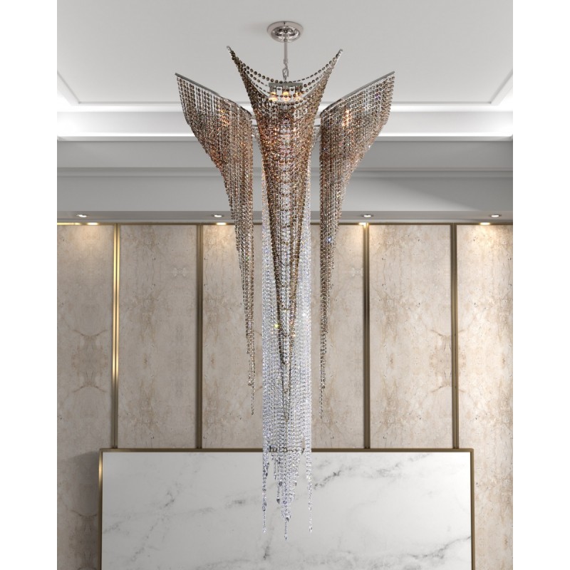 Atlantida handmade lighting design is ideal for luxurious double floor staircases, elegant living rooms, exclusive entrances and halls. With its warm and elegant light, it creates a particularly pleasant atmosphere. The brilliance and exclusivity of the crystals are an unquestionable luxury statement that grants a superior and prestigious character to any interior.