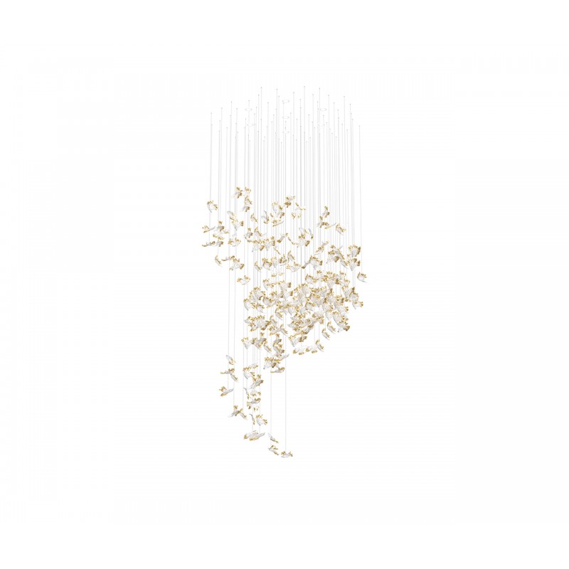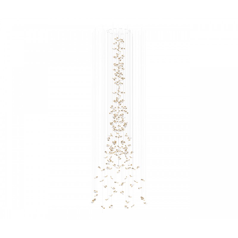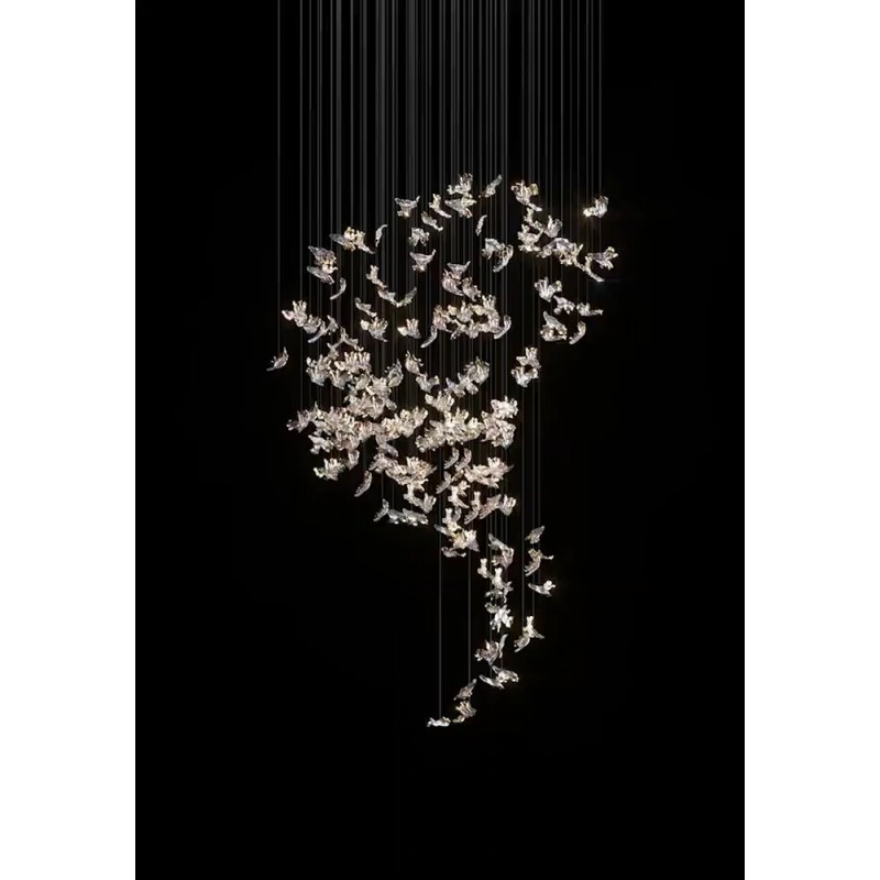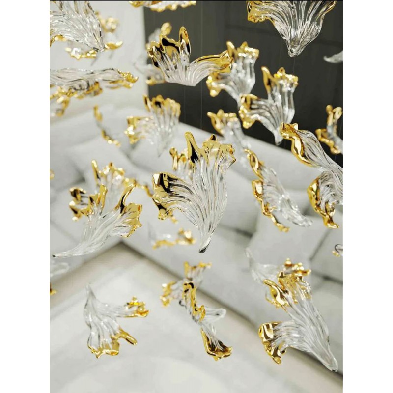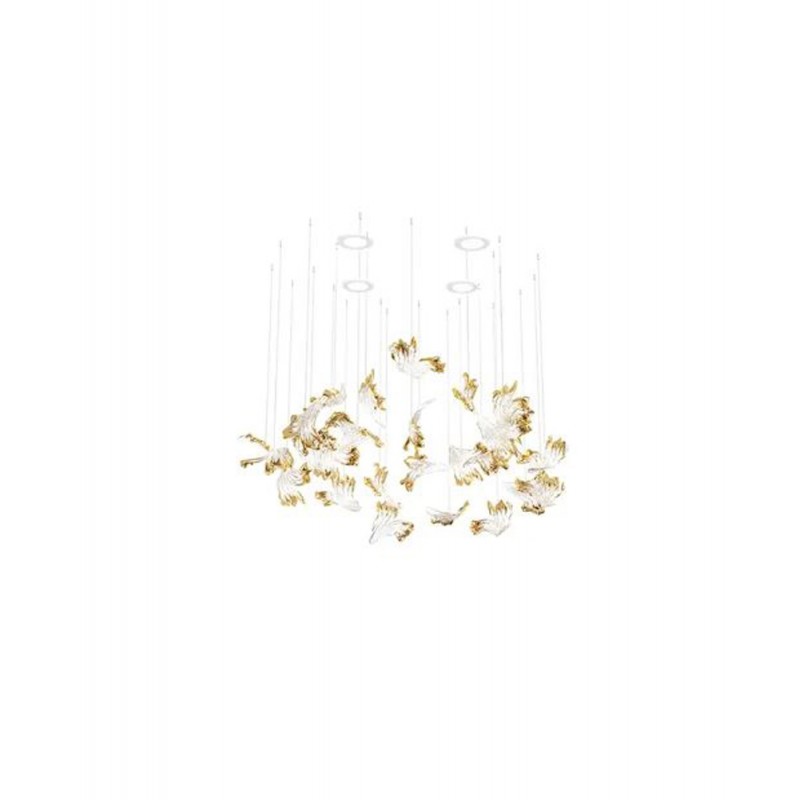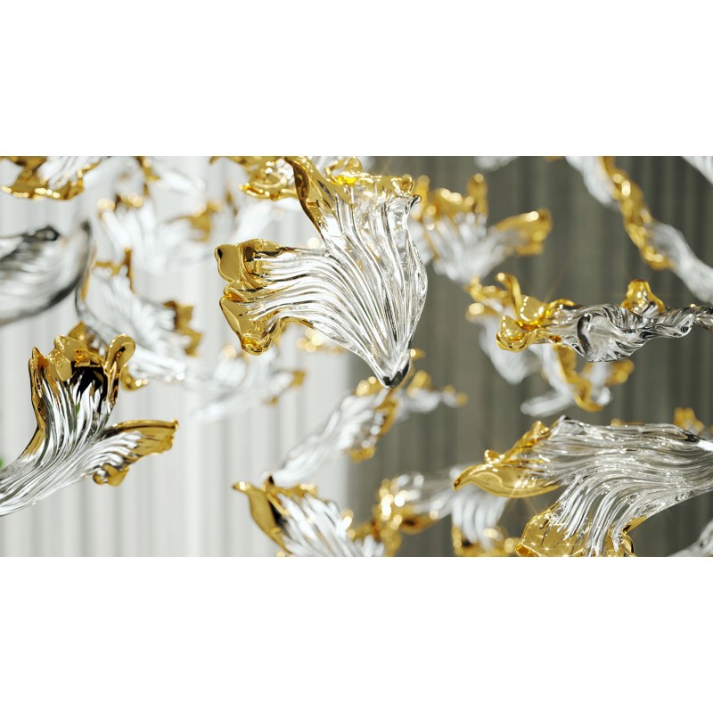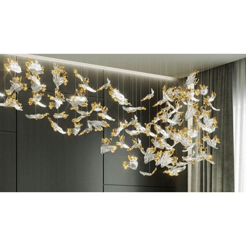 Crystal petals float to the ground like icy snowflakes. This series of installations shows how something delicate can have a powerful impact. Each crystal component is shaped and painted by hand, using glass coloring technology. Together, these fragile petals create a masterful installation to crown the interiors. A centerpiece fit for snow queen's palace, where the delicate and fragile hand-blown pieces glide suspended from the ceiling in various dreamy formations. The delicate artisan crystal glass components embody the fragility of flowers touched by the first frost. The icy effect intensified by adding a color gradient and gilded edge state true luxury. It is so crystal clear, gentle, and innocent, and on the other hand, it is unmanageable and spirited. Glass is glass, it always has its way.