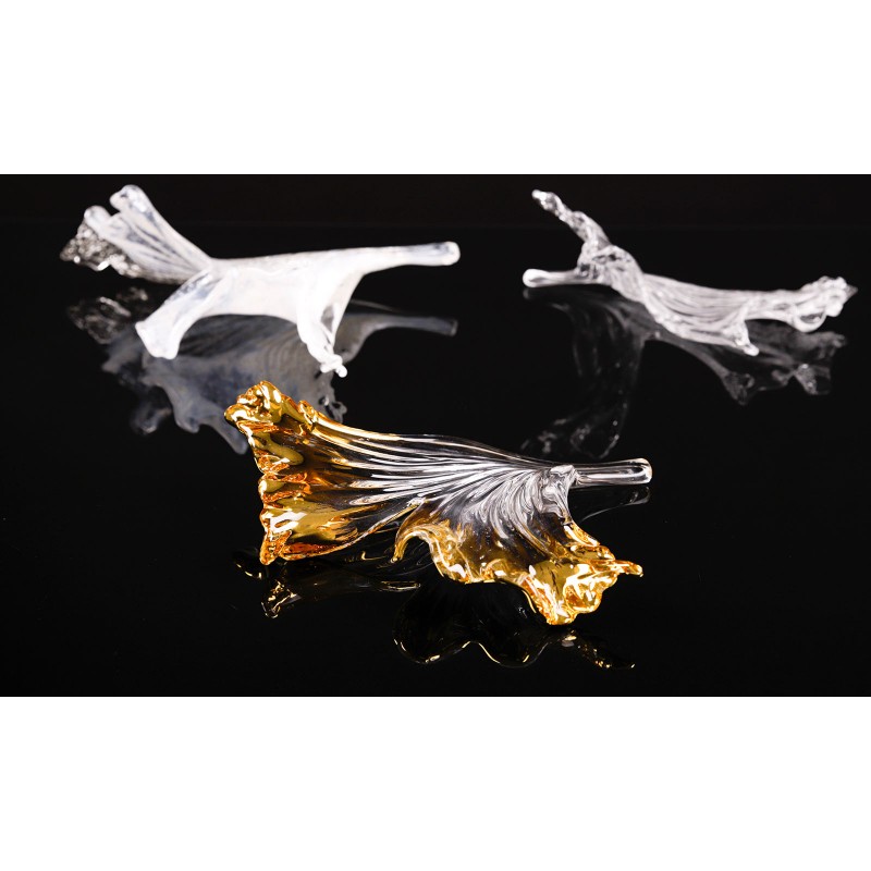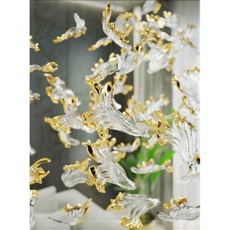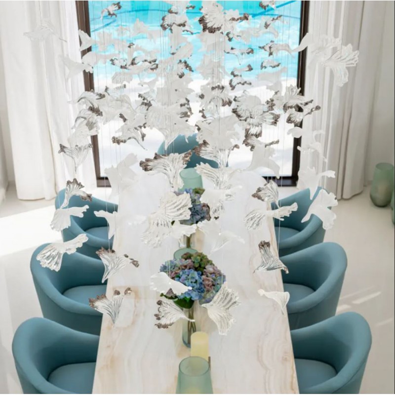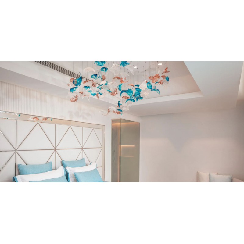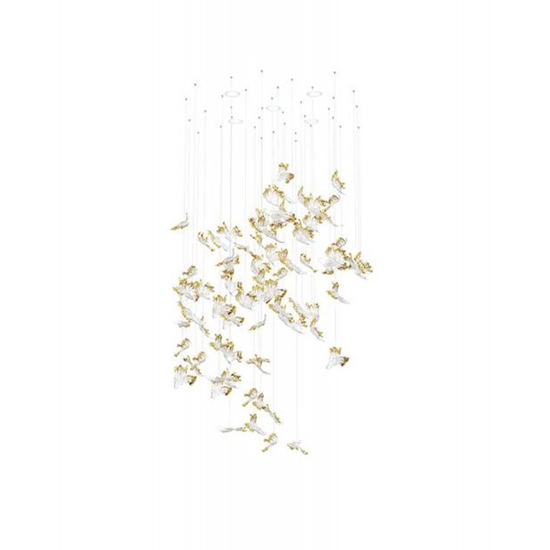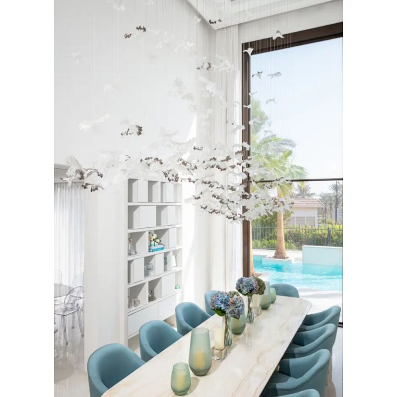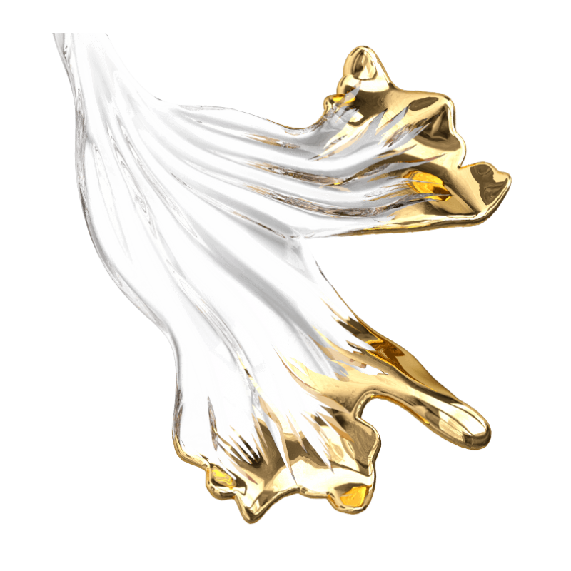 Crystal petals float to the ground like icy snowflakes. This series of installations shows how something delicate can have a powerful impact. Each crystal component is shaped and painted by hand, using glass coloring technology. Together, these fragile petals create a masterful installation to crown the interiors. A centerpiece fit for snow queen's palace, where the delicate and fragile hand-blown pieces glide suspended from the ceiling in various dreamy formations. The delicate artisan crystal glass components embody the fragility of flowers touched by the first frost. The icy effect intensified by adding a color gradient and gilded edge state true luxury. It is so crystal clear, gentle, and innocent, and on the other hand, it is unmanageable and spirited. Glass is glass, it always has its way.