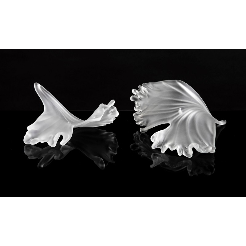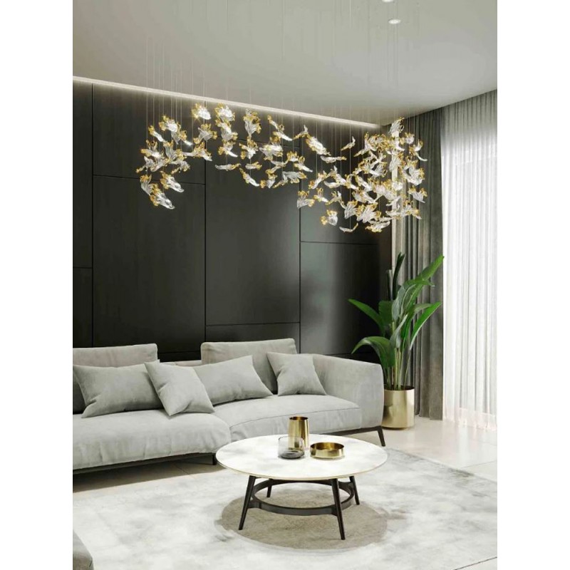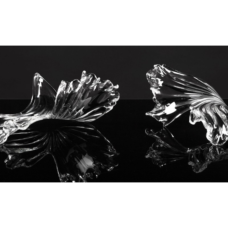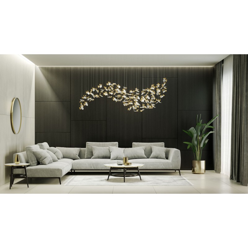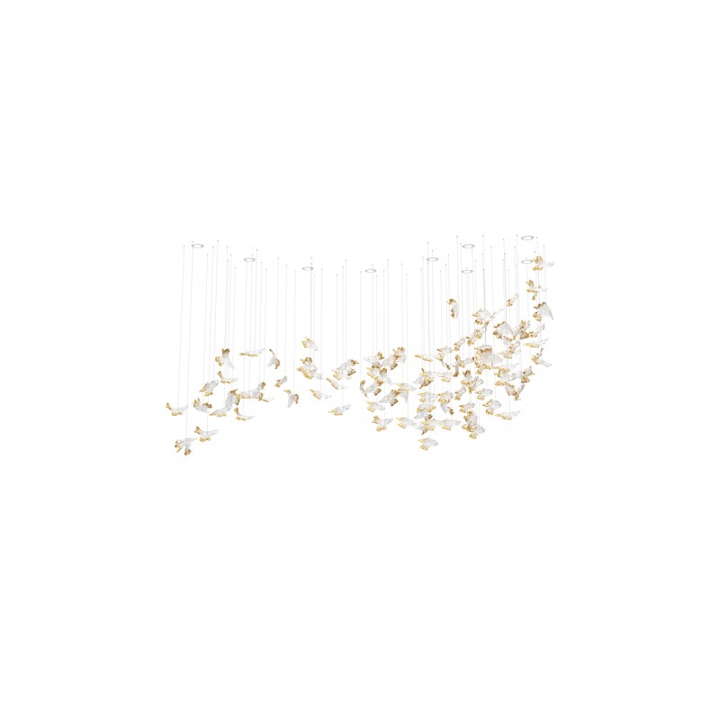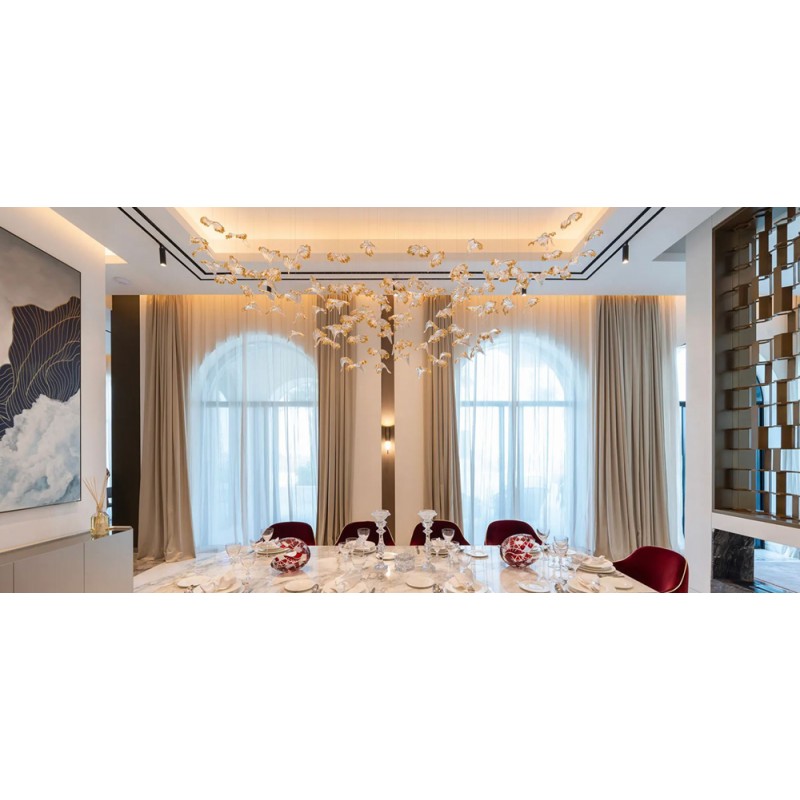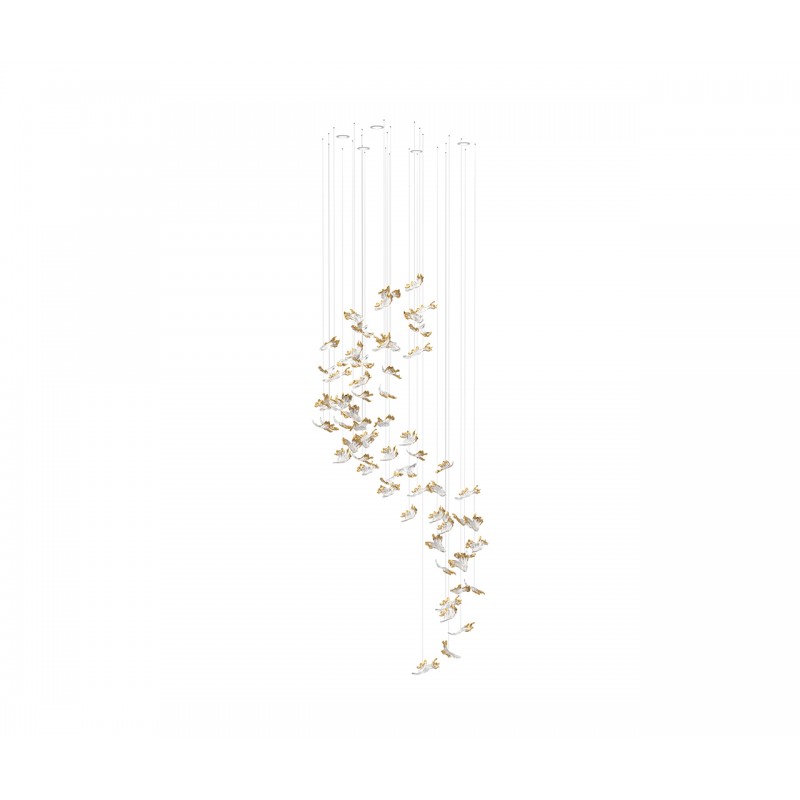 Crystal petals float to the ground like icy snowflakes. This series of installations shows how something delicate can have a powerful impact. Each crystal component is shaped and painted by hand, using glass coloring technology. Together, these fragile petals create a masterful installation to crown the interiors. A centerpiece fit for snow queen's palace, where the delicate and fragile hand-blown pieces glide suspended from the ceiling in various dreamy formations. The delicate artisan crystal glass components embody the fragility of flowers touched by the first frost. The icy effect intensified by adding a color gradient and gilded edge state true luxury. It is so crystal clear, gentle, and innocent, and on the other hand, it is unmanageable and spirited. Glass is glass, it always has its way.