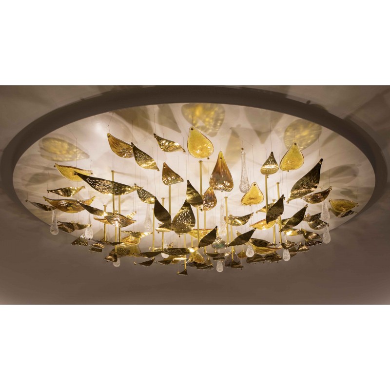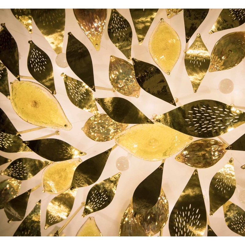 Material Handblown metallic and crackled amber glass lily petals, Hand-hammered matt and polished brass lily petals