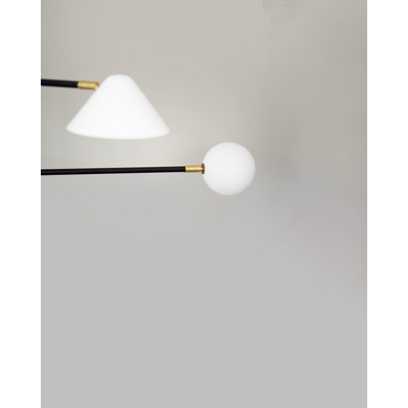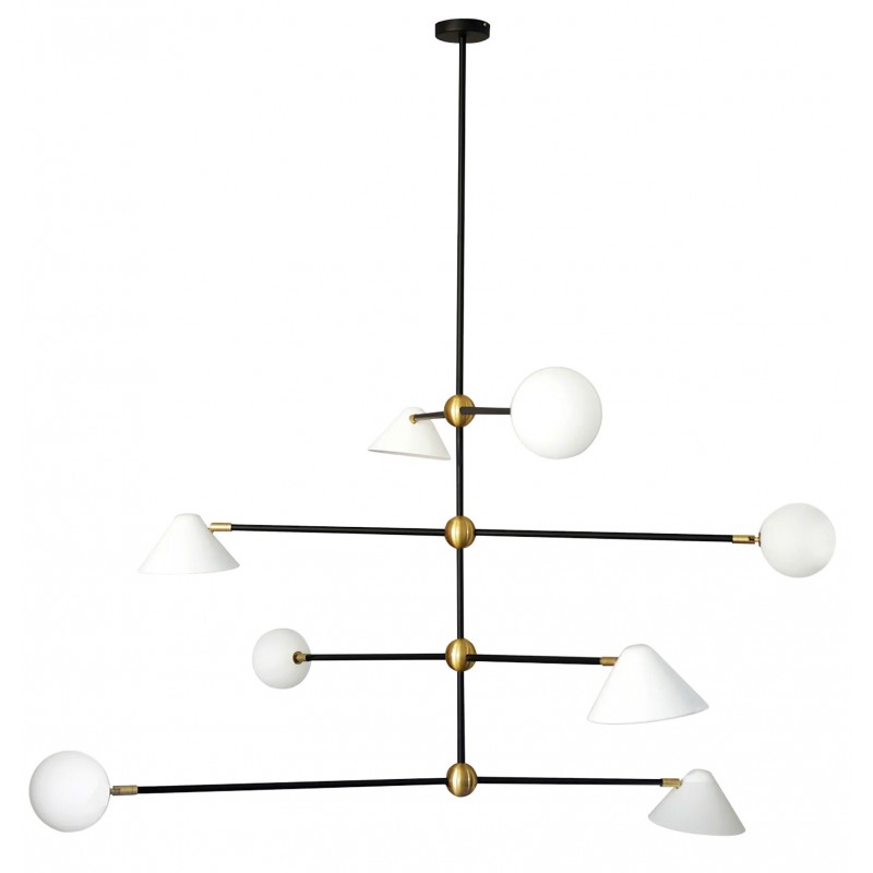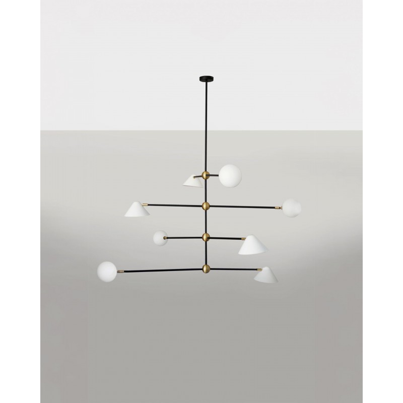 This modern pendant light can be customized to different size and finishes. It is shown in a pow-der-coated black metal finish with brass ball joints at the center. Each pole has a metal shade at one end and a frosted glass globe at the other.