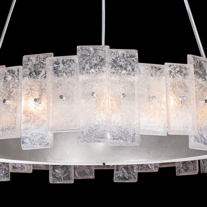 Silver leaf pendant inspired by mid-century architecture, blends modern and classic aesthetics. The feeling of rock crystal is evoked by studio cast glass highlighted by hand beveled edges, creating an architectural feeling to the glass. Timeless elegance sits at the core of this collection, allowing the pieces to add a little touch of glamour to a modern home and modernize a more traditional space.