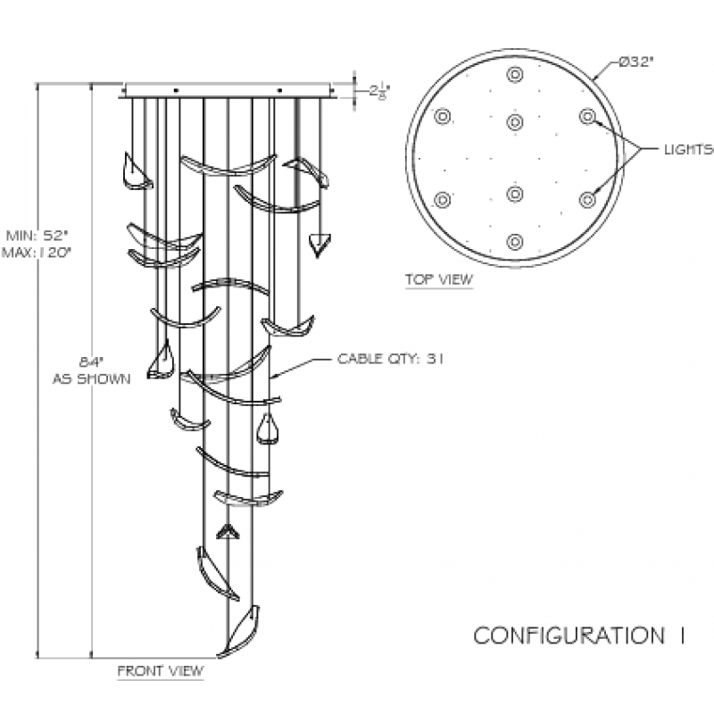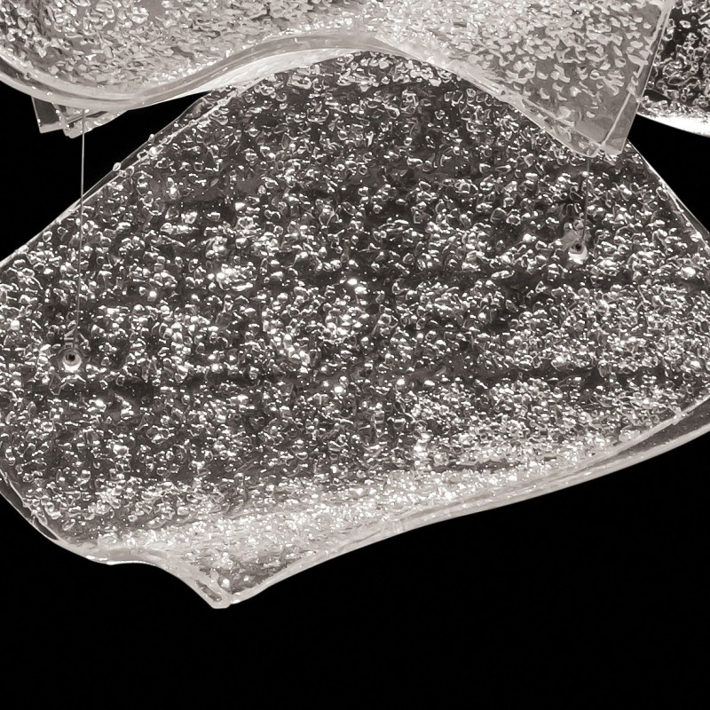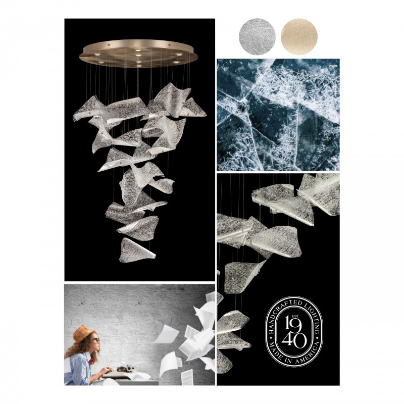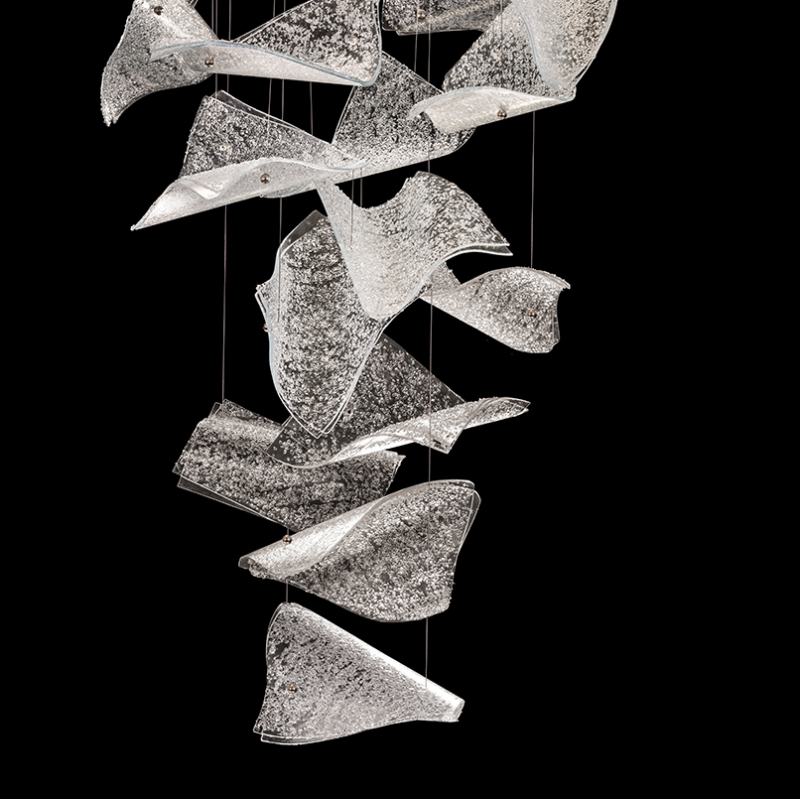 Frozen Pages” conceptually marks the moments in life we wish we could freeze in time. Each “Frozen Page” is composed of two pieces of fused glass covered with a layer of crystal frit creating a frozen look. By fusing and slumping multiple forms of movement, “Frozen Pages” appears to drift through a room creating flow and interest. Illuminated from a silver leaf canopy and suspended by adjustable cables. This American handmade round fixture features 20 glass “Pages” and is ideal for high ceilings.