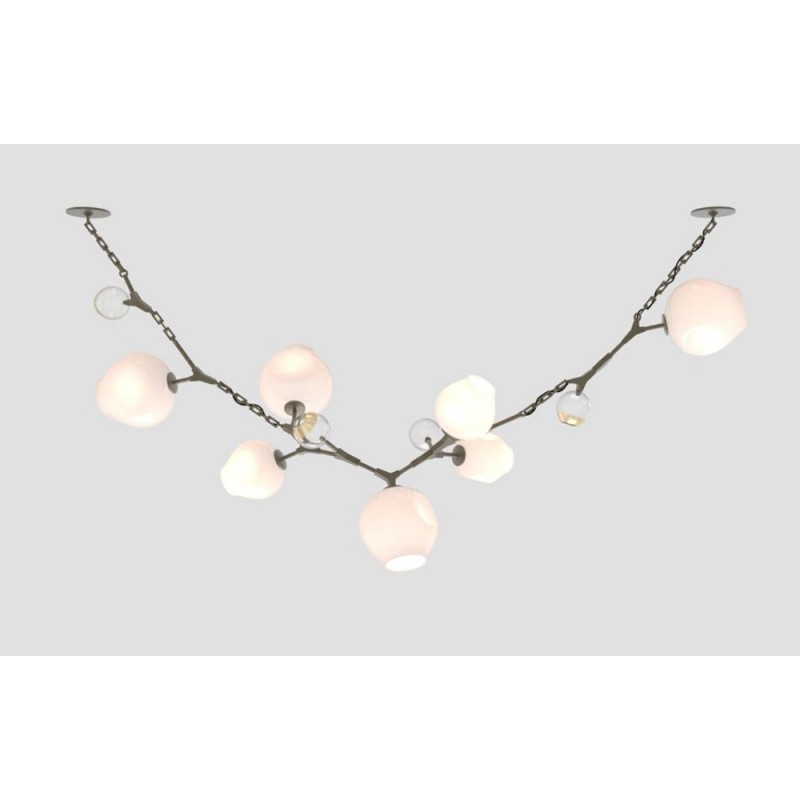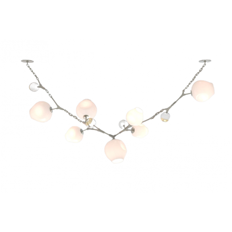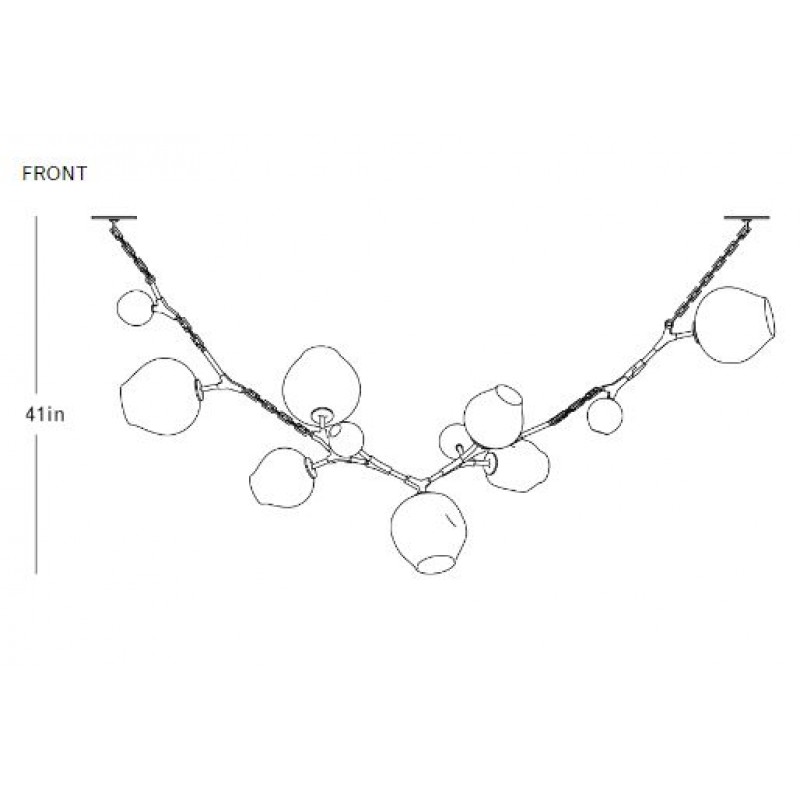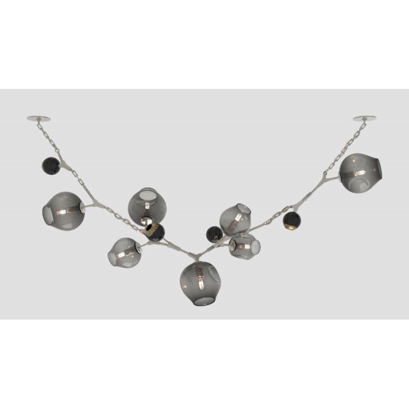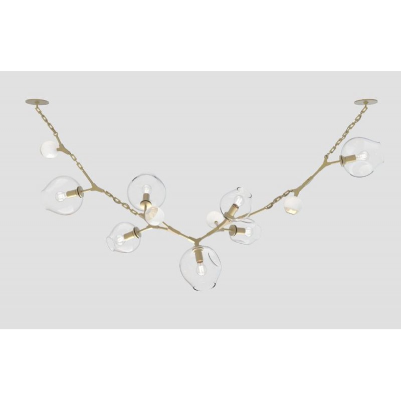 Burst embodies harmony and counterpoint. A celebration of contrasts, it uses the aesthetic language first developed for Branching Bubble, reinterpreted through its own dynamic geometry. A sharp-edged starburst, among its influences, are the elegant angles of medieval weaponry and the contrapuntal art of Ikebana—Japanese flower arrangement—where some stems are spikey and others nod in full bloom. The fixture echoes as well the jeweled brooches designed by the Parisian couturier Jeanne Lanvin in the 1930s, with weighty settings and a balance of bold real and faux gems. Hand-blown globes by Michiko Sakano alternate with glass spikes, as well as barnacle-like spheres rolled in 24-karat gold and finished with projections that resemble tiny bee stingers. With the luminous presence of dark bouquet lit from within, Branching Burst is moody yet buoyant, a bit rebellious, confident and expressive.