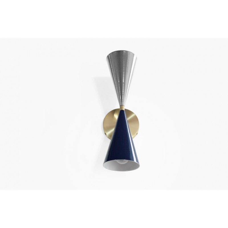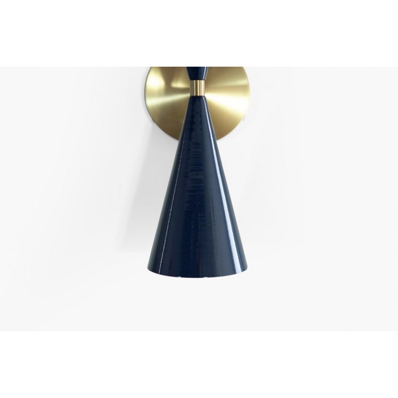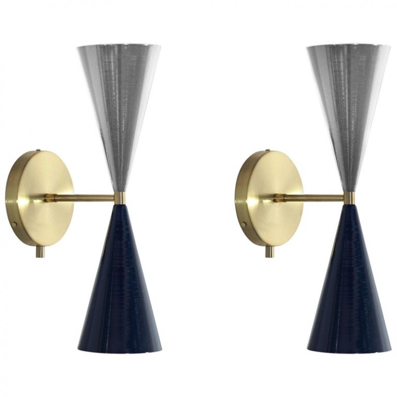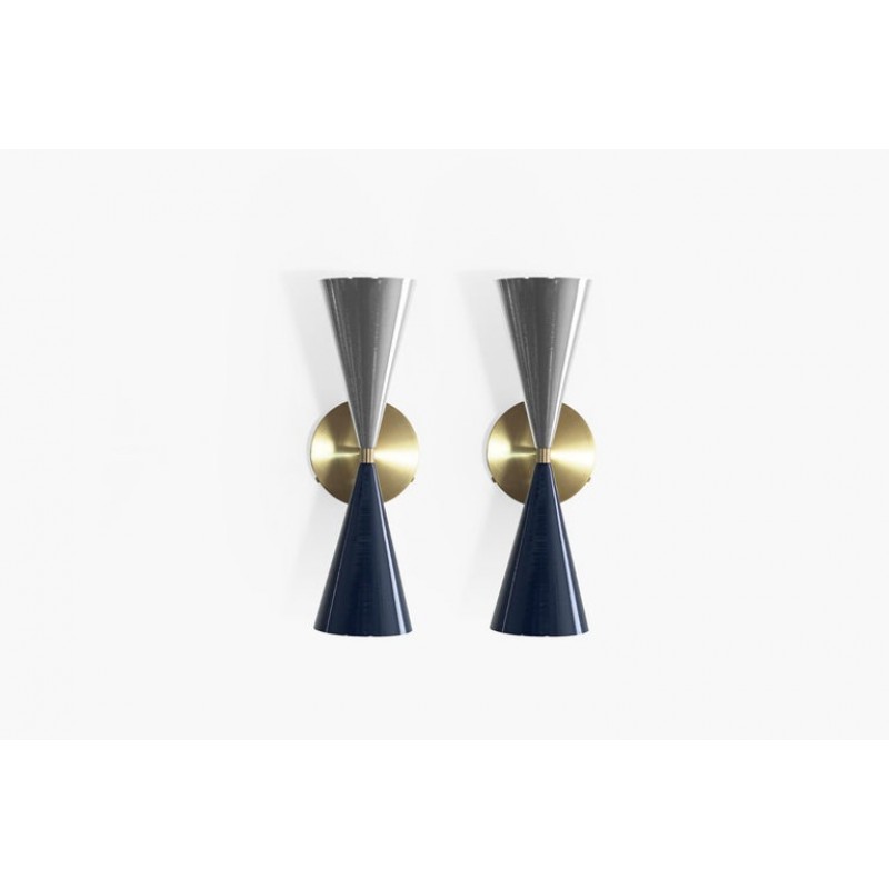 Both French and Italian Mid-Century Modernism strongly influences the "Tuxedo" wall mount sconce. Priced as a set of two. Shown in unlacquered brass and "Midnight" and "Dove" enamels.