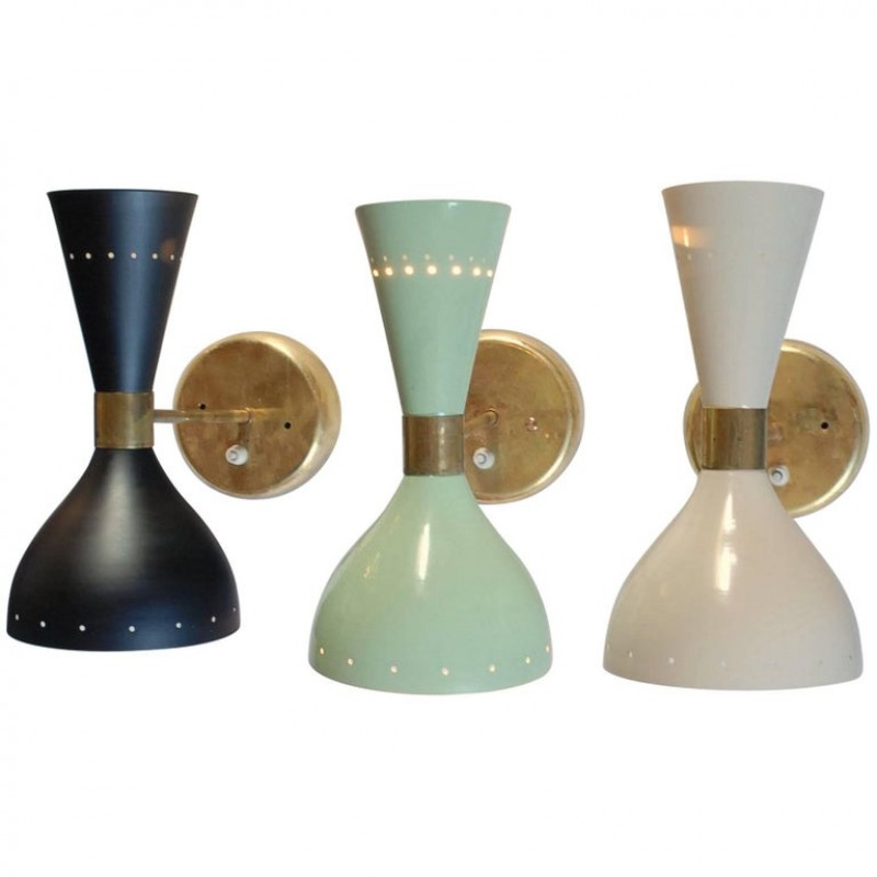 Shades: Each shade is made of two separate shades and is 11in/27.5cm tall. Carries two bulbs, a candelabra socket on the smaller upper cone and a either a regular socket or candelabra on the larger lower dome shaped shade. In alternative both can carry candelabra socket. Larger shade is 6in/15cms diameter/wide.