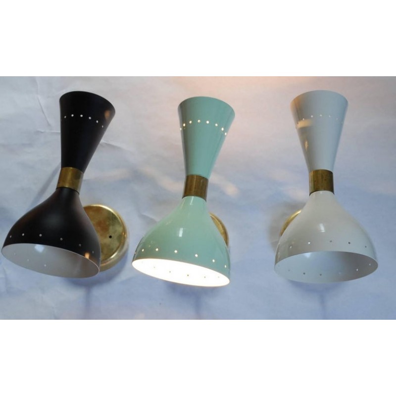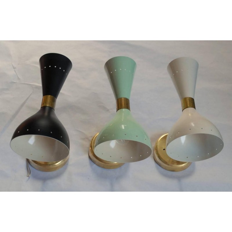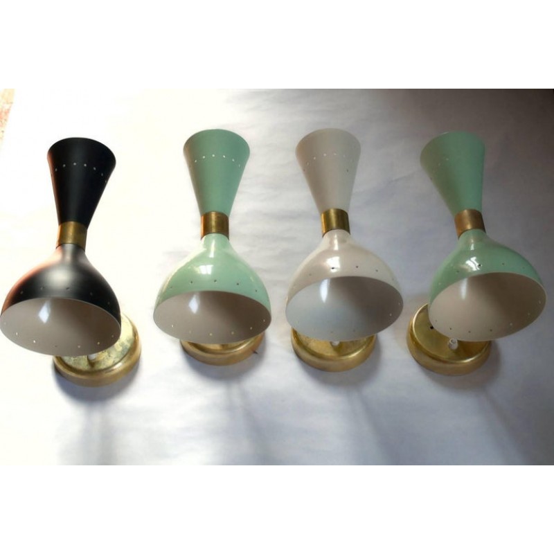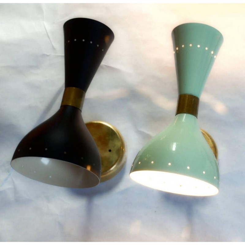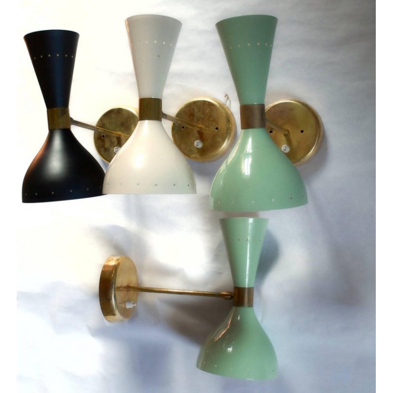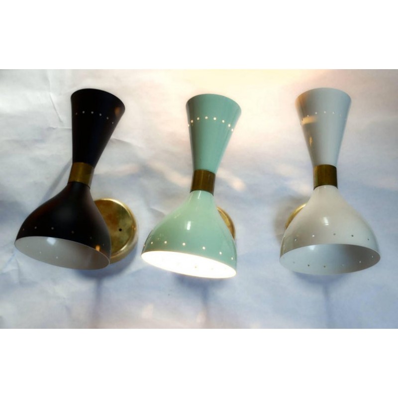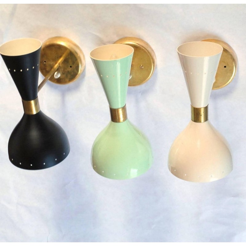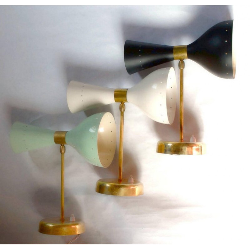 Shade have adjustable pivot head so that the output from the large shade can be directed to the desired area and the opposite would have ambiance light. Shades are made in spun aluminum with the typical line of small holes. Enameled with the colors of the 1950s palette. Ivory white, Black. For other colors available please inqury. Lacquered gold finish inside.