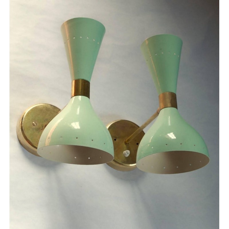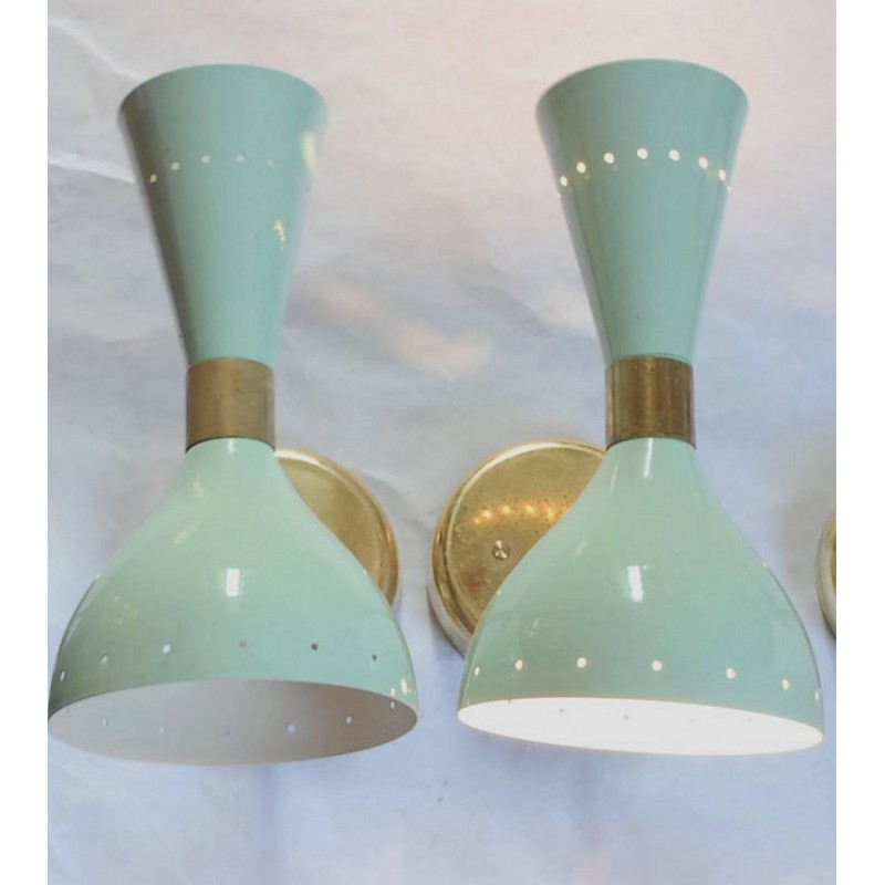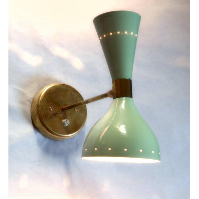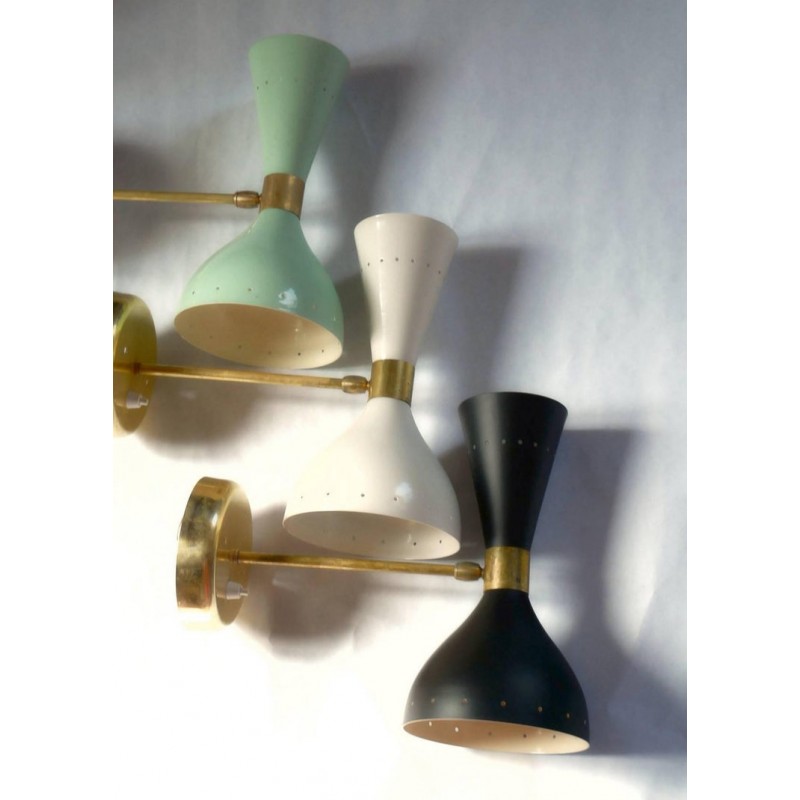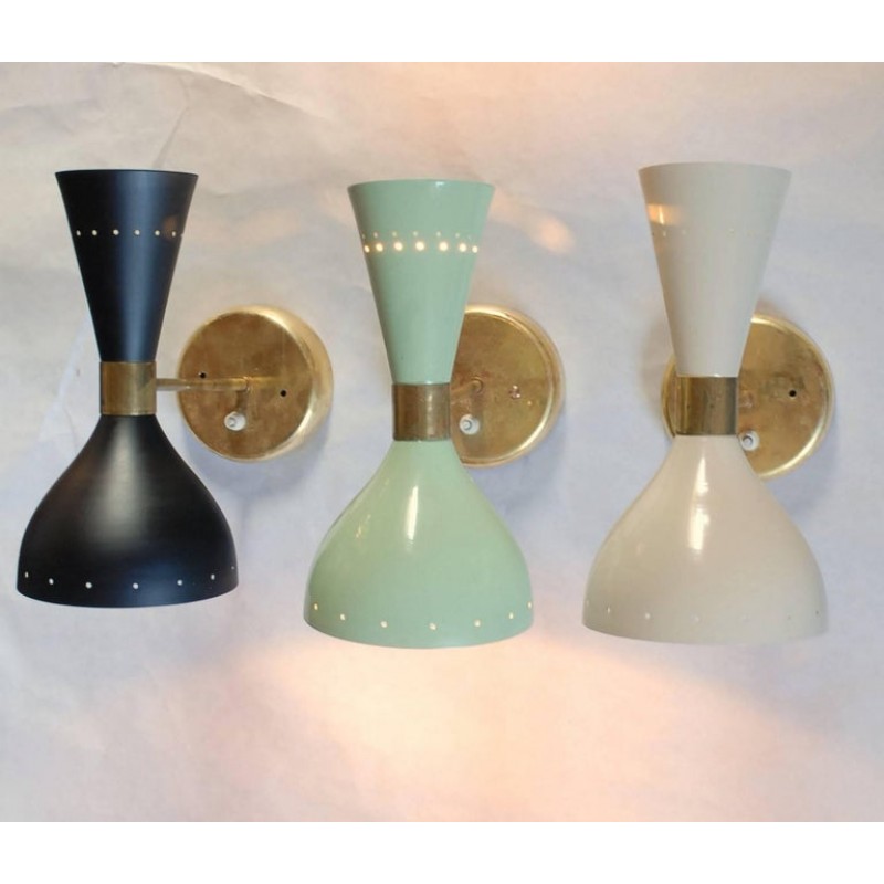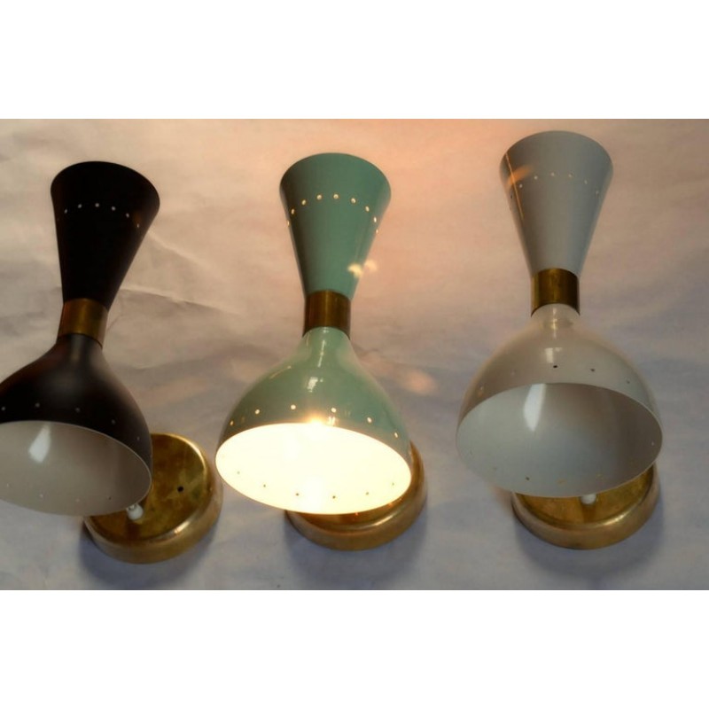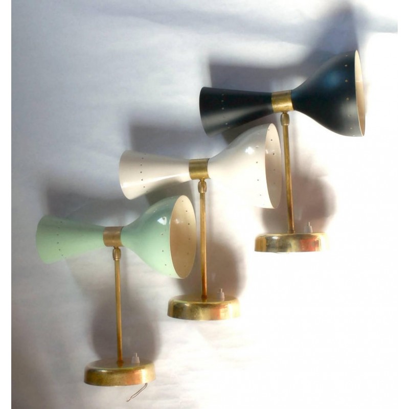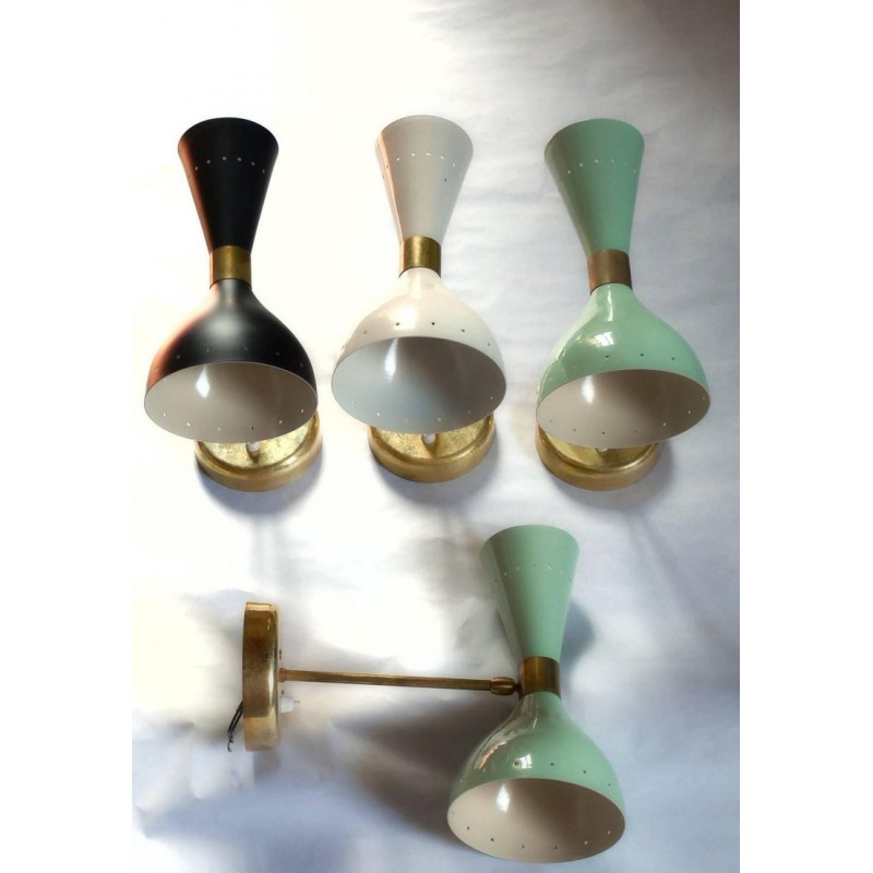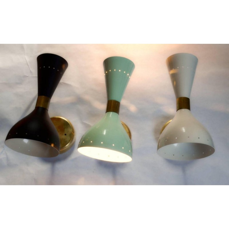 Shade have adjustable pivot head so that the output from the large shade can be directed to the desired area and the opposite would have ambiance light. Shades are made in spun aluminum with the typical line of small holes. Enameled with the colors of the 1950s palette. Ivory white, Black. For other colors available please inqury. Lacquered gold finish inside.