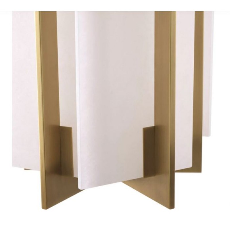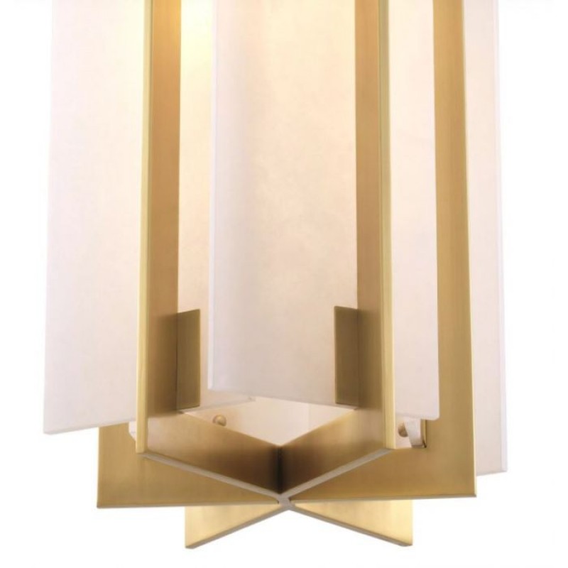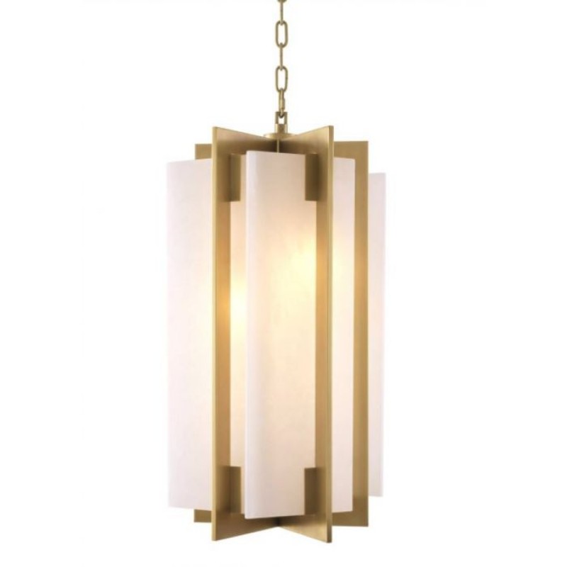 Chandelier Lugano is a truly unique piece. This 5-light hanging pendant comes in an antique brass finish and features stylish geometric shades with inserts of translucent alabaster. Each lamp hangs on an antique brass chain that is adjustable in height.