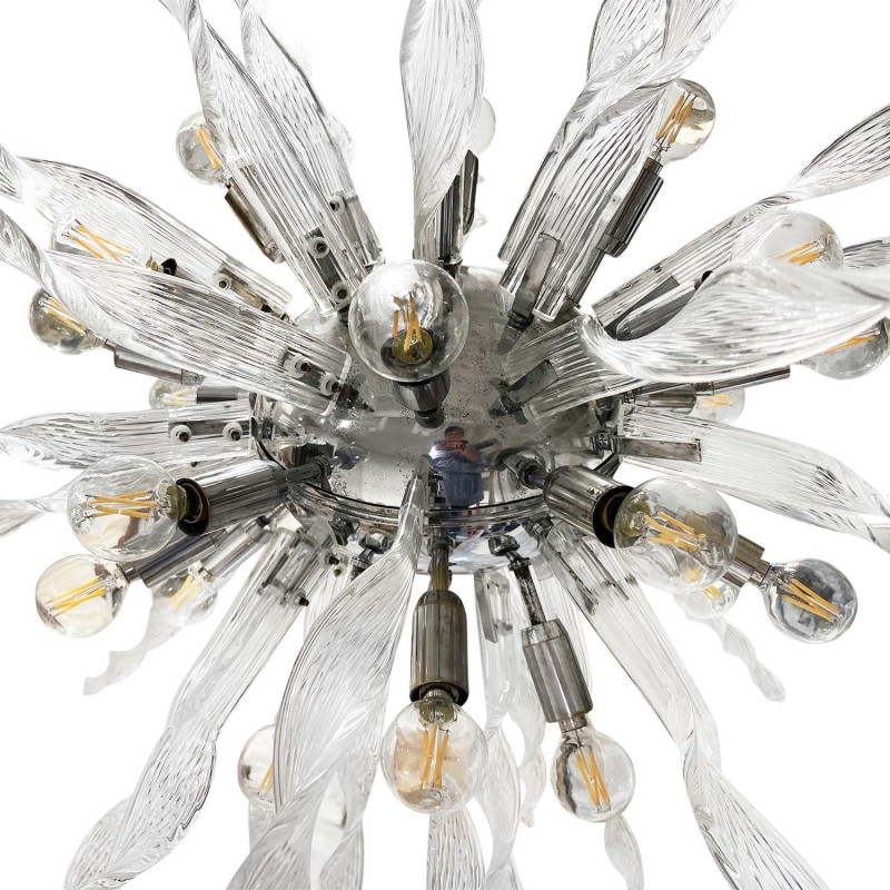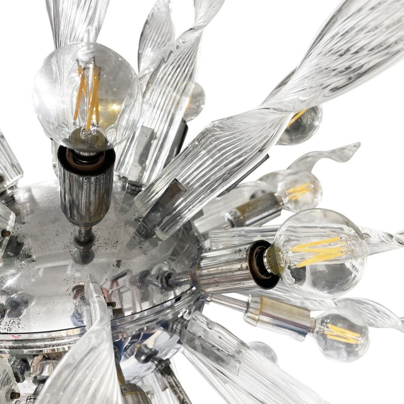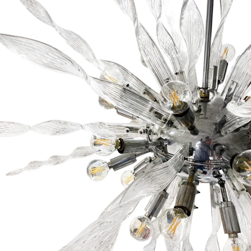 A clear, vintage Mid-Century modern Italian Sputnik chandelier, pendant made of hand blown Murano glass in style of Barovier & Toso, in good condition. Each glass rays are halted by the round chrome base, frame. The ceiling light, lamp is composed with a twenty four light socket. The wires have been renewed. Wear consistent with age and use. Circa 1940 - 1950, Murano, Italy.
