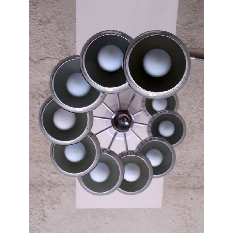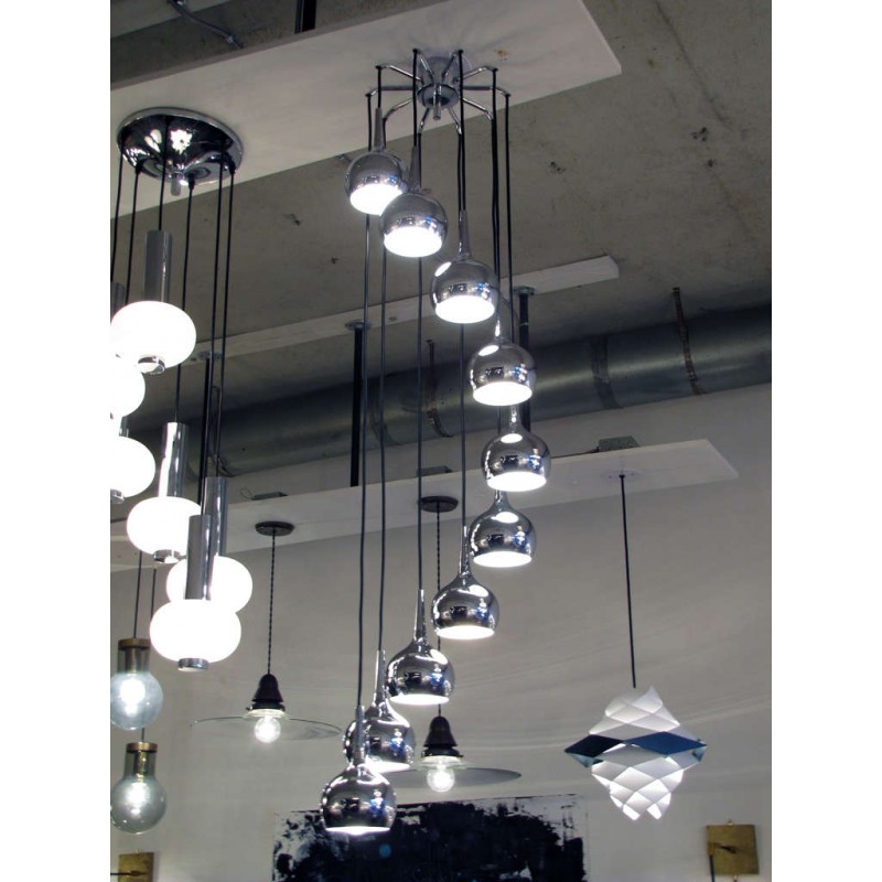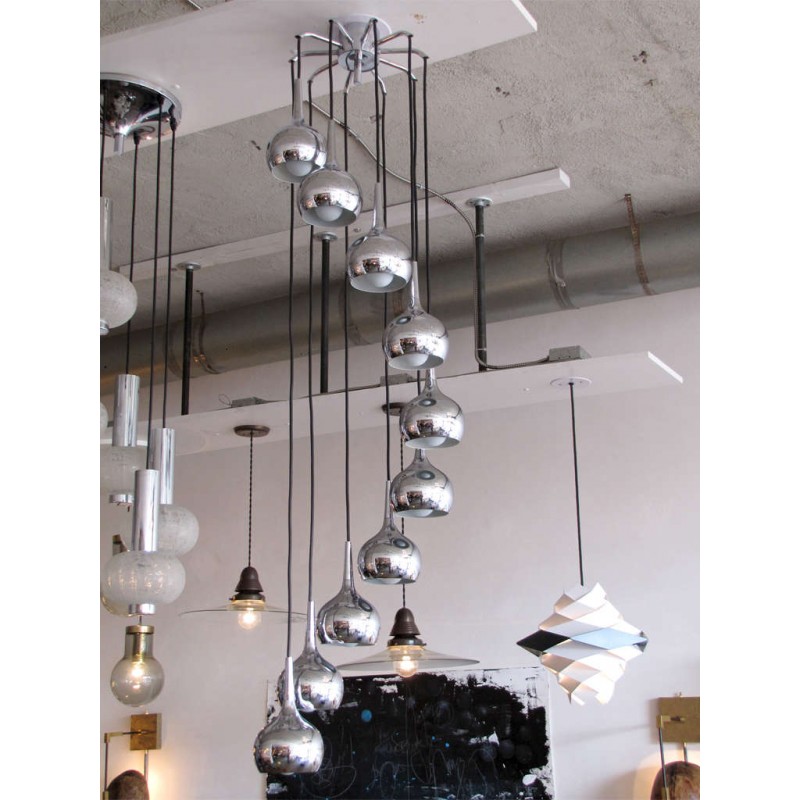 Stunning 1960s cascading chandelier attributed to Hans-Agne Jacobsson, with ten individual drop-shaped chrome plated pendants measures: 7.5in. x 4.5in., adjustable in length and configuration, current total drop 56″.