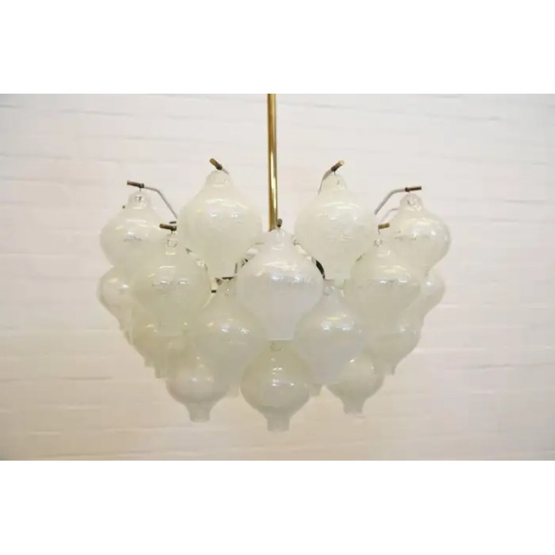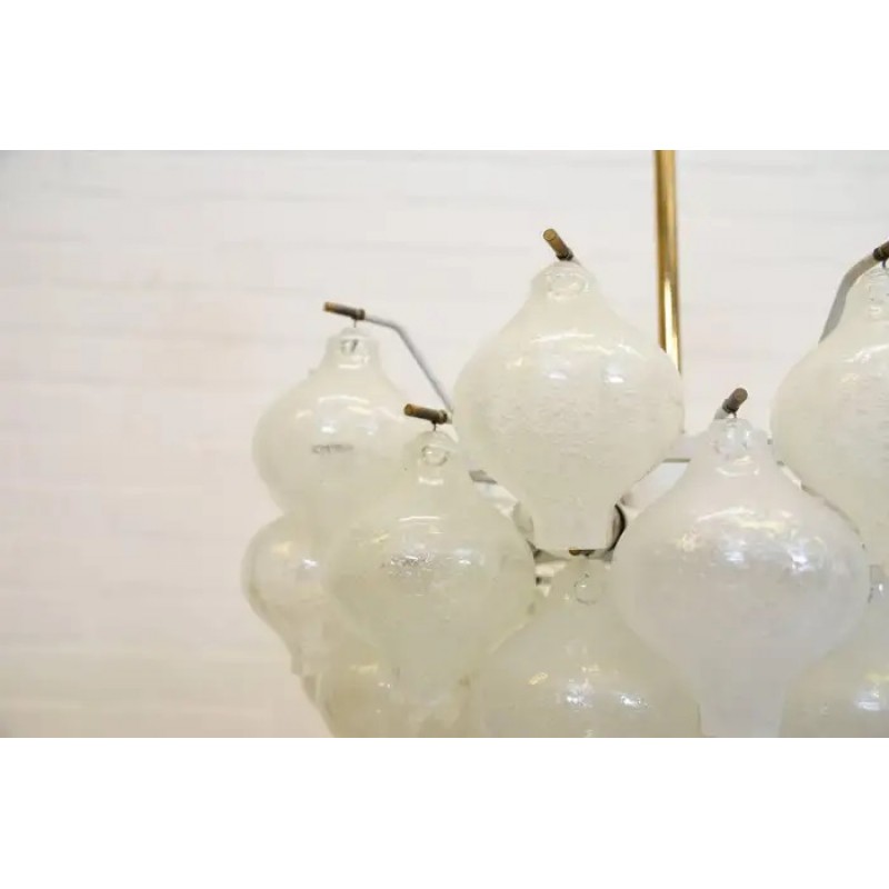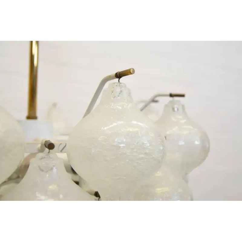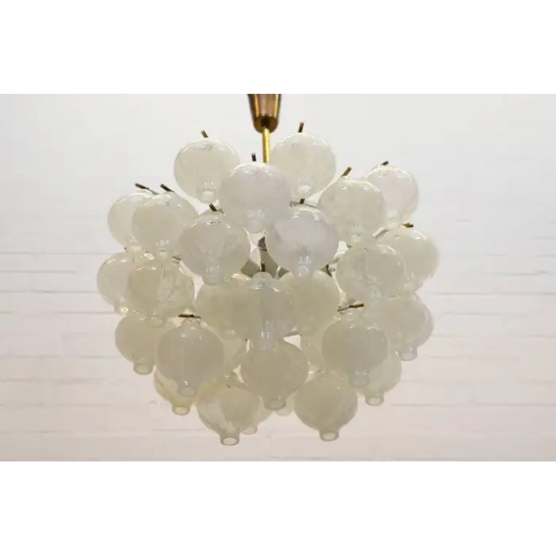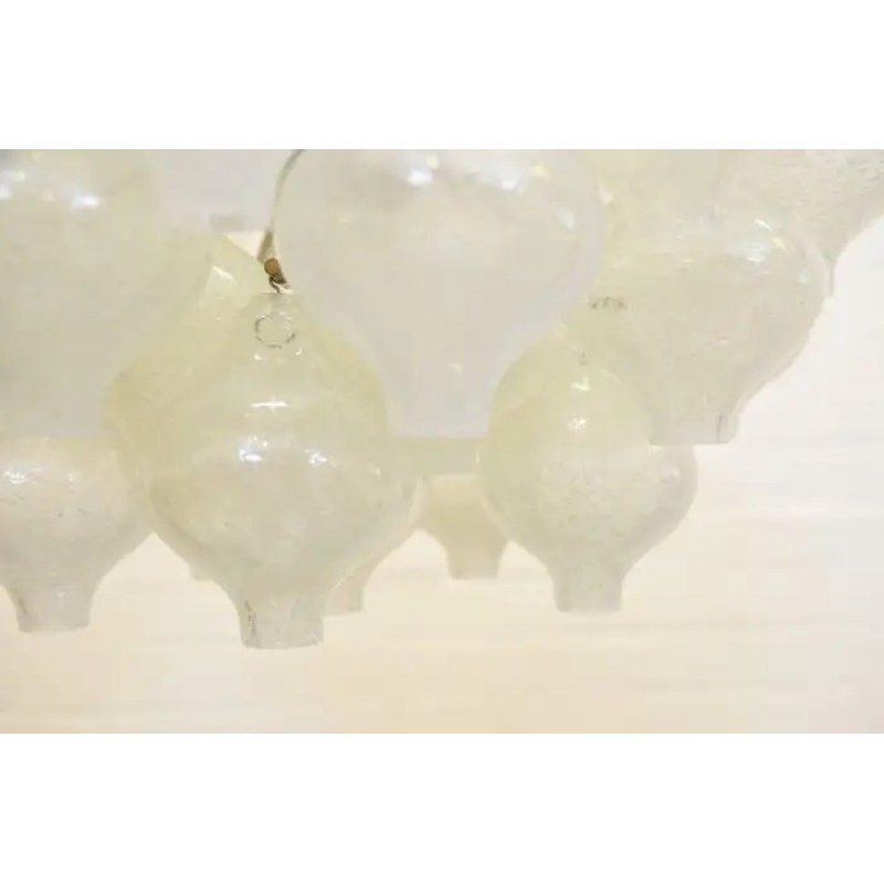 Beautiful shaped chandelier with 41 handblown glass spheres hanging on a white metal frame. Thanks to the ten light bulbs covered by the glass elements the lamp spreads a beautiful light and shadow on wall or ceiling.