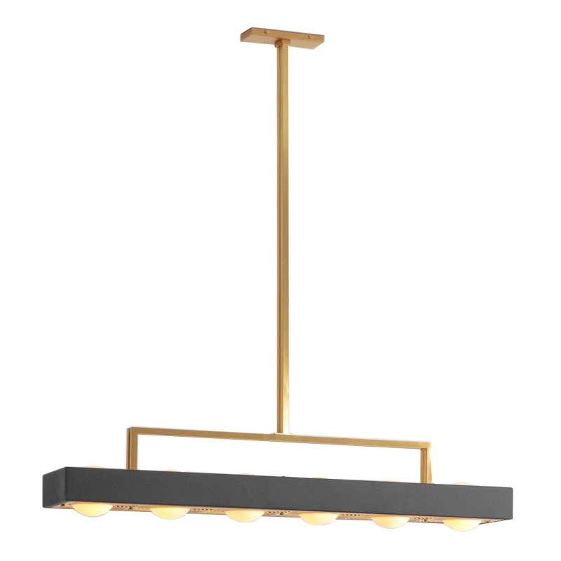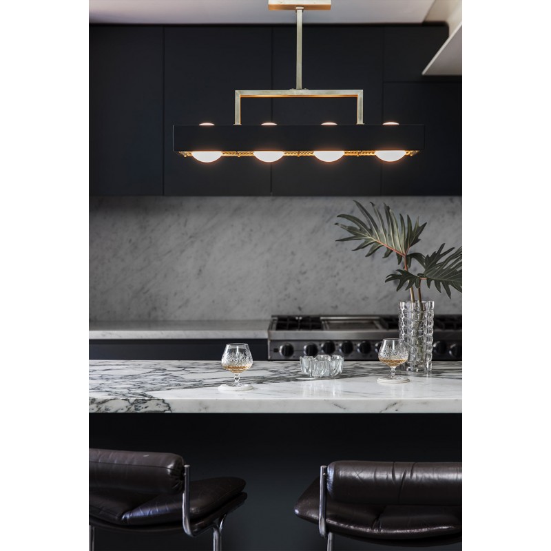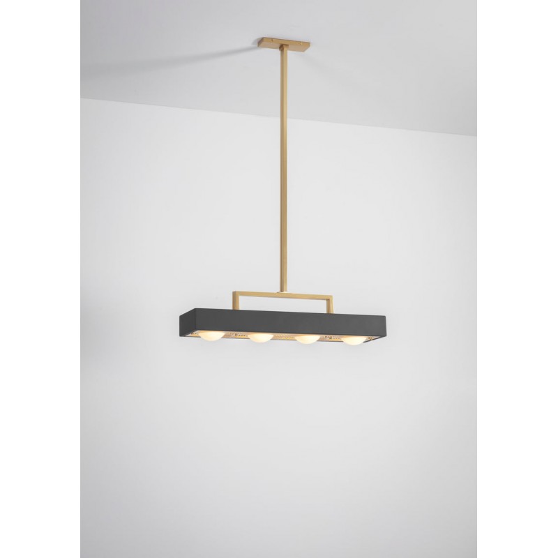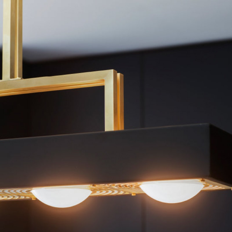 Clean, simple lines and repeating shapes. Kernel is composed of intersecting horizontal and vertical lines and geometric forms. Four opal glass spheres framed within a matte lacquered rectangular shade. Laser cut brass diffuser echoes the shape of the encased spheres, fluid and curving. An unexpected twist.
