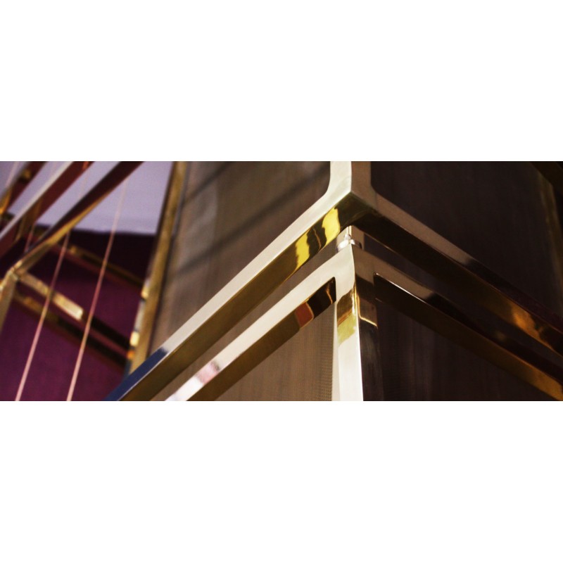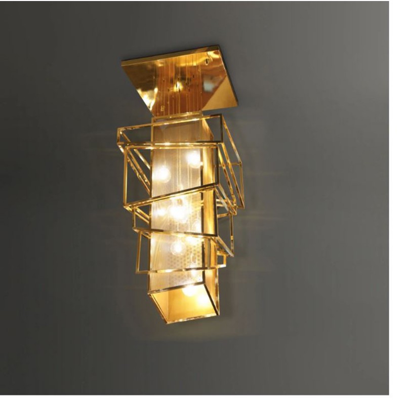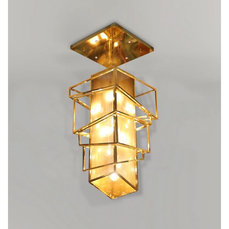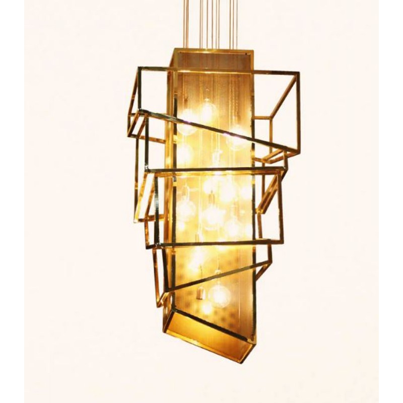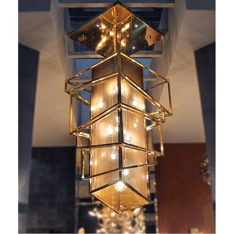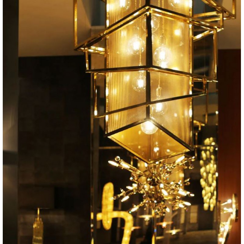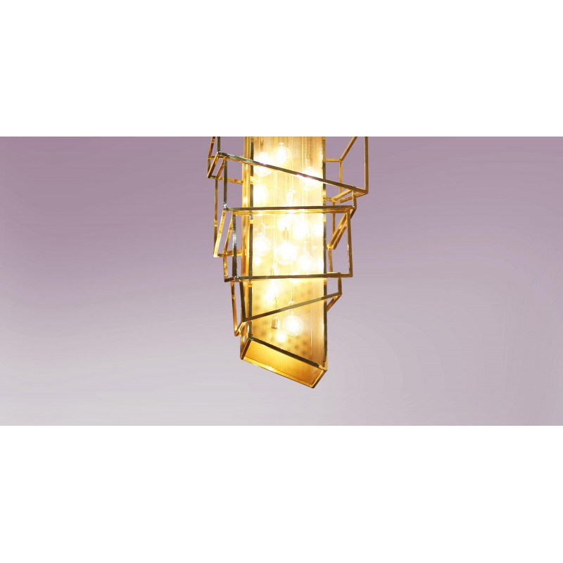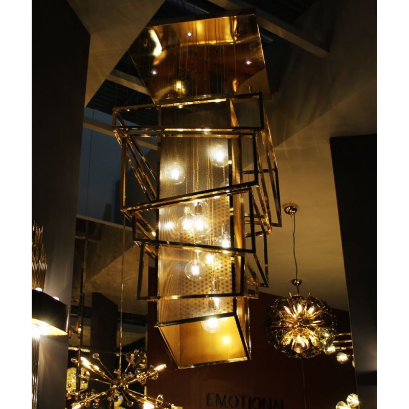 The Beijing chandelier is a grandiose modern lighting piece, which features a perforated stainless steel shade, involved by an asymmetric polished brass structure. The Beijing contemporary chandelier is a seductive lighting piece, perfectly suitable for any luxury interior décor. Large or small, our team can meet the challenge, and can even coordinate the production of a private collection, where all finishes are kept consistent.