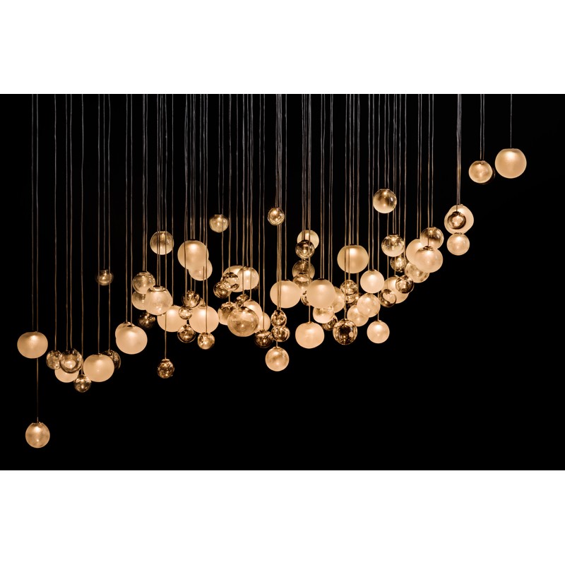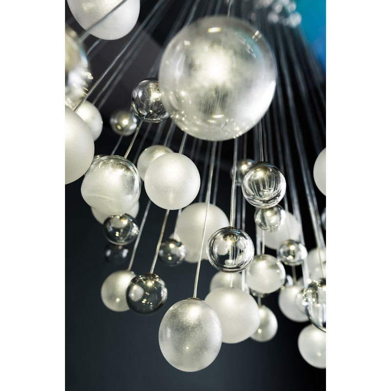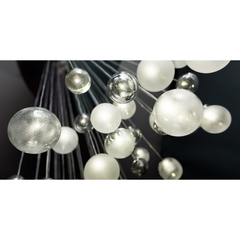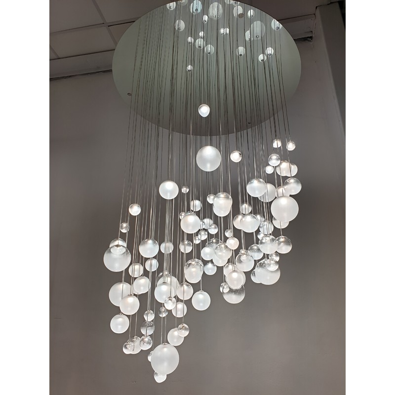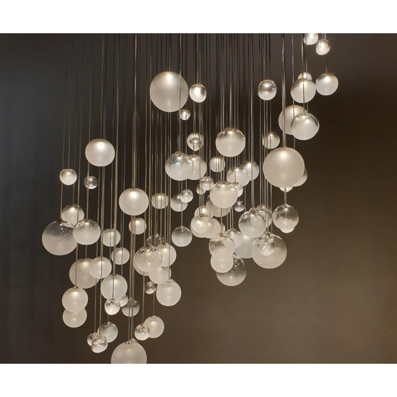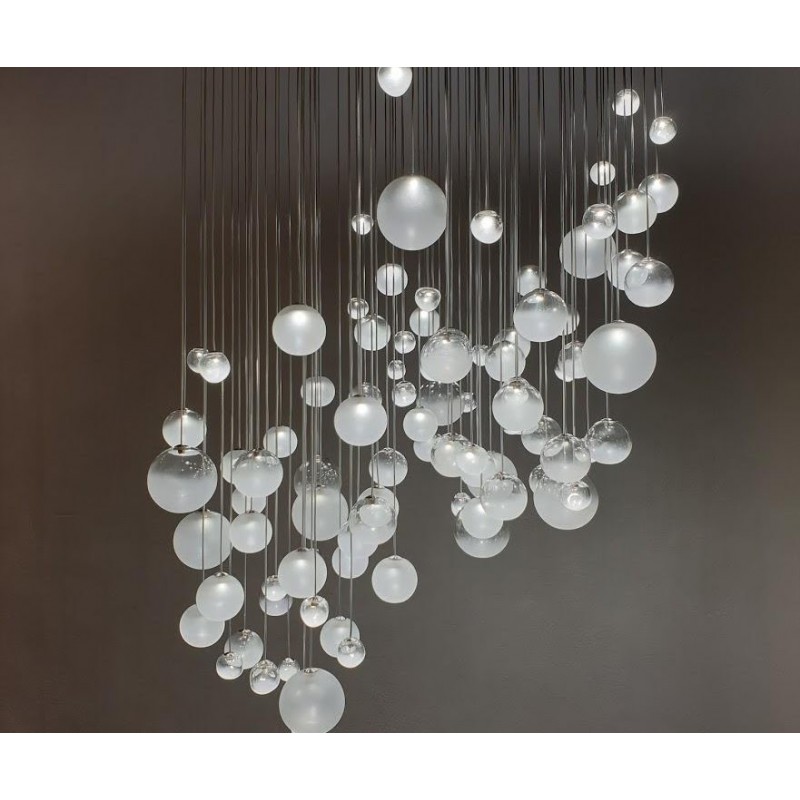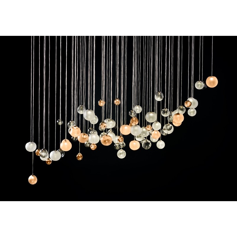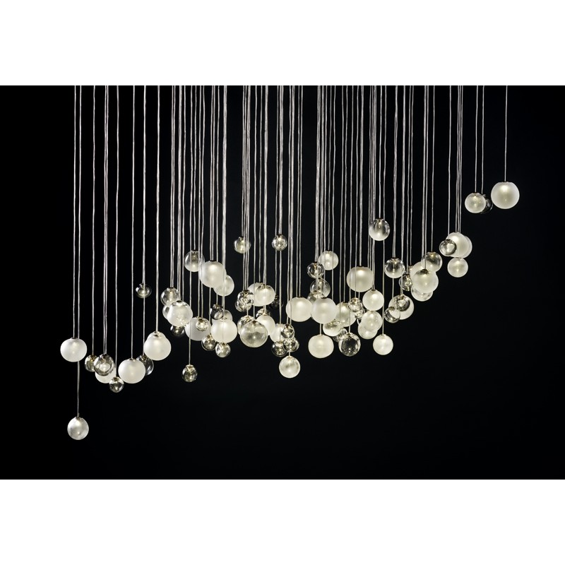 You will certainly appreciate the beauty of individually hand-blown pieces that have been skillfully sandblasted by hand to a variety of patterns. Delicately positioned in a wavelike (or random) pattern and with a mixture of sizes and finishes, these glass pieces will seduce you into the entire lure. Wavelike composition or a randomly placed pieces of individually LED powered pieces, are great to be placed above a dining table, in the living room or in your reception area.