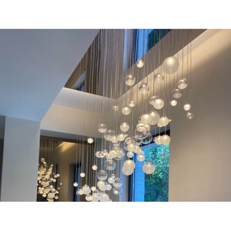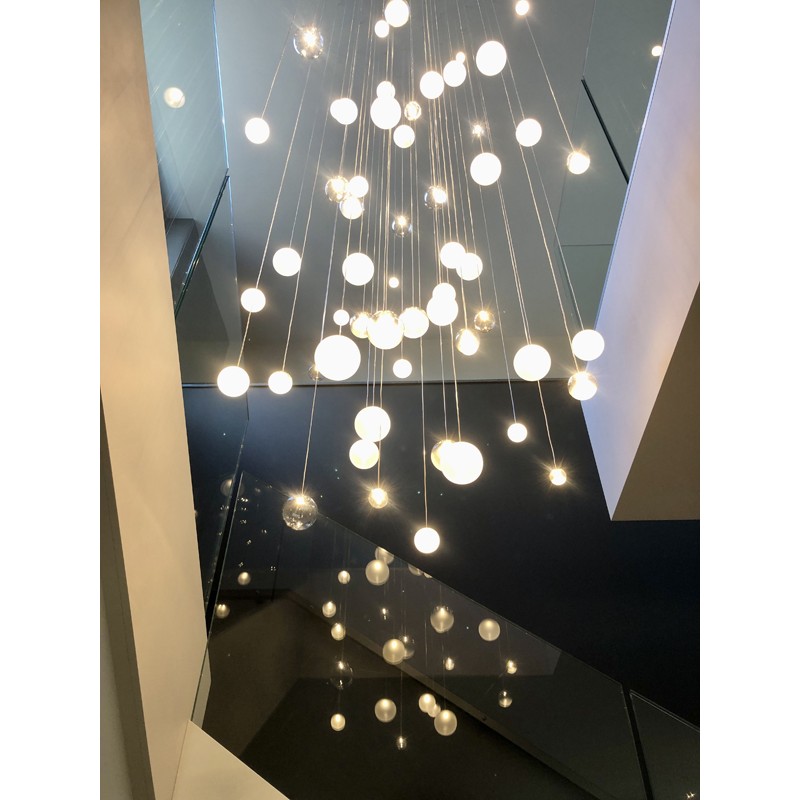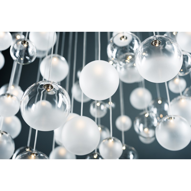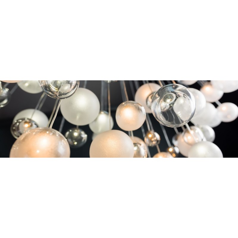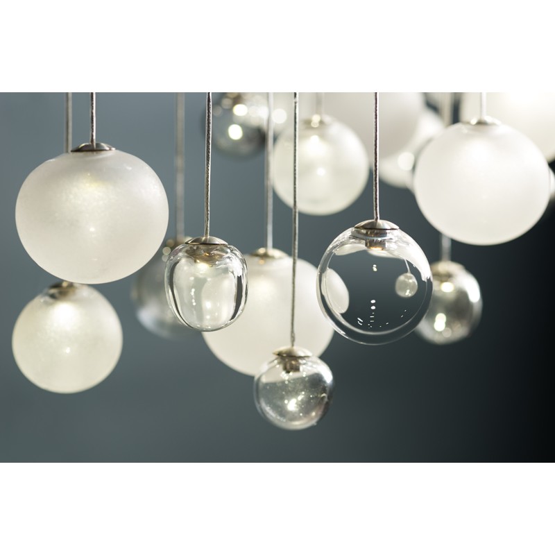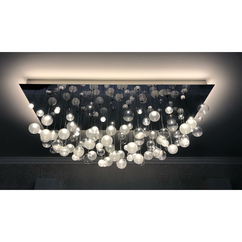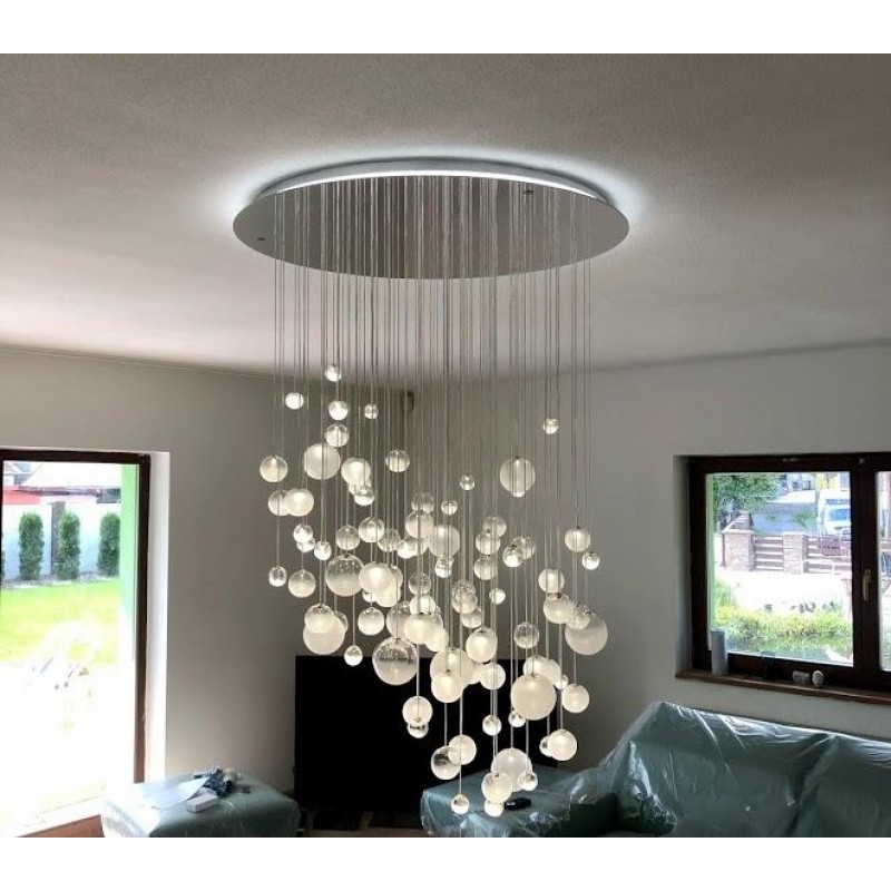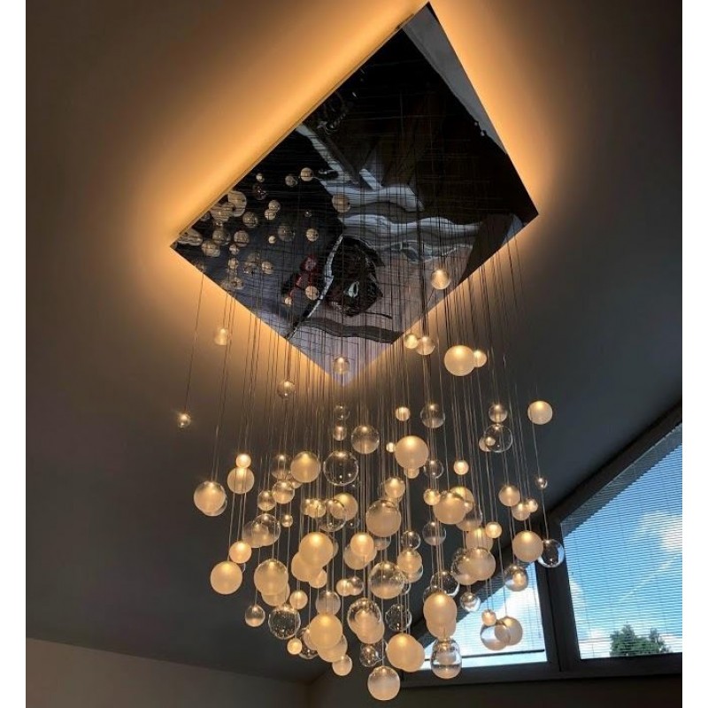 You will certainly appreciate the beauty of individually hand-blown pieces that have been skillfully sandblasted by hand to a variety of patterns. Delicately positioned in a wavelike (or random) pattern and with a mixture of sizes and finishes, these glass pieces will seduce you into the entire lure. Wavelike composition or a randomly placed pieces of individually LED powered pieces, are great to be placed above a dining table, in the living room or in your reception area.