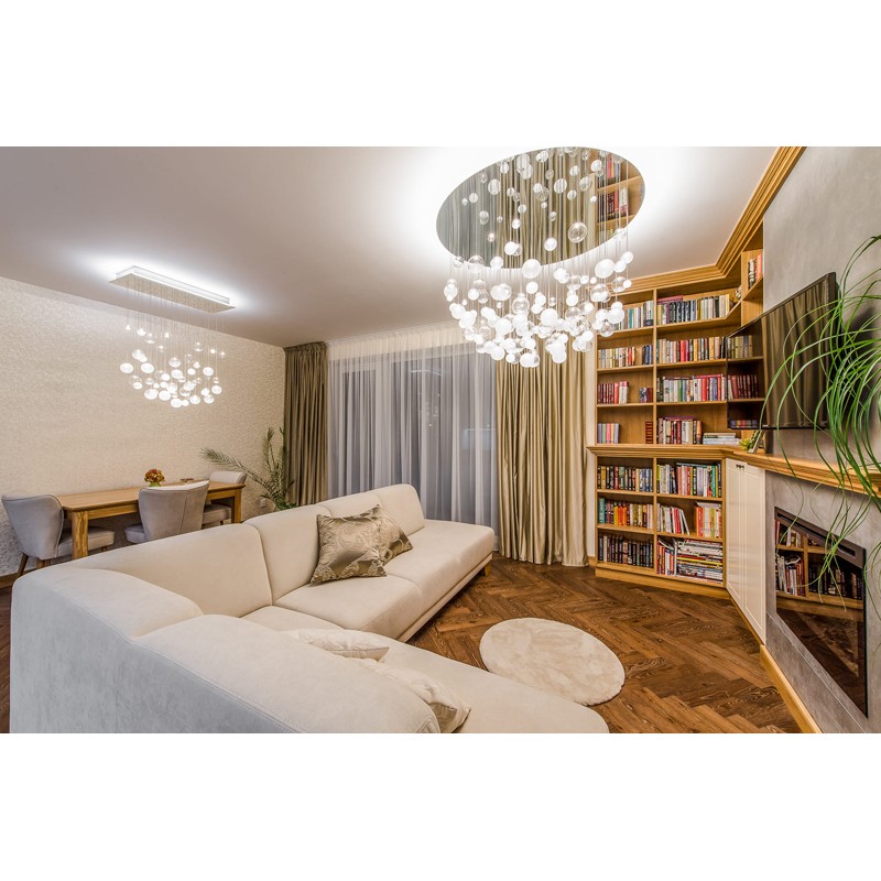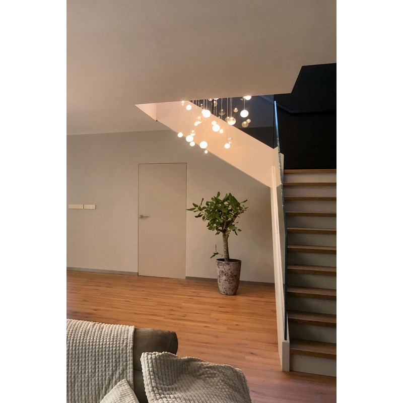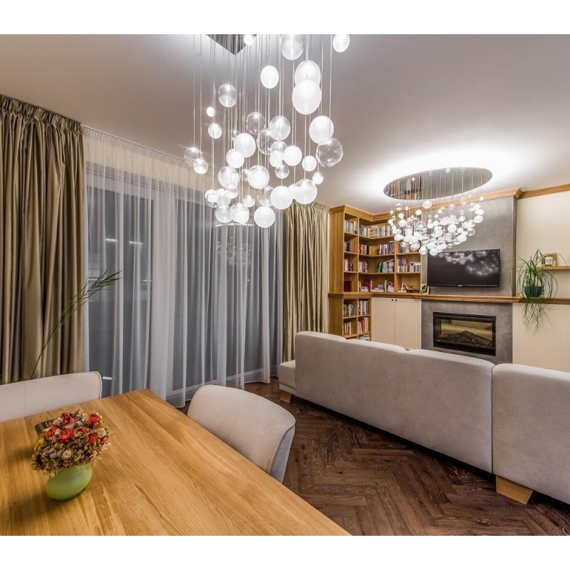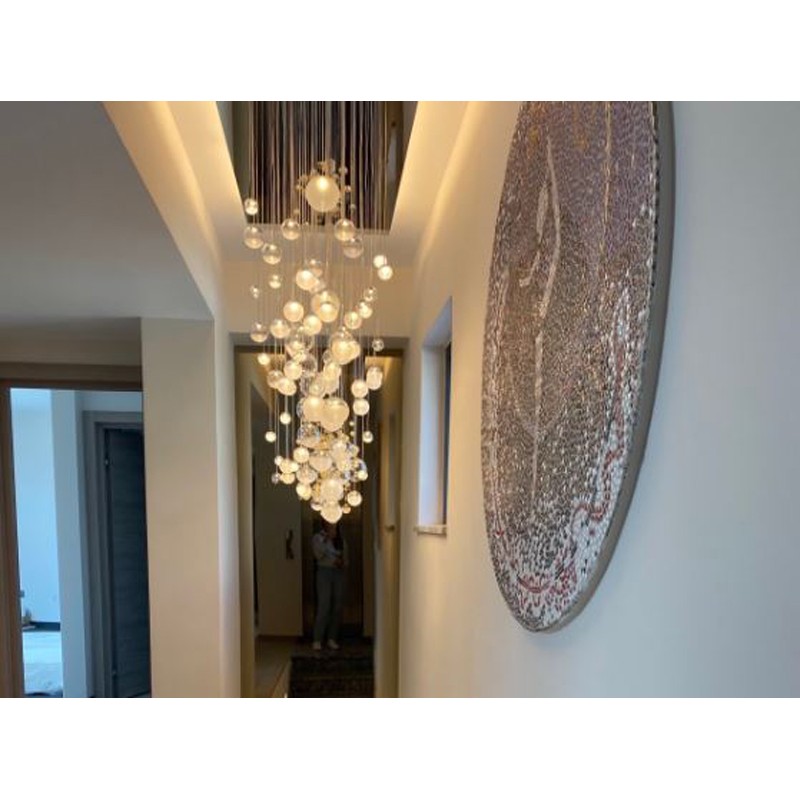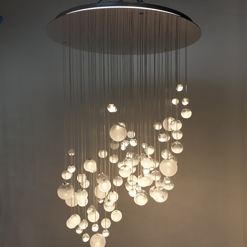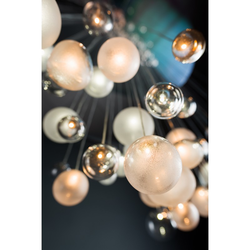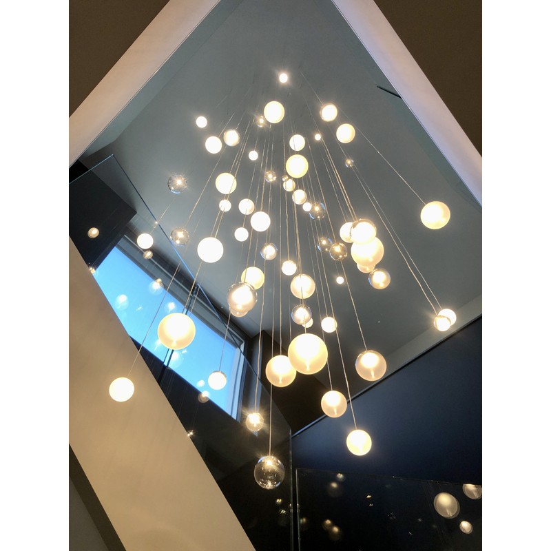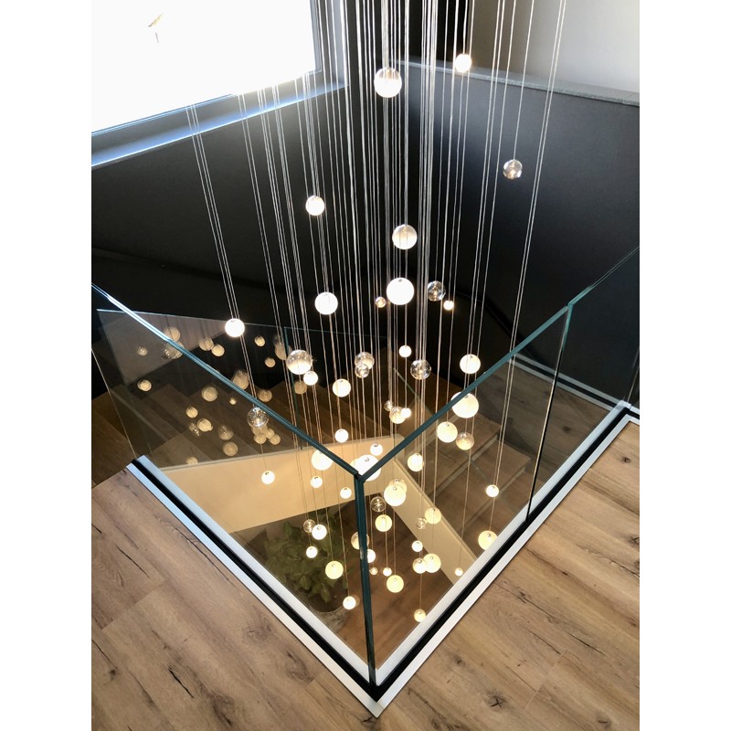 You will certainly appreciate the beauty of individually hand-blown pieces that have been skillfully sandblasted by hand to a variety of patterns. Delicately positioned in a wavelike (or random) pattern and with a mixture of sizes and finishes, these glass pieces will seduce you into the entire lure. Wavelike composition or a randomly placed pieces of individually LED powered pieces, are great to be placed above a dining table, in the living room or in your reception area.