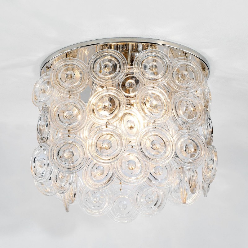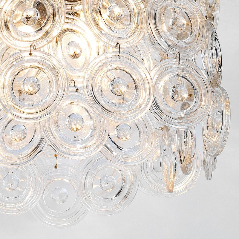 The planets of the solar system inspired this light, constructed with a series of circular glass pieces. Each one is handmade to fit seamlessly with the other, and produce its cascading effect. The brass frame has a nickel-plated finish. Each piece of glass is hand-shaped and formed to lock together. The pressed glass discs link together and overlap to give a beautiful waterfall effect.