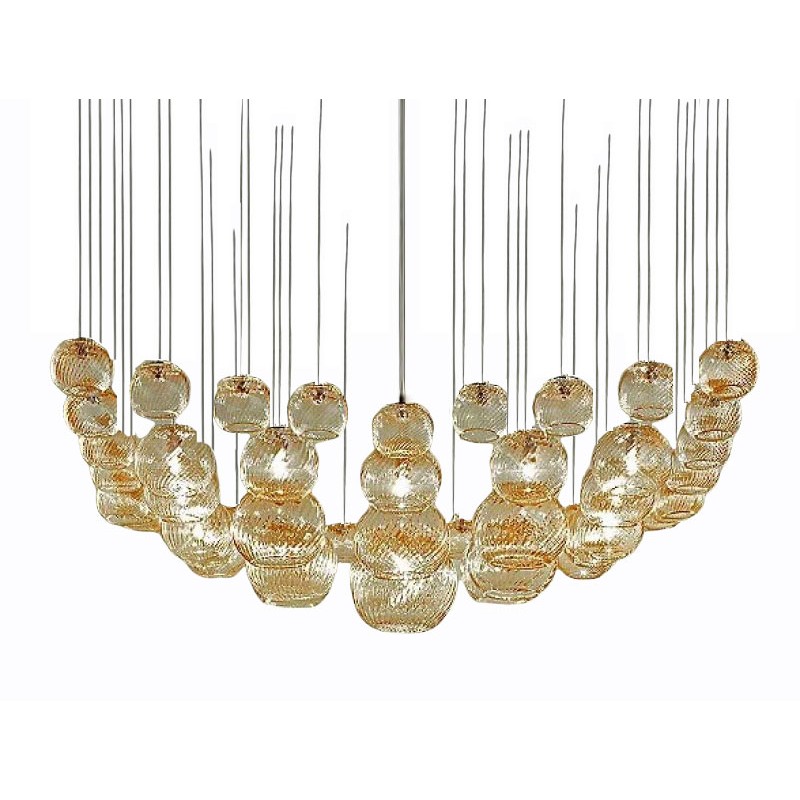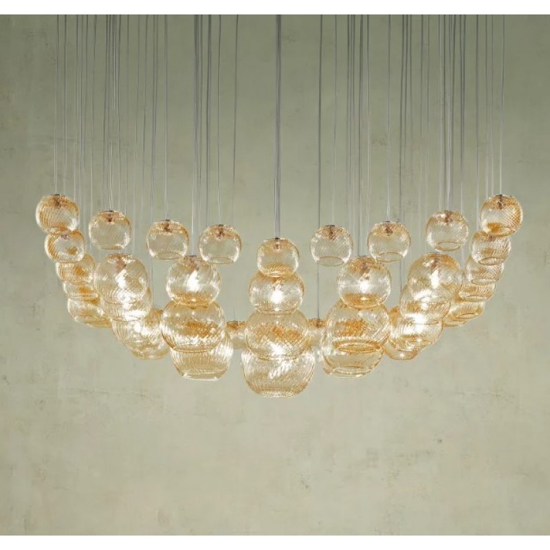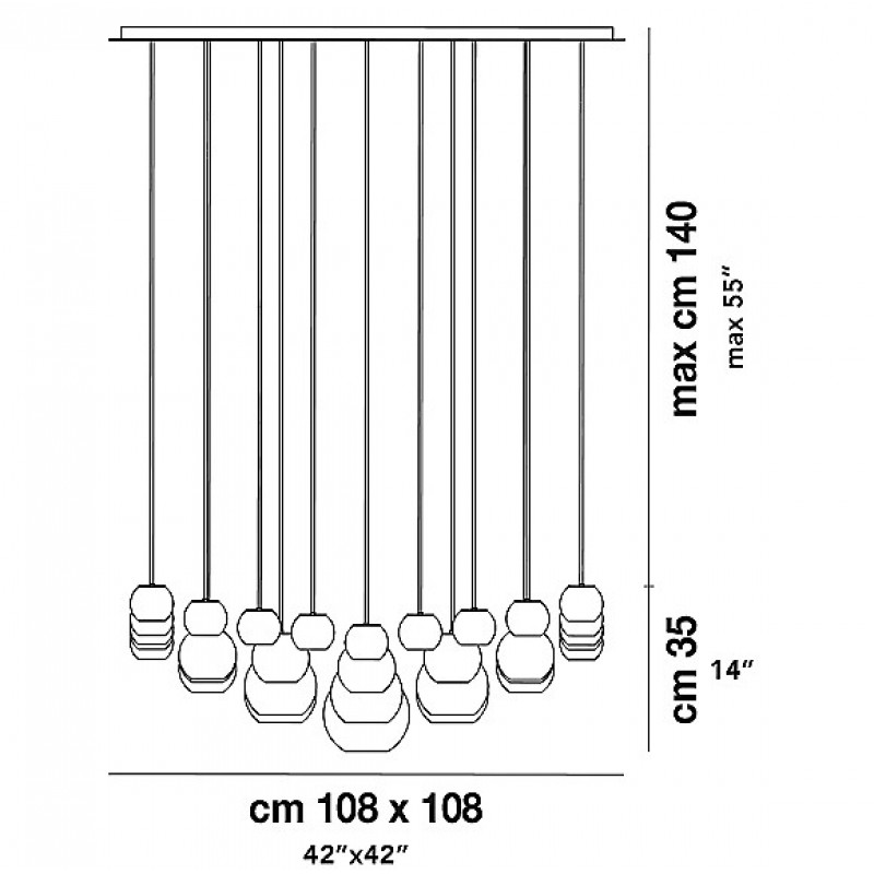 The Oto SP Surface Chandelier is made of blown glass spheres in four different sizes hung at different heights on a square canopy. The outer edge of the square is made of thirty-two 3.5” spheres, followed by an inner square of sixteen 5” spheres, then another smaller square of eight 6” spheres, and one 7” sphere in the center. Features 17 light sources inside certain spheres. A great statement piece for use in modern living rooms, dining areas and entryways. With a characteristic blend of industry, creativity and tradition, Vistosi invests in new production methods to create Italian lighting with uplifting artistry. Their products, which range from mouth-blown pendants to wall sconces with handmade, glass links, are truly heirloom-quality designs.