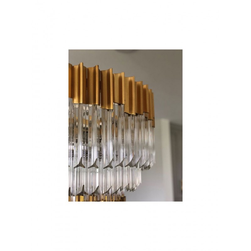 The Charisma Grand Entrance Chandelier from Corbett Lighting is a classic Hollywood Regency styled fixture with gold leaf finished stainless steel. Adorned with clear crystal flutes. Original One of a Kind Design Chandelier. No two alike, each chandelier in this design is a one of a kind. This hanging light looks interesting from any angle, and makes nice shadows. One of the technically most particular chandeliers created. We approach this sculptural object in a contemporary, unexpected and creative way. Light and shadow interplay and exist together, there is a subtlety of using both to manipulate space and thought.