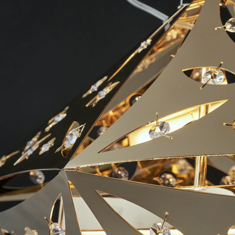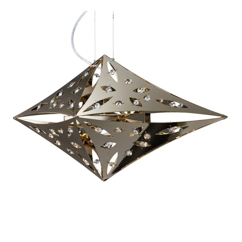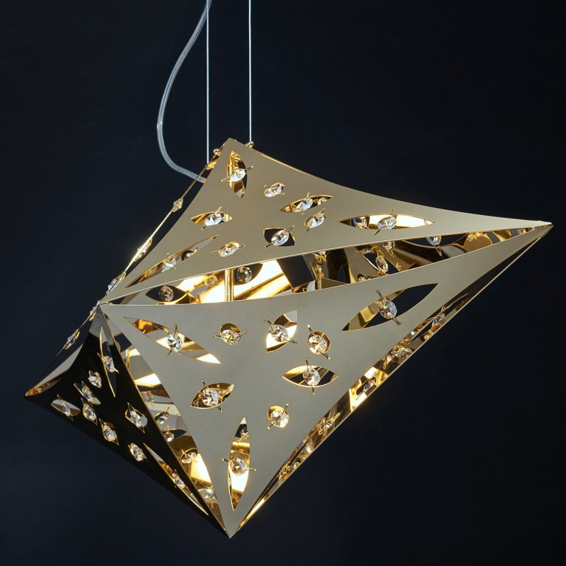 This chandelier is a contemporary statement piece. A stainless steel diamond-shaped element with a precious 24k gold cover features several holes that frame crystal octagons reflecting the light coming from underneath. Because our lightings are made by a workforce that still relies on traditional working methods, each product is unique and carries with it sensitivity of the artisan. Attract attention, provoke emotion to what the imagination with games of light and matter, such as the ambition and the creative spark of existing elements of the space. With the new service Interior Coaching, Alan Mizrahi provides interior Lighting advice at home. Recreate a warm atmosphere with a specified feel at your own home and have yourself assisted in the decoration of your project, by our team of interior experts. Our different services offer personal advice to answer to specific demands