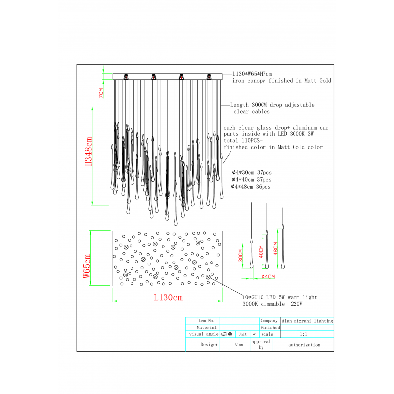 This magnificent chandelier will create a dramatic effect when placed either at the entrance of a house or in any room with a high ceiling. The imposing size of this piece is complemented by an ethereal aesthetic, an effect produced by hundreds of drop-like, mouth-blown Venetian elements cascading from the hand-made Nickel Metal Frame. The rediscovery of glass as a conductor of magical, rare light has pushed designers to define creation within a repertoire of ever-changing materials, making each piece an original work. At Alan Mizrahi Lighting Design, we supply and manufacture many highly sought-after designer pieces. All Chandeliers can be customized by a number of lights, styles, colors, and sizes to meet your specific needs. Every chandelier can also be combined with a matching table lamp and wall lamp to accomplish the best room design.