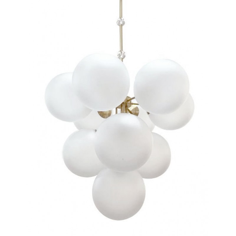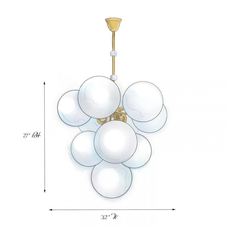 The Rufus white globe chandelier features a beautiful bouquet of glowing white glass globes, hovering delicately like balloons for a glass globe pendant light design. Satin brass finish creates warmth and style, along with dainty decorative white glass globes on the stem. This feminine and geometric lighting fixture is perfect for the maximalist at heart.