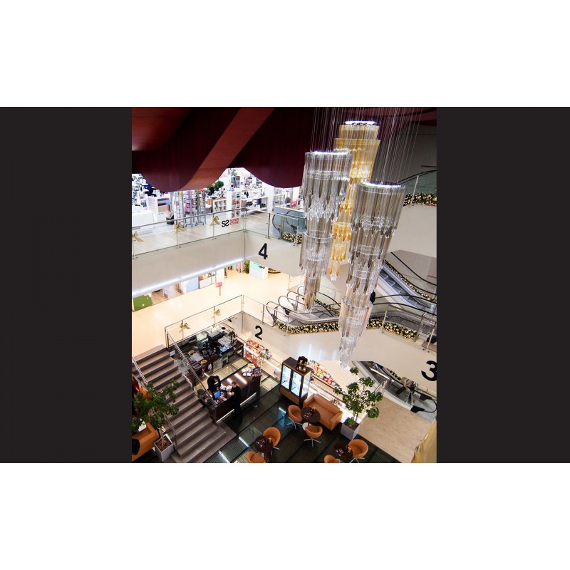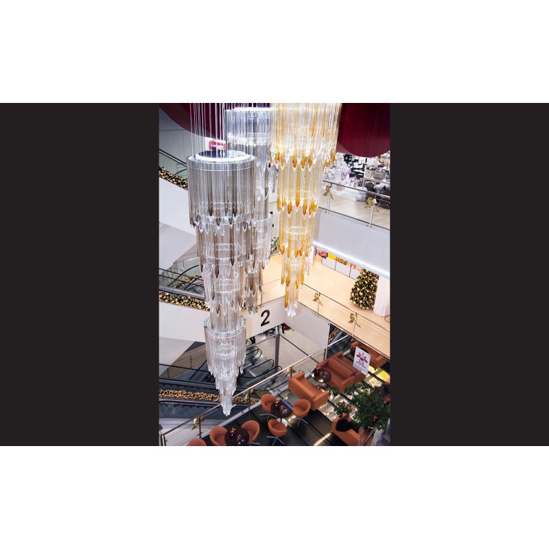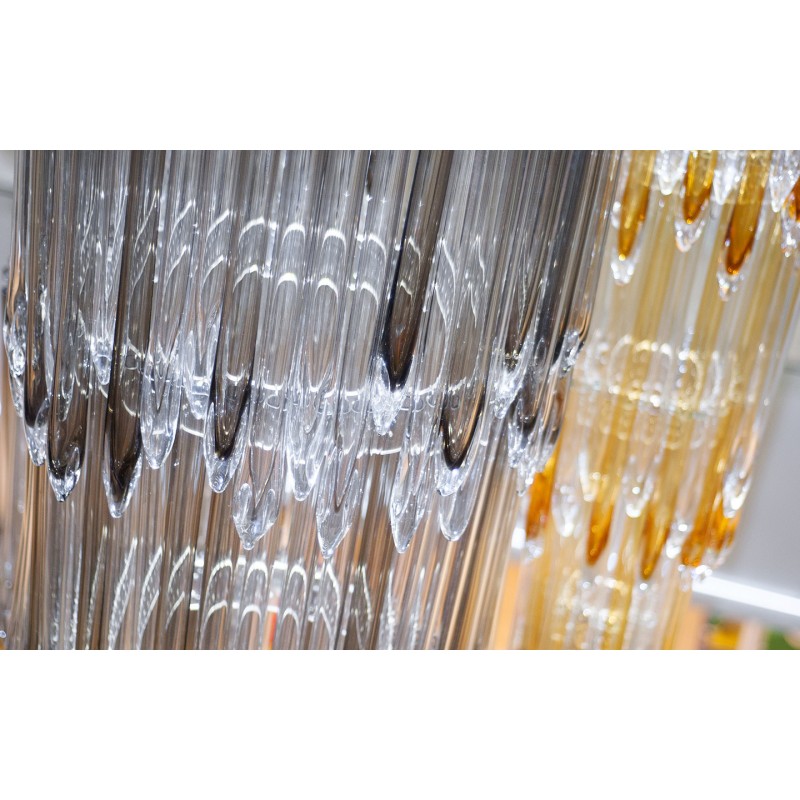 Extraordinary solitaires inspired with Scandinavian winters and nature, when water from the melting snow creates icefalls, artistic masterpieces. The Icefalls light design particularly recalls the majestic formation of icicles where frozen water melts, drips, and then fuses again together to create frozen sculptures – beautiful, natural works of art. The melting snow carries traces of soil and sand with it, which get trapped in the icicles and lend them subtle earth tints. When viewed from close and afar, the individual blown-­‐glass element of the Icefalls resemble melting ice on a winter day.